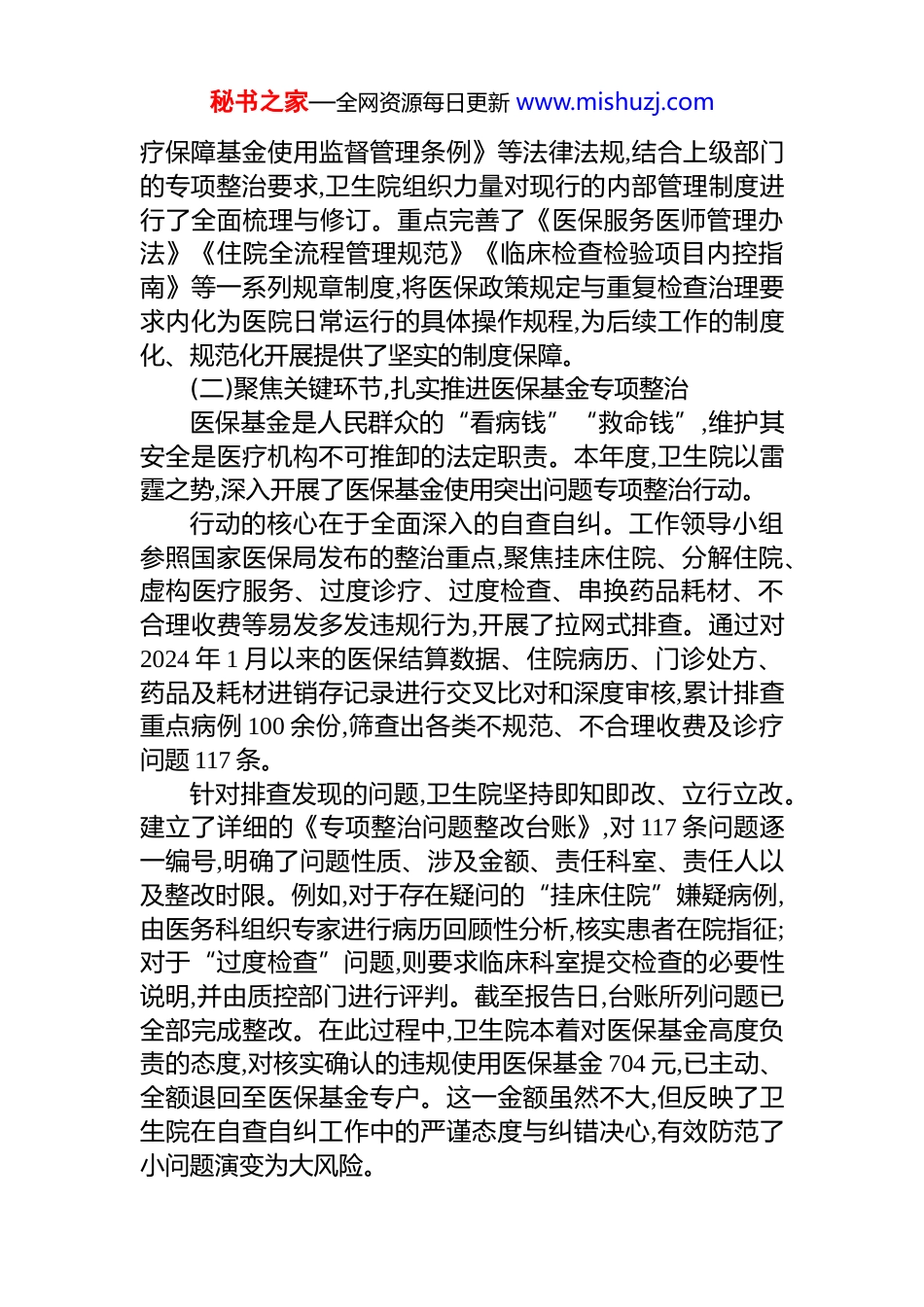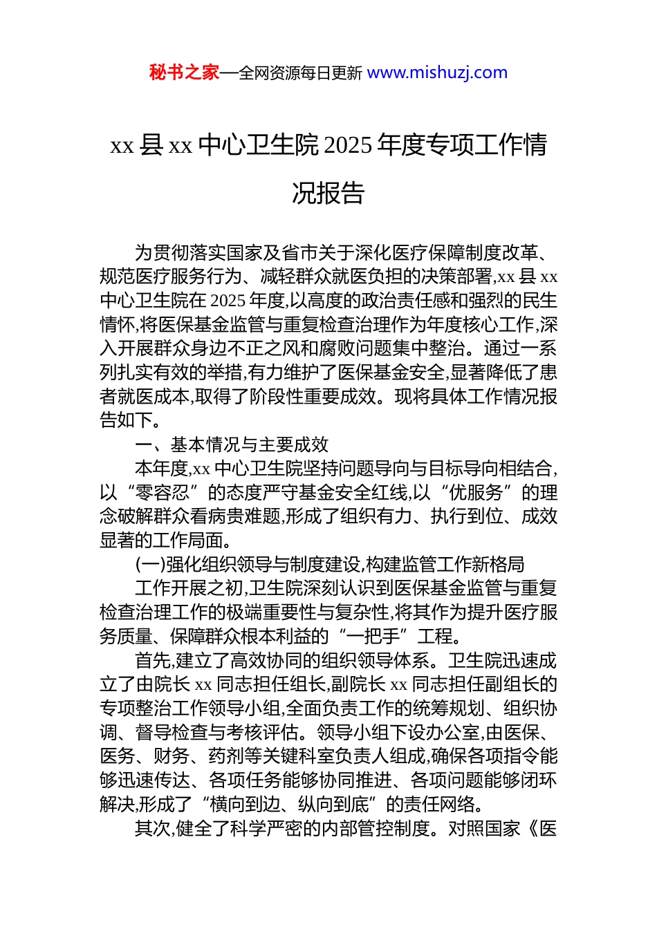 秘书之家—全网资源每日更新 www.mishuzj.comxx 县 xx 中心卫生院 2025 年度专项工作情况报告为贯彻落实国家及省市关于深化医疗保障制度改革、规范医疗服务行为、减轻群众就医负担的决策部署,xx 县 xx中心卫生院在 2025 年度,以高度的政治责任感和强烈的民生情怀,将医保基金监管与重复检查治理作为年度核心工作,深入开展群众身边不正之风和腐败问题集中整治。通过一系列扎实有效的举措,有力维护了医保基金安全,显著降低了患者就医成本,取得了阶段性重要成效。现将具体工作情况报告如下。一、基本情况与主要成效本年度,xx 中心卫生院坚持问题导向与目标导向相结合,以“零容忍”的态度严守基金安全红线,以“优服务”的理念破解群众看病贵难题,形成了组织有力、执行到位、成效显著的工作局面。(一)强化组织领导与制度建设,构建监管工作新格局工作开展之初,卫生院深刻认识到医保基金监管与重复检查治理工作的极端重要性与复杂性,将其作为提升医疗服务质量、保障群众根本利益的“一把手”工程。首先,建立了高效协同的组织领导体系。卫生院迅速成立了由院长 xx 同志担任组长,副院长 xx 同志担任副组长的专项整治工作领导小组,全面负责工作的统筹规划、组织协调、督导检查与考核评估。领导小组下设办公室,由医保、医务、财务、药剂等关键科室负责人组成,确保各项指令能够迅速传达、各项任务能够协同推进、各项问题能够闭环解决,形成了“横向到边、纵向到底”的责任网络。其次,健全了科学严密的内部管控制度。对照国家《医秘书之家—全网资源每日更新 www.mishuzj.com疗保障基金使用监督管理条例》等法律法规,结合上级部门的专项整治要求,卫生院组织力量对现行的内部管理制度进行了全面梳理与修订。重点完善了《医保服务医师管理办法》《住院全流程管理规范》《临床检查检验项目内控指南》等一系列规章制度,将医保政策规定与重复检查治理要求内化为医院日常运行的具体操作规程,为后续工作的制度化、规范化开展提供了坚实的制度保障。(二)聚焦关键环节,扎实推进医保基金专项整治医保基金是人民群众的“看病钱”“救命钱”,维护其安全是医疗机构不可推卸的法定职责。本年度,卫生院以雷霆之势,深入开展了医保基金使用突出问题专项整治行动。行动的核心在于全面深入的自查自纠。工作领导小组参照国家医保局发布的整治重点,聚焦挂床住院、分解住院、虚构医疗服务、过度诊疗、过度检查、串换药品耗材、不合理收费等易发多发违规行为,开展了拉网式排查。通过对2024 年 1 月以来的医保结算数据、住院病历、门诊处方、药品及耗材进销存记录进行交叉比对和深度审核,累计排查重点病例 100 余份,筛查出各类不规范、不合理收费及诊疗问题 117 条。针对排查发现的问题,卫生院坚持即知即改、立行立改。建立了详细的《专项整治问题整改台账》,对 117 条问题逐一编号,明确了问题性质、涉及金额、责任科室、责任人以及整改时限。例如,对于存在疑问的“挂床住院”嫌疑病例,由医务科组织专家进行病历回顾性分析,核实患者在院指征;对于“过度检查”问题,则要求临床科室提交检查的必要性说明,并由质控部门进行评判。截至报告日,台账所列问题已全部完成整改。在此过程中,卫生院本着对医保基金高度负责的态度,对核实确认的违规使用医保基金 704 元,已主动、全额退回至医保基金专户。这一金额虽然不大,但反映了卫生院在自查自纠工作中的严谨态度与纠错决心,有效防范了小问题演变为大风险。秘书之家—全网资源每日更新 www.mishuzj.com为巩固整治成效,卫生院着力构建长效监管机制。一方面,强化了常态化培训。定期组织全院医、药、护、技及管理人员,特别是新入职员工和辖区村卫生室负责人,进行医保政策、法律法规的专题培训和案例警示教育,累计培训覆盖300 余人次,确保医保政策要求深入人心。另一方面,建立了数据驱动的日常监控体系。设立专人专岗,建立了每月核查机制,利用信息化手段对医保结算数据进行动态监测与智能分析,重点关注次均费用、住院天数、药占比等异常指标,实现从“被动查处”向“主动发现”的转变,为守护群众的“救命钱”筑起了一道坚固防线。(三)落实互认制度,切实减轻群...