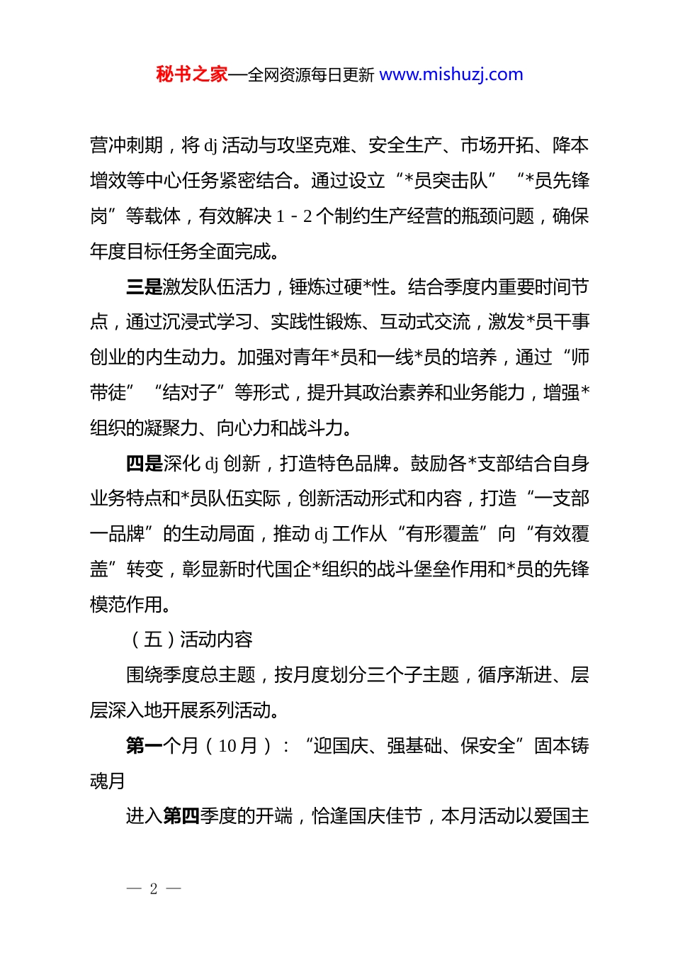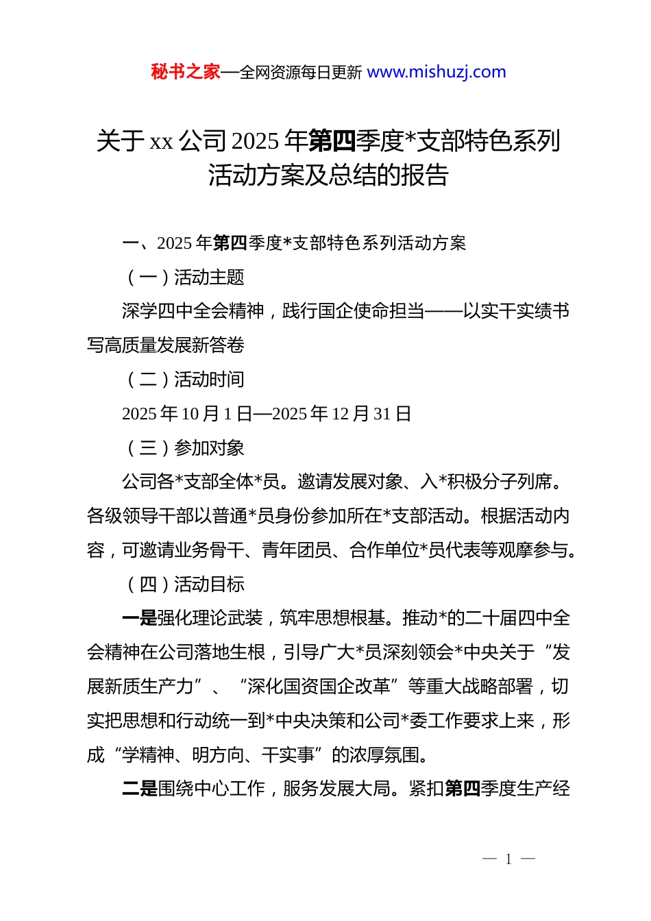 秘书之家—全网资源每日更新 www.mishuzj.com关于 xx 公司 2025 年第四季度*支部特色系列活动方案及总结的报告一、2025 年第四季度*支部特色系列活动方案(一)活动主题深学四中全会精神,践行国企使命担当——以实干实绩书写高质量发展新答卷(二)活动时间2025 年 10 月 1 日—2025 年 12 月 31 日(三)参加对象公司各*支部全体*员。邀请发展对象、入*积极分子列席。各级领导干部以普通*员身份参加所在*支部活动。根据活动内容,可邀请业务骨干、青年团员、合作单位*员代表等观摩参与。(四)活动目标一是强化理论武装,筑牢思想根基。推动*的二十届四中全会精神在公司落地生根,引导广大*员深刻领会*中央关于“发展新质生产力”、“深化国资国企改革”等重大战略部署,切实把思想和行动统一到*中央决策和公司*委工作要求上来,形成“学精神、明方向、干实事”的浓厚氛围。二是围绕中心工作,服务发展大局。紧扣第四季度生产经— 1 —秘书之家—全网资源每日更新 www.mishuzj.com营冲刺期,将 dj 活动与攻坚克难、安全生产、市场开拓、降本增效等中心任务紧密结合。通过设立“*员突击队”“*员先锋岗”等载体,有效解决 1-2 个制约生产经营的瓶颈问题,确保年度目标任务全面完成。三是激发队伍活力,锤炼过硬*性。结合季度内重要时间节点,通过沉浸式学习、实践性锻炼、互动式交流,激发*员干事创业的内生动力。加强对青年*员和一线*员的培养,通过“师带徒”“结对子”等形式,提升其政治素养和业务能力,增强*组织的凝聚力、向心力和战斗力。四是深化 dj 创新,打造特色品牌。鼓励各*支部结合自身业务特点和*员队伍实际,创新活动形式和内容,打造“一支部一品牌”的生动局面,推动 dj 工作从“有形覆盖”向“有效覆盖”转变,彰显新时代国企*组织的战斗堡垒作用和*员的先锋模范作用。(五)活动内容围绕季度总主题,按月度划分三个子主题,循序渐进、层层深入地开展系列活动。第一个月(10 月):“迎国庆、强基础、保安全”固本铸魂月进入第四季度的开端,恰逢国庆佳节,本月活动以爱国主— 2 —秘书之家—全网资源每日更新 www.mishuzj.com义教育为切入点,重点强化*员基础理论学习和安全生产意识,为季度冲刺筑牢思想和安全双重防线。一是开展“我与祖国共奋进”主题*日活动。各*支部在国庆节前后,组织一次主题鲜明的*日活动。内容可包括:组织*员观看爱国主义影片,如《xx 战役》等;开展“我与国旗同框”风采展示活动,分享个人与国家发展共成长的故事;组织参观 xx 市爱国主义教育基地,重温入*誓词,感悟革命先辈的奋斗精神。二是组织“*章*规在我心”知识竞赛。以*支部为单位,围绕《中国共产*章程》《中国共产 dj 律处分条例》等核心*内法规,组织线上或线下知识竞赛。通过以赛促学的方式,引导*员特别是青年*员、流动*员、劳务派遣制*员系统掌握应知应会的dj 基础知识,强化纪律规矩意识。三是启动“*员身边无事故”安全生产专项行动。结合公司作为 xx 制造行业的特点,以及第四季度生产任务繁重、易发安全事故的规律,在生产一线、重点项目工地设立“*员安全监督岗”,由经验丰富的老*员带领青年*员开展常态化安全巡查、隐患排查。组织一次全员安全生产专题培训,由*员技术骨干讲解 xx 设备操作规程和应急处置预案,营造“人人讲安全、事事为安全”的文化氛围。— 3 —秘书之家—全网资源每日更新 www.mishuzj.com第二个月(11 月):“学全会、明方向、促攻坚”对标看齐月本月是学习贯彻*的二十届四中全会精神的核心月份,活动重点在于深学细悟、统一思想,并将其转化为破解难题、推动工作的强大动力。一是原原本本学,组织“四中全会精神”专题学习周。公司*委层面,邀请 xx 省委*校教授作专题辅导报告,深度解码四中全会精神,特别是围绕“以中国式现代化夯实复兴根基”“增强核心功能、提升核心竞争力”等关键论述进行解读。各*支部利用“三会一课”、主题*日等形式,组织*员原原本本学习《中国共产*第二十届中央委员会第四次全体会议公报》等权威文件,并结合公司所处的先进制造与新能源领域,重点研讨“...