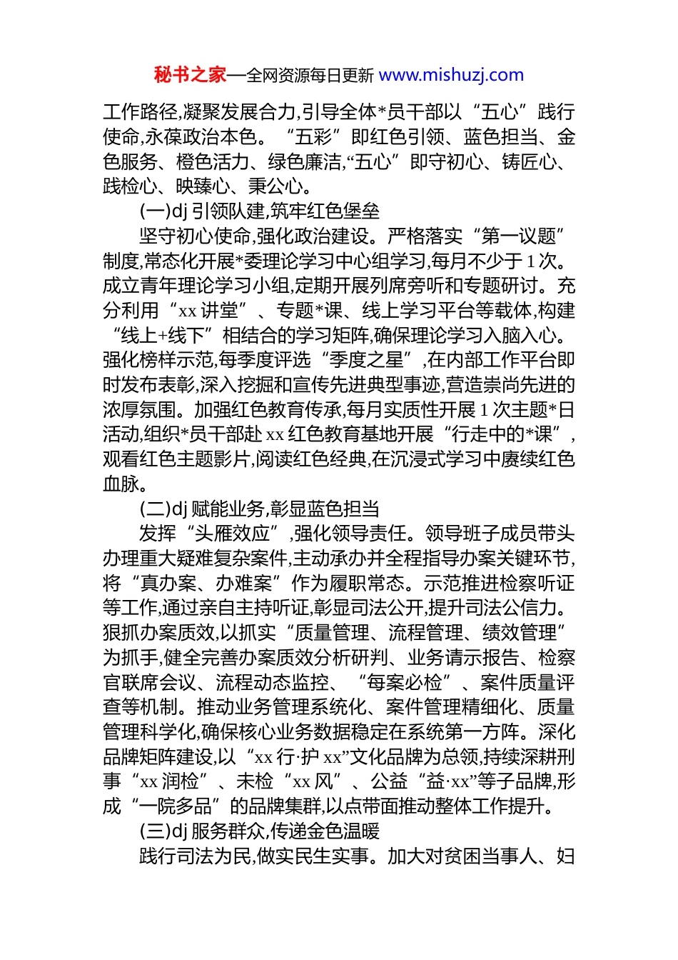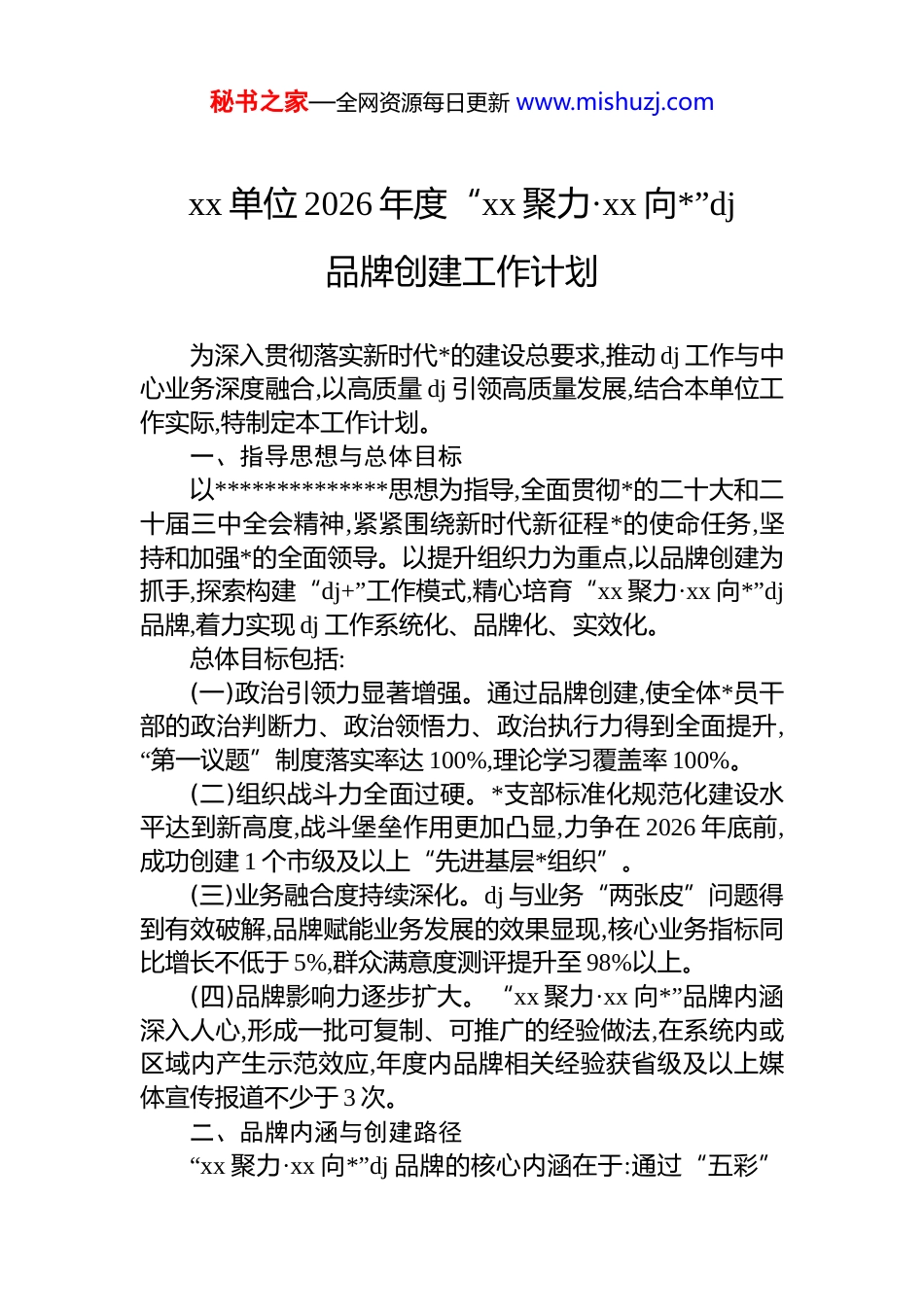 秘书之家—全网资源每日更新 www.mishuzj.comxx 单位 2026 年度“xx 聚力·xx 向*”dj品牌创建工作计划为深入贯彻落实新时代*的建设总要求,推动 dj 工作与中心业务深度融合,以高质量 dj 引领高质量发展,结合本单位工作实际,特制定本工作计划。一、指导思想与总体目标以**************思想为指导,全面贯彻*的二十大和二十届三中全会精神,紧紧围绕新时代新征程*的使命任务,坚持和加强*的全面领导。以提升组织力为重点,以品牌创建为抓手,探索构建“dj+”工作模式,精心培育“xx 聚力·xx 向*”dj品牌,着力实现 dj 工作系统化、品牌化、实效化。总体目标包括:(一)政治引领力显著增强。通过品牌创建,使全体*员干部的政治判断力、政治领悟力、政治执行力得到全面提升,“第一议题”制度落实率达 100%,理论学习覆盖率 100%。(二)组织战斗力全面过硬。*支部标准化规范化建设水平达到新高度,战斗堡垒作用更加凸显,力争在 2026 年底前,成功创建 1 个市级及以上“先进基层*组织”。(三)业务融合度持续深化。dj 与业务“两张皮”问题得到有效破解,品牌赋能业务发展的效果显现,核心业务指标同比增长不低于 5%,群众满意度测评提升至 98%以上。(四)品牌影响力逐步扩大。“xx 聚力·xx 向*”品牌内涵深入人心,形成一批可复制、可推广的经验做法,在系统内或区域内产生示范效应,年度内品牌相关经验获省级及以上媒体宣传报道不少于 3 次。二、品牌内涵与创建路径“xx 聚力·xx 向*”dj 品牌的核心内涵在于:通过“五彩”秘书之家—全网资源每日更新 www.mishuzj.com工作路径,凝聚发展合力,引导全体*员干部以“五心”践行使命,永葆政治本色。“五彩”即红色引领、蓝色担当、金色服务、橙色活力、绿色廉洁,“五心”即守初心、铸匠心、践检心、映臻心、秉公心。(一)dj 引领队建,筑牢红色堡垒坚守初心使命,强化政治建设。严格落实“第一议题”制度,常态化开展*委理论学习中心组学习,每月不少于 1 次。成立青年理论学习小组,定期开展列席旁听和专题研讨。充分利用“xx 讲堂”、专题*课、线上学习平台等载体,构建“线上+线下”相结合的学习矩阵,确保理论学习入脑入心。强化榜样示范,每季度评选“季度之星”,在内部工作平台即时发布表彰,深入挖掘和宣传先进典型事迹,营造崇尚先进的浓厚氛围。加强红色教育传承,每月实质性开展 1 次主题*日活动,组织*员干部赴 xx 红色教育基地开展“行走中的*课”,观看红色主题影片,阅读红色经典,在沉浸式学习中赓续红色血脉。(二)dj 赋能业务,彰显蓝色担当发挥“头雁效应”,强化领导责任。领导班子成员带头办理重大疑难复杂案件,主动承办并全程指导办案关键环节,将“真办案、办难案”作为履职常态。示范推进检察听证等工作,通过亲自主持听证,彰显司法公开,提升司法公信力。狠抓办案质效,以抓实“质量管理、流程管理、绩效管理”为抓手,健全完善办案质效分析研判、业务请示报告、检察官联席会议、流程动态监控、“每案必检”、案件质量评查等机制。推动业务管理系统化、案件管理精细化、质量管理科学化,确保核心业务数据稳定在系统第一方阵。深化品牌矩阵建设,以“xx 行·护 xx”文化品牌为总领,持续深耕刑事“xx 润检”、未检“xx 风”、公益“益·xx”等子品牌,形成“一院多品”的品牌集群,以点带面推动整体工作提升。(三)dj 服务群众,传递金色温暖践行司法为民,做实民生实事。加大对贫困当事人、妇秘书之家—全网资源每日更新 www.mishuzj.com女儿童等特殊群体的司法救助力度,年度发放司法救助金不少于 3 万元。常态化开展支持起诉工作,年度帮助不少于 10名农民工等弱势群体维护合法权益。聚焦新业态劳动者权益保护,开展专项法律监督。对校园食品安全、饮用水安全等领域开展公益诉讼专项监督,把民生实事办到群众心坎上。服务青少年健康成长,精选优秀*员组建普法讲师团,依托青少年法治教育基地,全年开展“法治进校园”、检察开放日、社区普法等活动不少于 20 场。围绕校园欺凌、未成年人吸烟等问题开展综合履职,推动区域内相关案件数量实现“双下降”。服务社区基层治理,严格落实在职*员“双报到、双服务”制度,联合结对社...
