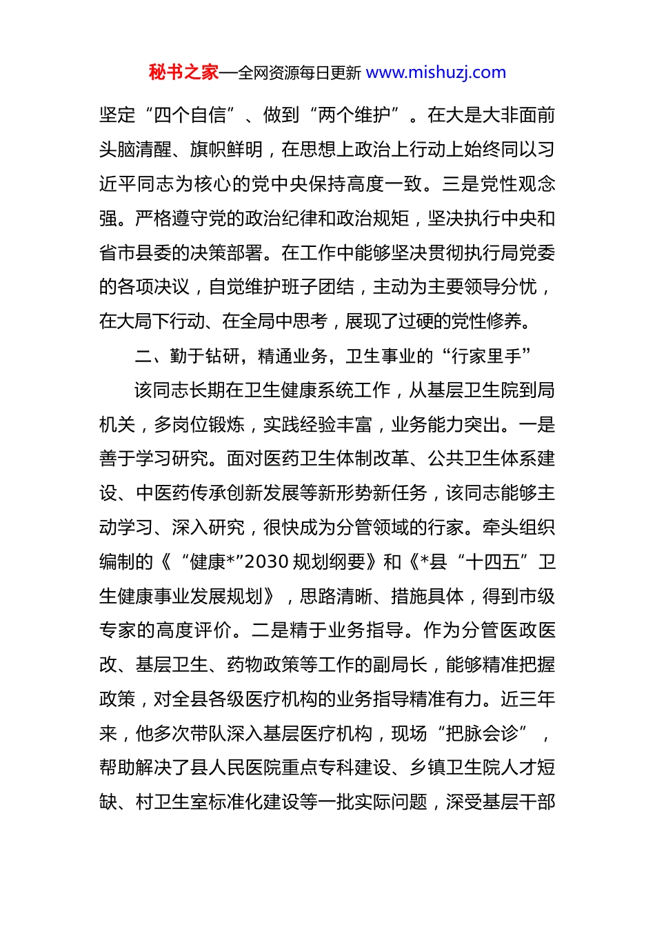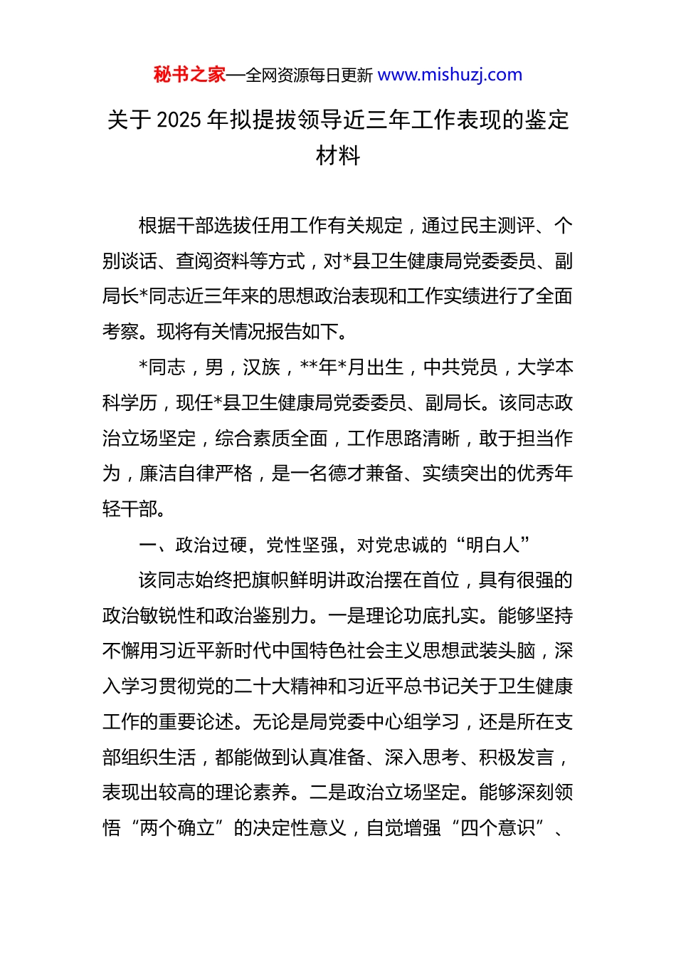 秘书之家—全网资源每日更新 www.mishuzj.com关于 2025 年拟提拔领导近三年工作表现的鉴定材料 根据干部选拔任用工作有关规定,通过民主测评、个别谈话、查阅资料等方式,对*县卫生健康局党委委员、副局长*同志近三年来的思想政治表现和工作实绩进行了全面考察。现将有关情况报告如下。*同志,男,汉族,**年*月出生,中共党员,大学本科学历,现任*县卫生健康局党委委员、副局长。该同志政治立场坚定,综合素质全面,工作思路清晰,敢于担当作为,廉洁自律严格,是一名德才兼备、实绩突出的优秀年轻干部。一、政治过硬,党性坚强,对党忠诚的“明白人”该同志始终把旗帜鲜明讲政治摆在首位,具有很强的政治敏锐性和政治鉴别力。一是理论功底扎实。能够坚持不懈用习近平新时代中国特色社会主义思想武装头脑,深入学习贯彻党的二十大精神和习近平总书记关于卫生健康工作的重要论述。无论是局党委中心组学习,还是所在支部组织生活,都能做到认真准备、深入思考、积极发言,表现出较高的理论素养。二是政治立场坚定。能够深刻领悟“两个确立”的决定性意义,自觉增强“四个意识”、秘书之家—全网资源每日更新 www.mishuzj.com坚定“四个自信”、做到“两个维护”。在大是大非面前头脑清醒、旗帜鲜明,在思想上政治上行动上始终同以习近平同志为核心的党中央保持高度一致。三是党性观念强。严格遵守党的政治纪律和政治规矩,坚决执行中央和省市县委的决策部署。在工作中能够坚决贯彻执行局党委的各项决议,自觉维护班子团结,主动为主要领导分忧,在大局下行动、在全局中思考,展现了过硬的党性修养。二、勤于钻研,精通业务,卫生事业的“行家里手”该同志长期在卫生健康系统工作,从基层卫生院到局机关,多岗位锻炼,实践经验丰富,业务能力突出。一是善于学习研究。面对医药卫生体制改革、公共卫生体系建设、中医药传承创新发展等新形势新任务,该同志能够主动学习、深入研究,很快成为分管领域的行家。牵头组织编制的《“健康*”2030 规划纲要》和《*县“十四五”卫生健康事业发展规划》,思路清晰、措施具体,得到市级专家的高度评价。二是精于业务指导。作为分管医政医改、基层卫生、药物政策等工作的副局长,能够精准把握政策,对全县各级医疗机构的业务指导精准有力。近三年来,他多次带队深入基层医疗机构,现场“把脉会诊”,帮助解决了县人民医院重点专科建设、乡镇卫生院人才短缺、村卫生室标准化建设等一批实际问题,深受基层干部秘书之家—全网资源每日更新 www.mishuzj.com职工好评。三是勇于改革创新。面对深化医改的“硬骨头”,该同志不等不靠,主动作为。在他的积极推动下,我县在全市率先探索建立了紧密型县域医共体,通过“县管乡用、乡聘村用”等方式,有效盘活了全县医疗人才资源,促进了优质医疗资源下沉,相关经验做法被市卫健委发文推广。三、担当实干,业绩突出,人民健康的“守护者”该同志事业心和责任感强,工作充满激情,始终保持着奋发有为的精神状态,在急难险重任务面前豁得出来、顶得上去。一是疫情防控中显担当。在过去三年的疫情防控工作中,该同志作为县疫情防控指挥部办公室分管日常工作的副主任,始终冲锋在前。无论是组织大规模核酸检测、调度流调溯源队伍,还是协调医疗救治资源、部署疫苗接种工作,他都身先士卒、靠前指挥,经常连续数周吃住在单位。因长时间高负荷工作,曾两次累倒在工作岗位上,用实际行动诠释了一名共产党员的责任与担当。二是推动发展中见实绩。分管工作成效显著。近三年来,在他的努力下,我县成功创建国家级卫生县城;县人民医院胸痛中心、卒中中心通过省级验收,医疗服务能力大幅提升;全县所有乡镇卫生院和村卫生室均达到标准化建设要求,基层医疗卫生服务网底进一步筑牢;基本药物制度得秘书之家—全网资源每日更新 www.mishuzj.com到全面落实,群众看病就医负担有效减轻。这些成绩的取得,都凝聚了他的心血和汗水。三是服务群众中见真情。始终把人民群众的健康放在心中最高位置。他牵头组织实施的“家庭医生签约服务提质增效”工程,让全县超过30%的常住人口拥有了自己的家庭医生,重点人群签约服务覆...