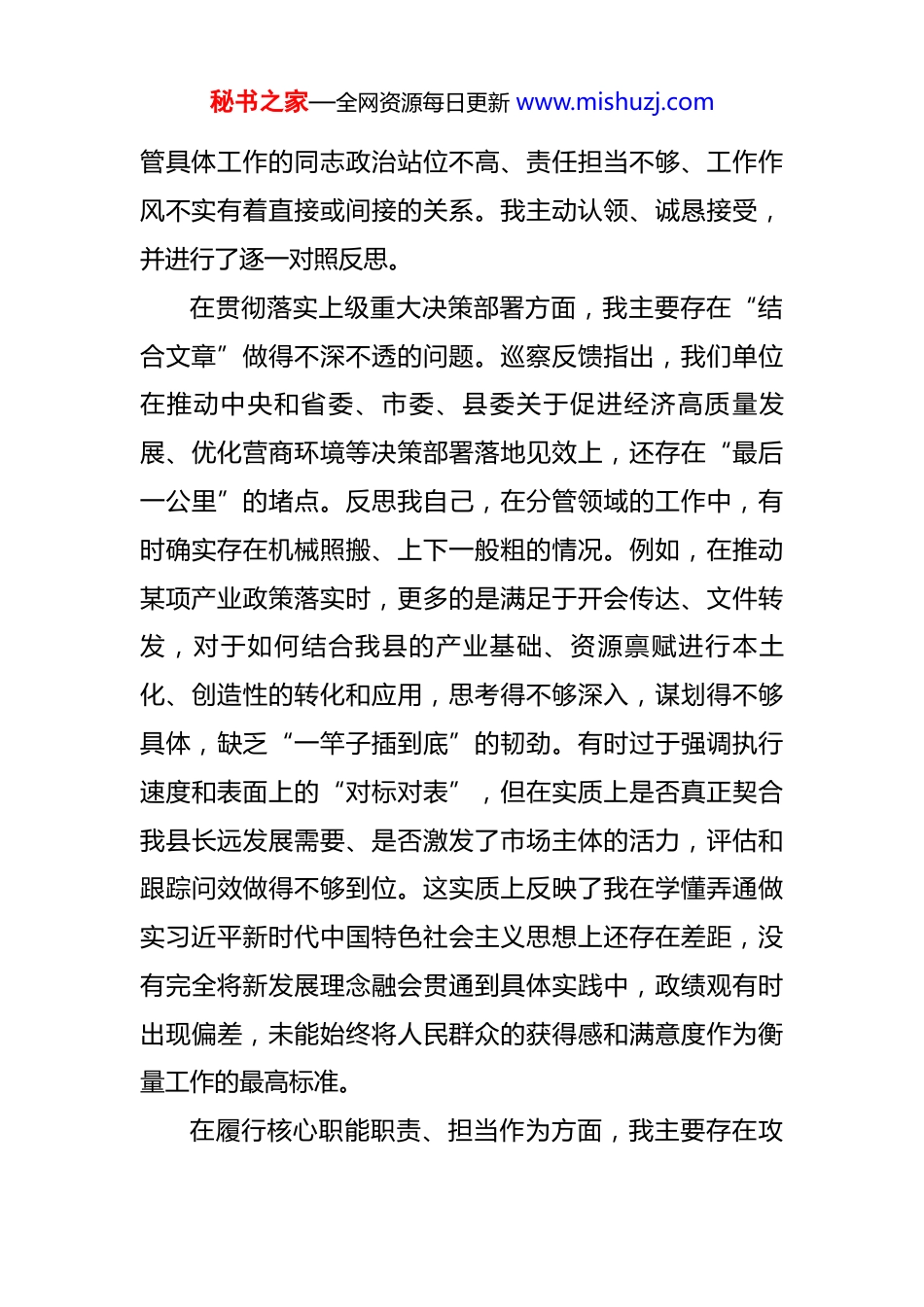 秘书之家—全网资源每日更新 www.mishuzj.com关于县委第一巡察组反馈意见整改专题民主生活会的个人对照检查材料 尊敬的党组织,各位同志:根据县委关于巡察整改工作的统一部署和本次专题民主生活会的要求,我在会前深入学习了习近平新时代中国特色社会主义思想、党的二十大精神以及习近平总书记关于巡视工作的重要论述,认真研读了《县委第一巡察组关于对*单位开展常规巡察的反馈意见》,并与班子成员、分管部门负责同志和基层党员群众广泛开展了谈心谈话,主动征求了意见建议。在此基础上,我紧密联系个人的思想、工作、作风和能力实际,紧扣巡察反馈指出的问题,进行了深刻的自我剖析和反思。现将个人对照检查情况汇报如下,恳请同志们批评指正。一、对照巡察反馈意见,深入查摆自身存在的突出问题巡察是政治体检,整改是政治任务。县委第一巡察组的反馈意见,客观中肯、切中要害,犹如一面镜子,让我清醒地看到了自身存在的差距和不足。我深刻认识到,反馈意见中指出的单位存在的问题,虽然表现在工作上、反映在面上,但根子在于我们领导干部,特别是与我这个分秘书之家—全网资源每日更新 www.mishuzj.com管具体工作的同志政治站位不高、责任担当不够、工作作风不实有着直接或间接的关系。我主动认领、诚恳接受,并进行了逐一对照反思。在贯彻落实上级重大决策部署方面,我主要存在“结合文章”做得不深不透的问题。巡察反馈指出,我们单位在推动中央和省委、市委、县委关于促进经济高质量发展、优化营商环境等决策部署落地见效上,还存在“最后一公里”的堵点。反思我自己,在分管领域的工作中,有时确实存在机械照搬、上下一般粗的情况。例如,在推动某项产业政策落实时,更多的是满足于开会传达、文件转发,对于如何结合我县的产业基础、资源禀赋进行本土化、创造性的转化和应用,思考得不够深入,谋划得不够具体,缺乏“一竿子插到底”的韧劲。有时过于强调执行速度和表面上的“对标对表”,但在实质上是否真正契合我县长远发展需要、是否激发了市场主体的活力,评估和跟踪问效做得不够到位。这实质上反映了我在学懂弄通做实习近平新时代中国特色社会主义思想上还存在差距,没有完全将新发展理念融会贯通到具体实践中,政绩观有时出现偏差,未能始终将人民群众的获得感和满意度作为衡量工作的最高标准。在履行核心职能职责、担当作为方面,我主要存在攻秘书之家—全网资源每日更新 www.mishuzj.com坚克难的锐气有所减退的问题。巡察反馈提到,单位在破解一些历史遗留难题和应对新形势下的风险挑战上,力度有待加强。扪心自问,面对分管领域内一些长期存在的“硬骨头”,比如某个领域的改革深化问题,或是某个久拖未决的信访积案,我有时会产生畏难情绪和“等一等、看一看”的想法,缺乏“敢啃硬骨头、敢涉险滩”的决心和勇气。习惯于用常规思路和传统办法去解决问题,对于运用新理念、新机制破解难题,主动性不强,探索不够。在推动一些重点工作时,开局部署很用力,但在过程中遇到阻力或瓶颈时,持续跟进、一抓到底的狠劲稍显不足,导致有些工作效果未能达到预期。这暴露出我的斗争精神和担当精神有所弱化,在新时代新征程上,那种“逢山开路、遇水架桥”的开拓意识需要进一步激发,履职尽责的“铁肩膀”需要锤炼得更加硬实。在整治形式主义、官僚主义等作风顽疾方面,我主要存在调查研究“浮在面上”的问题。巡察反馈也委婉地指出了我们工作中存在一定的形式主义现象。对照自身,我深感惭愧。虽然经常下基层,但有时“走马观花”多,“下马看花”少。调研行程安排得满满当当,但真正沉下心来、带着问题、与基层干部群众面对面深入交流、倾听他们原汁原味心声的时间并不多。有时调研成了“被调秘书之家—全网资源每日更新 www.mishuzj.com研”,路线、点位、人员都是事先安排好的,看到的多是“盆景”,听到的多是“赞歌”,对真实情况的掌握不够全面、不够立体。这就导致一些决策和措施有时与基层实际贴合不够紧密,针对性、操作性不强,甚至无形中增加了基层的负担。例如,之前推动的一项便民服务措施,初衷很好,但在设计时对基层的操作复杂性和群众的使用习惯考...