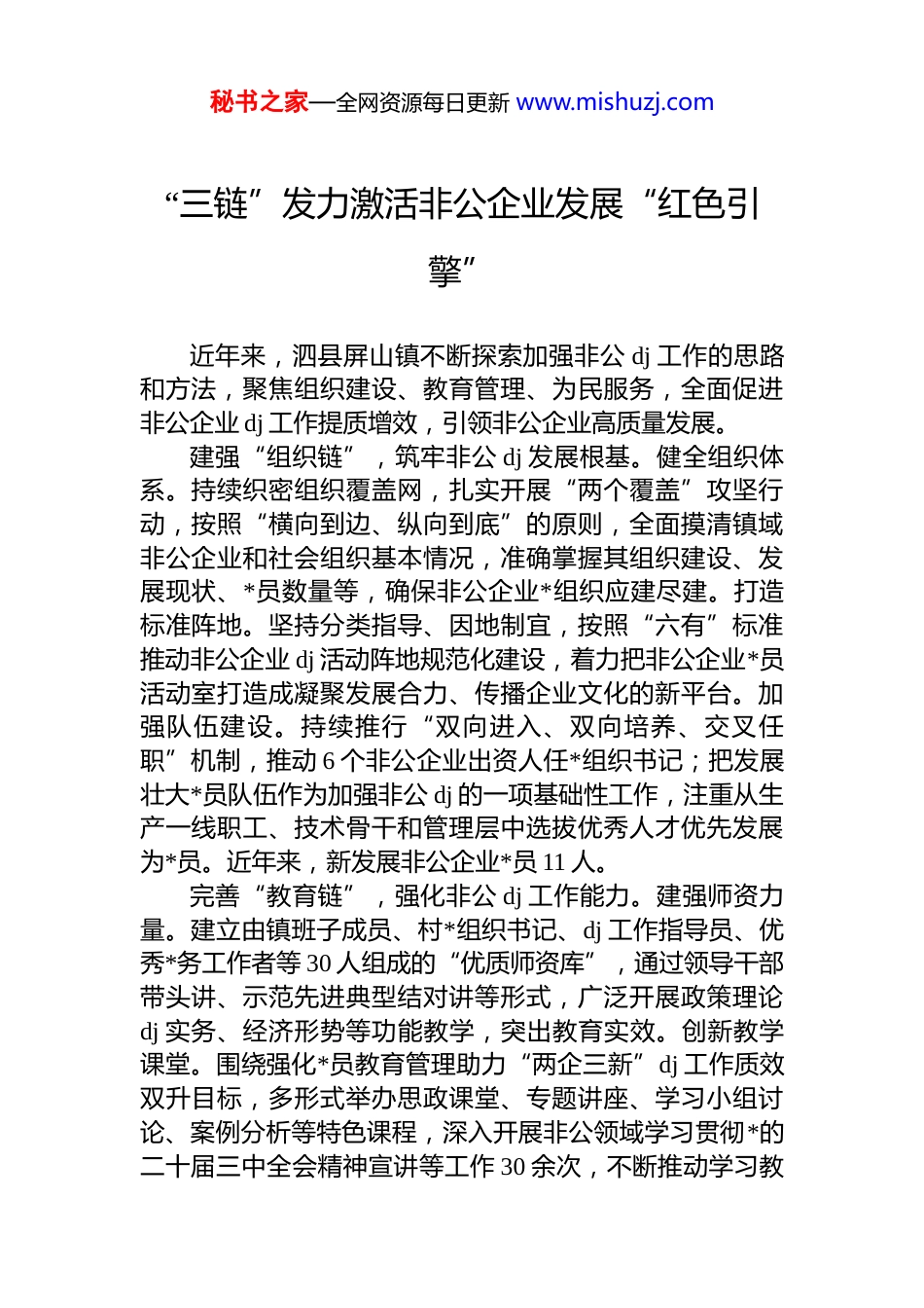 秘书之家—全网资源每日更新 www.mishuzj.com“三链”发力激活非公企业发展“红色引擎”近年来,泗县屏山镇不断探索加强非公 dj 工作的思路和方法,聚焦组织建设、教育管理、为民服务,全面促进非公企业 dj 工作提质增效,引领非公企业高质量发展。建强“组织链”,筑牢非公 dj 发展根基。健全组织体系。持续织密组织覆盖网,扎实开展“两个覆盖”攻坚行动,按照“横向到边、纵向到底”的原则,全面摸清镇域非公企业和社会组织基本情况,准确掌握其组织建设、发展现状、*员数量等,确保非公企业*组织应建尽建。打造标准阵地。坚持分类指导、因地制宜,按照“六有”标准推动非公企业 dj 活动阵地规范化建设,着力把非公企业*员活动室打造成凝聚发展合力、传播企业文化的新平台。加强队伍建设。持续推行“双向进入、双向培养、交叉任职”机制,推动 6 个非公企业出资人任*组织书记;把发展壮大*员队伍作为加强非公 dj 的一项基础性工作,注重从生产一线职工、技术骨干和管理层中选拔优秀人才优先发展为*员。近年来,新发展非公企业*员 11 人。完善“教育链”,强化非公 dj 工作能力。建强师资力量。建立由镇班子成员、村*组织书记、dj 工作指导员、优秀*务工作者等 30 人组成的“优质师资库”,通过领导干部带头讲、示范先进典型结对讲等形式,广泛开展政策理论dj 实务、经济形势等功能教学,突出教育实效。创新教学课堂。围绕强化*员教育管理助力“两企三新”dj 工作质效双升目标,多形式举办思政课堂、专题讲座、学习小组讨论、案例分析等特色课程,深入开展非公领域学习贯彻*的二十届三中全会精神宣讲等工作 30 余次,不断推动学习教秘书之家—全网资源每日更新 www.mishuzj.com育走深走实。拓展教育成果。充分利用主题*日活动、支部大会及“企呼政应”常态化联系走访等契机,聚焦*员教育管理和产业转型升级两大教学重点,指导企业把学习贯彻*的创新理论和生产经营工作中遇到的实际问题结合起来,切实将*员教育培训成果转化为生产发展动力。拓展“服务链”,提升非公 dj 活动质效。抓实志愿服务。引导非公企业*组织在服务中心工作中发挥作用,组织非公企业*组织*员开展“*员先锋岗”“业务标兵岗”等*员示范活动,在安全生产、文明创建、暖民心等重点工作中亮身份、作表率、践承诺,引导*员立足本职岗位创优争先。解决企业难题。推动非公*组织*员与企业负责人、企业职工谈心谈话,详细了解企业生产经营情况、职工工作生活保障情况等,广泛收集企业反映的问题,及时反馈并寻求相关部门帮扶,切实帮助企业纾困解难。助力乡村振兴。建立“dj+村企联建”工作机制,推动以非公 dj 引领非公企业帮扶乡村教育、文化、卫生等社会事业发展,先后组织 20 余家非公企业资助困难大学生、慰问困难*员群众等,捐赠粮油、衣被、医药物资等累计 100 余万元,以实际行动凝聚起全社会共同参与乡村振兴的强大合力。