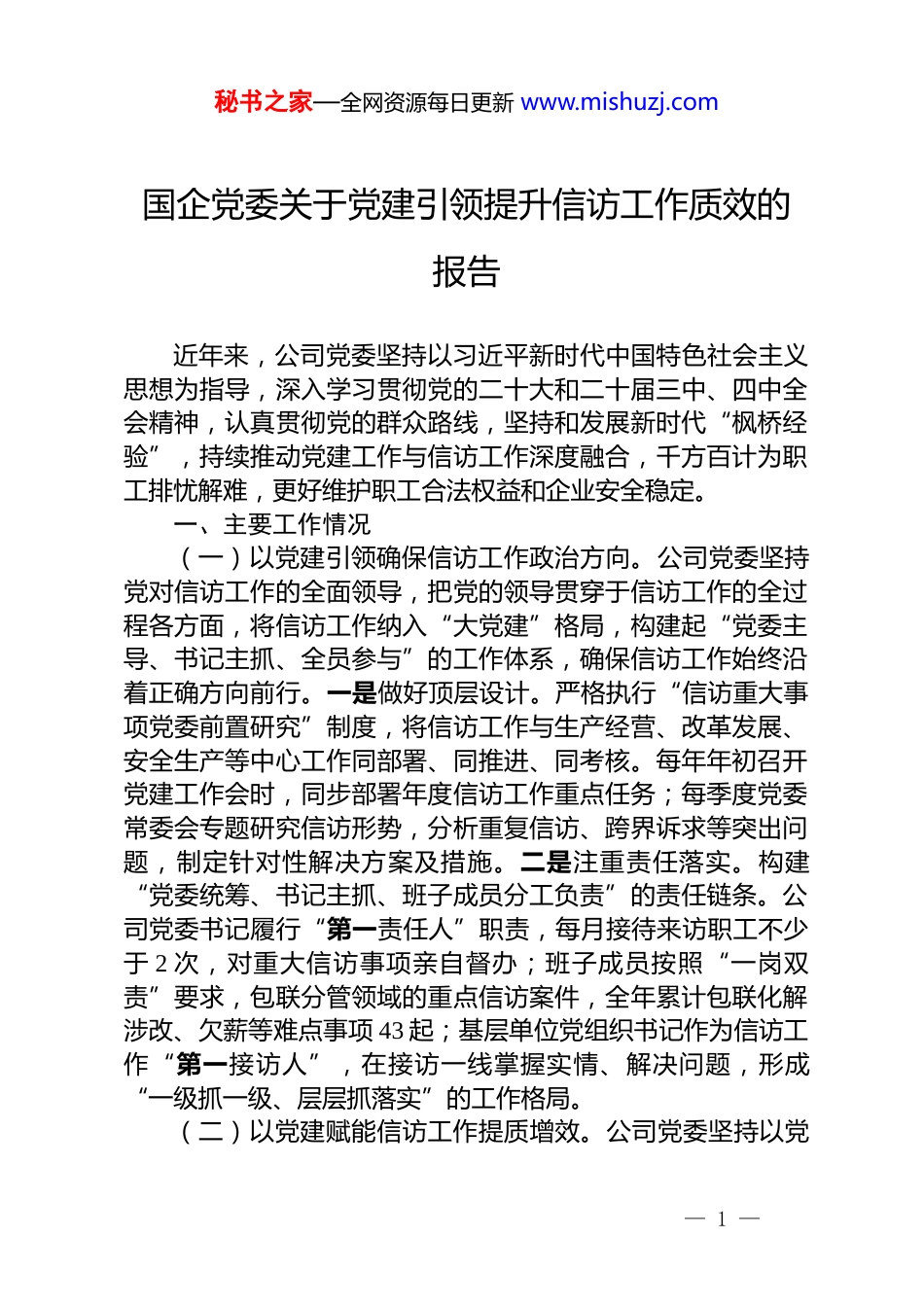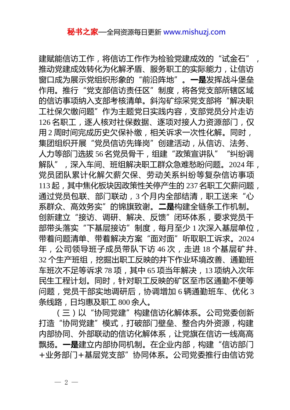 秘书之家—全网资源每日更新 www.mishuzj.com国企党委关于党建引领提升信访工作质效的报告近年来,公司党委坚持以习近平新时代中国特色社会主义思想为指导,深入学习贯彻党的二十大和二十届三中、四中全会精神,认真贯彻党的群众路线,坚持和发展新时代“枫桥经验”,持续推动党建工作与信访工作深度融合,千方百计为职工排忧解难,更好维护职工合法权益和企业安全稳定。一、主要工作情况(一)以党建引领确保信访工作政治方向。公司党委坚持党对信访工作的全面领导,把党的领导贯穿于信访工作的全过程各方面,将信访工作纳入“大党建”格局,构建起“党委主导、书记主抓、全员参与”的工作体系,确保信访工作始终沿着正确方向前行。一是做好顶层设计。严格执行“信访重大事项党委前置研究”制度,将信访工作与生产经营、改革发展、安全生产等中心工作同部署、同推进、同考核。每年年初召开党建工作会时,同步部署年度信访工作重点任务;每季度党委常委会专题研究信访形势,分析重复信访、跨界诉求等突出问题,制定针对性解决方案及措施。二是注重责任落实。构建“党委统筹、书记主抓、班子成员分工负责”的责任链条。公司党委书记履行“第一责任人”职责,每月接待来访职工不少于 2 次,对重大信访事项亲自督办;班子成员按照“一岗双责”要求,包联分管领域的重点信访案件,全年累计包联化解涉改、欠薪等难点事项 43 起;基层单位党组织书记作为信访工作“第一接访人”,在接访一线掌握实情、解决问题,形成“一级抓一级、层层抓落实”的工作格局。(二)以党建赋能信访工作提质增效。公司党委坚持以党— 1 —秘书之家—全网资源每日更新 www.mishuzj.com建赋能信访工作,将信访工作作为检验党建成效的“试金石”,推动党建成效转化为化解矛盾、服务职工的实际能力,让信访窗口成为展示党组织形象的“前沿阵地”。一是发挥战斗堡垒作用。推行“党支部信访责任区”制度,将各党支部所辖区域的信访事项纳入支部考核清单。斜沟矿综采党支部将“解决职工社保欠缴问题”作为主题党日实践内容,支部党员分片走访126 名职工,逐人核对社保数据、逐项对接人力资源部门,仅用 2 周时间完成历史欠保补缴,相关诉求一次性化解。同时,集团组织开展“党员信访先锋岗”创建活动,从信访、法务、人力等部门选拔 56 名党员骨干,组建“政策宣讲队”“纠纷调解队”,深入车间、班组解决职工群众急难愁盼问题。2024 年,党员团队累计化解欠薪欠保、劳动关系纠纷等复杂信访事项113 起,其中焦化板块因政策性关停产生的 237 名职工欠薪问题,通过党员包联、部门联动,3 个月内全部结清,职工送来“心系群众、高效务实”的锦旗致谢。二是构建全链条工作机制。创新建立“接访、调研、解决、反馈”闭环体系,要求党员干部带头落实“下基层接访”制度,每月至少 1 次深入基层单位,带着问题清单、带着解决方案“面对面”听取职工诉求。2024年,公司领导班子成员带队下访 46 次,走进 18 个基层矿井、32 个生产班组,挖掘出职工反映的井下作业环境改善、通勤班车班次不足等诉求 78 项,其中 65 项当年解决,13 项纳入次年民生工程计划。同时,针对职工反映的矿区至市区通勤不便等问题,党员干部实地调研后,协调增加 6 辆通勤班车、优化 3条线路,日均惠及职工 800 余人。(三)以“协同党建”构建信访化解体系。公司党委创新打造“协同党建”模式,打破部门壁垒、整合内外资源,构建内部协同、外部联动的信访化解体系,让党旗在信访一线高高飘扬。一是建立内部协同机制。在企业内部,构建“信访部门+业务部门+基层党支部”协同体系。公司党委推行由信访党— 2 —秘书之家—全网资源每日更新 www.mishuzj.com支部党员与责任部门党员共同包联“双包案”制度,对涉及多部门的复杂信访事项,明确“一名包案领导、一个工作专班、一套解决方案、一个办结时限”。2024 年,8 起跨部门信访案件全部通过“双包案”机制实现突破,其中“退休职工医保待遇衔接”问题涉及人力资源、社保、财务等 5 个部门,包案党员牵头召开 12 次协调会,最终出台《退休职工医保接续流...