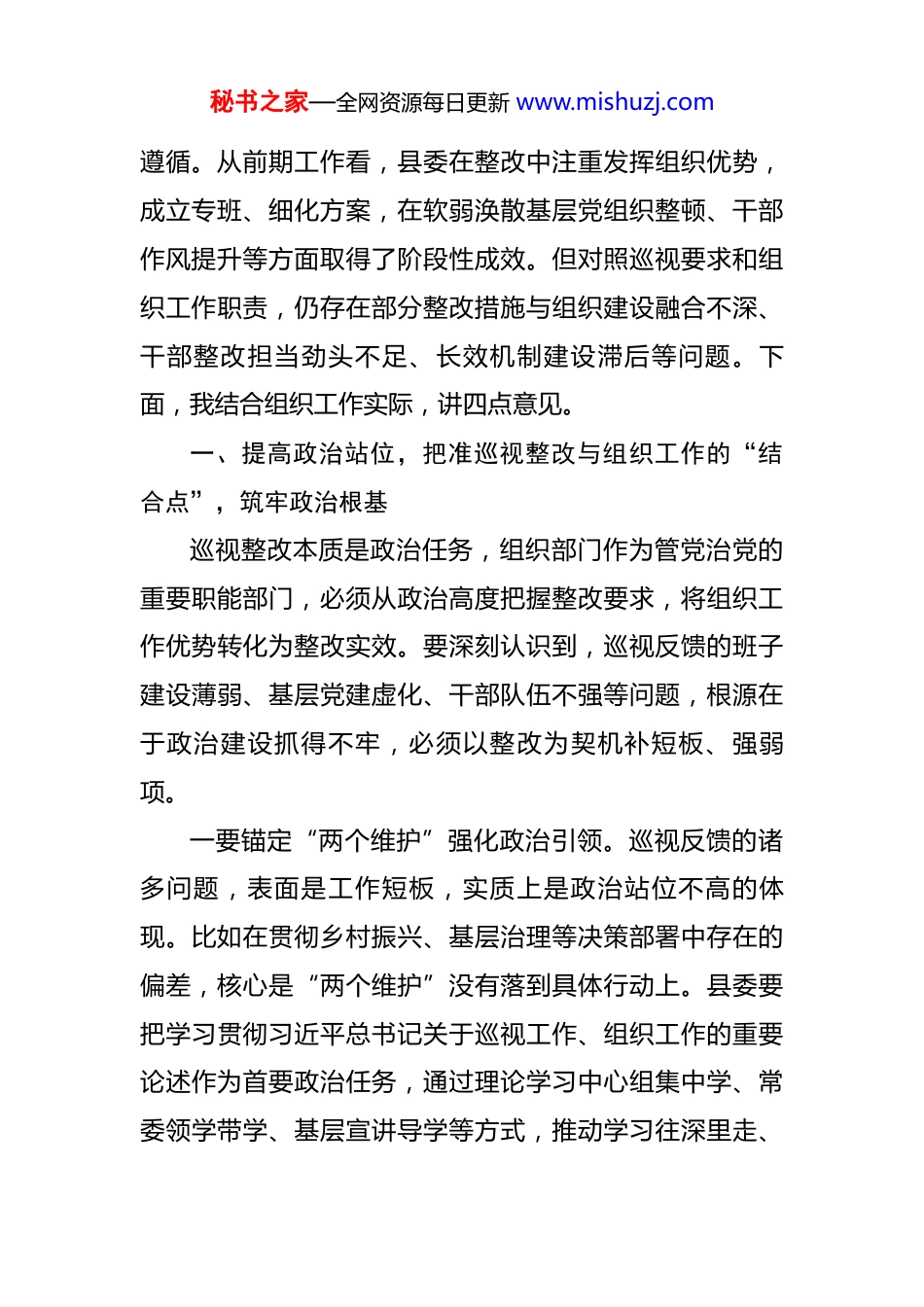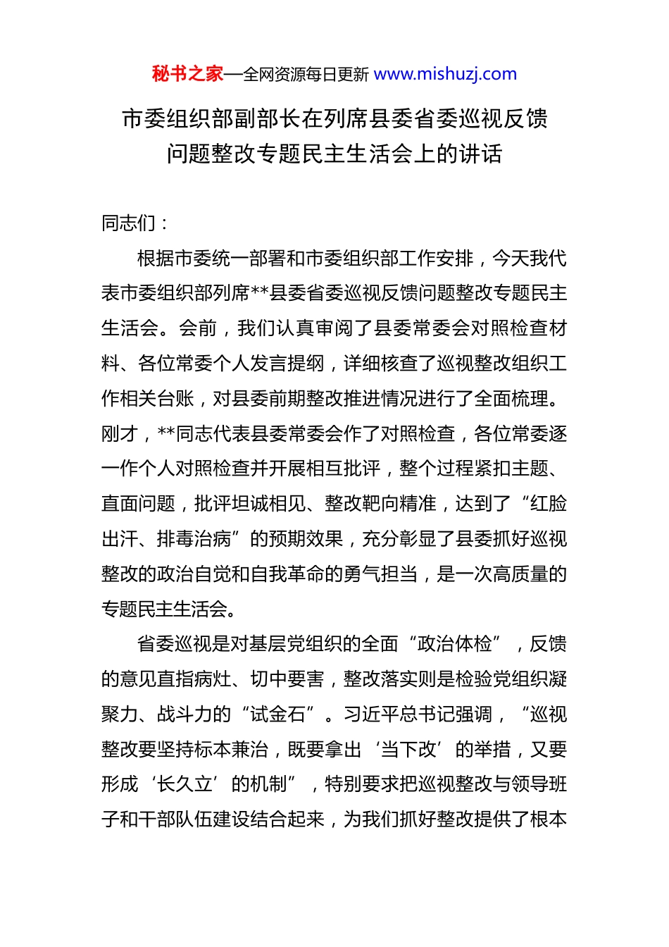 秘书之家—全网资源每日更新 www.mishuzj.com市委组织部副部长在列席县委省委巡视反馈问题整改专题民主生活会上的讲话 同志们:根据市委统一部署和市委组织部工作安排,今天我代表市委组织部列席**县委省委巡视反馈问题整改专题民主生活会。会前,我们认真审阅了县委常委会对照检查材料、各位常委个人发言提纲,详细核查了巡视整改组织工作相关台账,对县委前期整改推进情况进行了全面梳理。刚才,**同志代表县委常委会作了对照检查,各位常委逐一作个人对照检查并开展相互批评,整个过程紧扣主题、直面问题,批评坦诚相见、整改靶向精准,达到了“红脸出汗、排毒治病”的预期效果,充分彰显了县委抓好巡视整改的政治自觉和自我革命的勇气担当,是一次高质量的专题民主生活会。省委巡视是对基层党组织的全面“政治体检”,反馈的意见直指病灶、切中要害,整改落实则是检验党组织凝聚力、战斗力的“试金石”。习近平总书记强调,“巡视整改要坚持标本兼治,既要拿出‘当下改’的举措,又要形成‘长久立’的机制”,特别要求把巡视整改与领导班子和干部队伍建设结合起来,为我们抓好整改提供了根本秘书之家—全网资源每日更新 www.mishuzj.com遵循。从前期工作看,县委在整改中注重发挥组织优势,成立专班、细化方案,在软弱涣散基层党组织整顿、干部作风提升等方面取得了阶段性成效。但对照巡视要求和组织工作职责,仍存在部分整改措施与组织建设融合不深、干部整改担当劲头不足、长效机制建设滞后等问题。下面,我结合组织工作实际,讲四点意见。一、提高政治站位,把准巡视整改与组织工作的“结合点”,筑牢政治根基巡视整改本质是政治任务,组织部门作为管党治党的重要职能部门,必须从政治高度把握整改要求,将组织工作优势转化为整改实效。要深刻认识到,巡视反馈的班子建设薄弱、基层党建虚化、干部队伍不强等问题,根源在于政治建设抓得不牢,必须以整改为契机补短板、强弱项。一要锚定“两个维护”强化政治引领。巡视反馈的诸多问题,表面是工作短板,实质上是政治站位不高的体现。比如在贯彻乡村振兴、基层治理等决策部署中存在的偏差,核心是“两个维护”没有落到具体行动上。县委要把学习贯彻习近平总书记关于巡视工作、组织工作的重要论述作为首要政治任务,通过理论学习中心组集中学、常委领学带学、基层宣讲导学等方式,推动学习往深里走、秘书之家—全网资源每日更新 www.mishuzj.com往实里走。要把整改成效作为检验政治忠诚度的重要标尺,将整改要求融入民主集中制执行、党内政治生活基本规范等具体工作,切实把思想和行动统一到党中央决策部署上来。二要聚焦“人民至上”夯实政治立场。巡视反馈的民生领域问题,背后往往是基层党组织服务能力不足、干部宗旨意识淡化的问题。县委常委班子作为“关键少数”,要带头践行“我为群众办实事”长效机制,把整改与基层党组织“为民服务解难题”结合起来。针对老旧小区改造、农村饮水安全等群众急难愁盼问题,要推动常委包联、支部攻坚、党员带头,建立“群众点单、支部接单、党员办单、群众评单”闭环机制。要把群众满意度作为整改成效的核心指标,通过入户走访、民意调查等方式跟踪问效,让群众切实感受到整改带来的新变化。三要紧扣“管党治党”压实政治责任。从巡视情况看,**县在基层党组织建设、干部监督管理等方面仍有薄弱环节,这警示我们全面从严治党永远在路上。县委要切实扛起整改主体责任,县委书记履行第一责任人责任,各位常委落实“一岗双责”,把整改责任与组织工作责任同部署、同推进、同考核。要建立“党委抓总、组织牵头、部门协同、基层落实”的整改责任体系,将整改任务细化秘书之家—全网资源每日更新 www.mishuzj.com到具体党组织和责任人,形成一级抓一级、层层抓落实的整改格局。二、坚持问题导向,聚焦组织领域整改的“发力点”,确保整改见效巡视反馈的问题中,涉及组织领域的班子建设、干部队伍、基层党建等问题是整改的重中之重。要坚持靶向施治、精准发力,既解决表面问题,更深挖根源症结,推动组织领域问题真改实改、全面整改。一要建强领导班子“核心引擎”。针对巡视指出的班子整体...