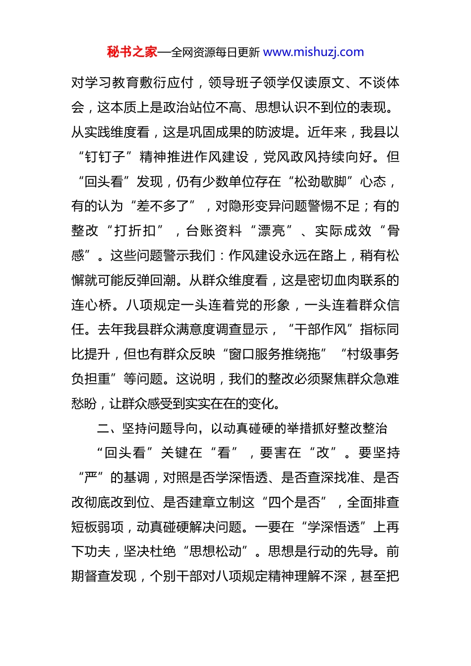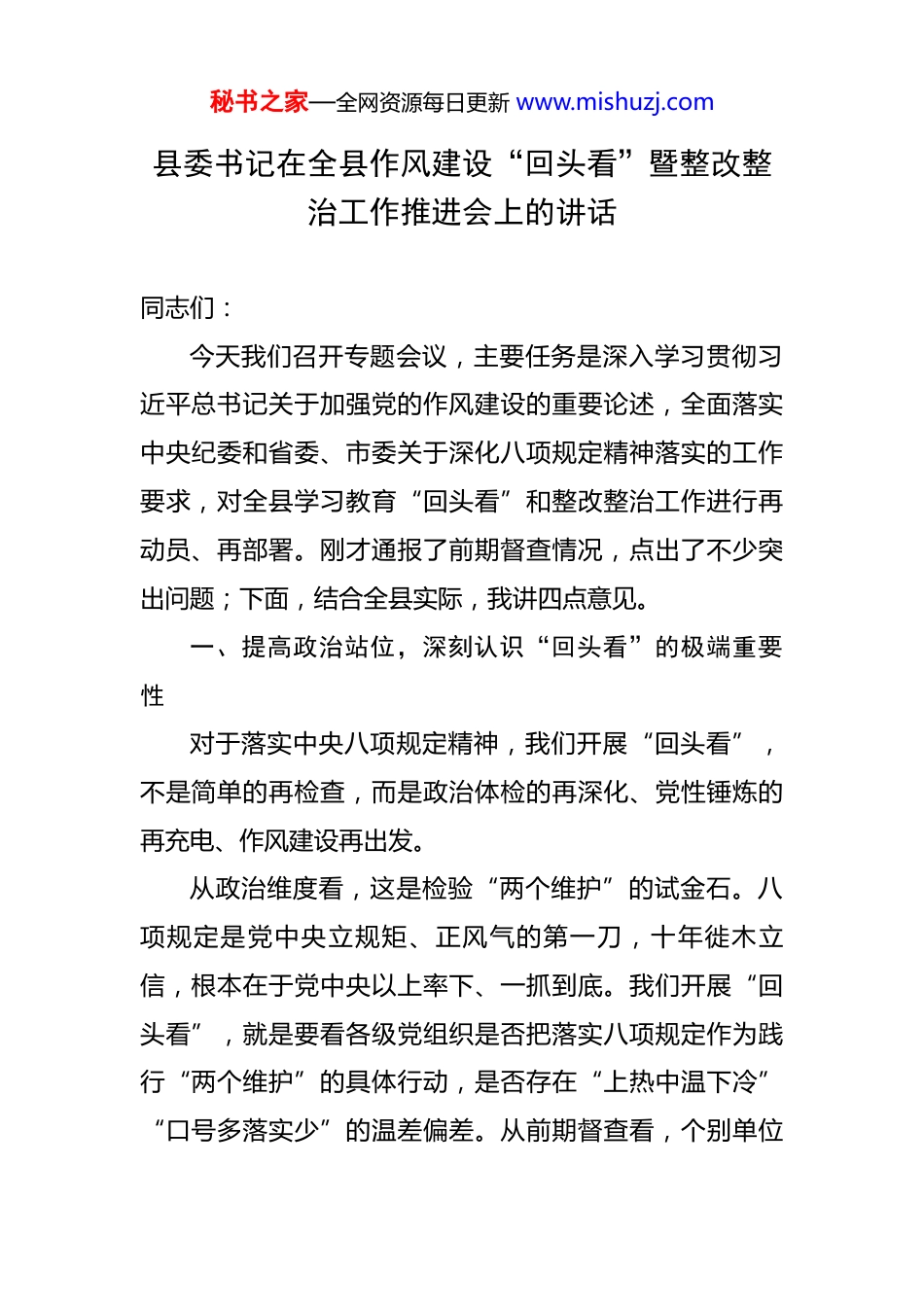 秘书之家—全网资源每日更新 www.mishuzj.com县委书记在全县作风建设“回头看”暨整改整治工作推进会上的讲话 同志们:今天我们召开专题会议,主要任务是深入学习贯彻习近平总书记关于加强党的作风建设的重要论述,全面落实中央纪委和省委、市委关于深化八项规定精神落实的工作要求,对全县学习教育“回头看”和整改整治工作进行再动员、再部署。刚才通报了前期督查情况,点出了不少突出问题;下面,结合全县实际,我讲四点意见。一、提高政治站位,深刻认识“回头看”的极端重要性对于落实中央八项规定精神,我们开展“回头看”,不是简单的再检查,而是政治体检的再深化、党性锤炼的再充电、作风建设再出发。从政治维度看,这是检验“两个维护”的试金石。八项规定是党中央立规矩、正风气的第一刀,十年徙木立信,根本在于党中央以上率下、一抓到底。我们开展“回头看”,就是要看各级党组织是否把落实八项规定作为践行“两个维护”的具体行动,是否存在“上热中温下冷”“口号多落实少”的温差偏差。从前期督查看,个别单位秘书之家—全网资源每日更新 www.mishuzj.com对学习教育敷衍应付,领导班子领学仅读原文、不谈体会,这本质上是政治站位不高、思想认识不到位的表现。从实践维度看,这是巩固成果的防波堤。近年来,我县以“钉钉子”精神推进作风建设,党风政风持续向好。但“回头看”发现,仍有少数单位存在“松劲歇脚”心态,有的认为“差不多了”,对隐形变异问题警惕不足;有的整改“打折扣”,台账资料“ 漂亮”、实际成效“骨感”。这些问题警示我们:作风建设永远在路上,稍有松懈就可能反弹回潮。从群众维度看,这是密切血肉联系的连心桥。八项规定一头连着党的形象,一头连着群众信任。去年我县群众满意度调查显示,“干部作风”指标同比提升,但也有群众反映“窗口服务推绕拖”“村级事务负担重”等问题。这说明,我们的整改必须聚焦群众急难愁盼,让群众感受到实实在在的变化。二、坚持问题导向,以动真碰硬的举措抓好整改整治“回头看”关键在“看”,要害在“改”。要坚持“严”的基调,对照是否学深悟透、是否查深找准、是否改彻底改到位、是否建章立制这“四个是否”,全面排查短板弱项,动真碰硬解决问题。一要在“学深悟透”上再下功夫,坚决杜绝“思想松动”。思想是行动的先导。前期督查发现,个别干部对八项规定精神理解不深,甚至把秘书之家—全网资源每日更新 www.mishuzj.com“人情往来”当作违规收礼的借口。要以“第一议题”制度为抓手,结合主题教育,重新组织八项规定精神专题学习,特别是要学深悟透习近平总书记关于加强作风建设的重要论述,真正把“严”的要求刻进思想深处。二要在“查深找准”上再下功夫,坚决防止“问题反弹”。从信访举报和督查情况看,三类问题仍较突出:一是违规吃喝隐形变异,有的转移到内部食堂、农家乐,甚至“不吃公款吃老板”;二是形式主义屡禁不止,有的以“留痕”代替“留绩”,搞“指尖上的负担”;三是特权思想暗流涌动,个别干部把“官架子”当“威信”,对待群众态度冷漠。对这些“旧病新变种”,必须深挖背后的责任链条,既查直接责任人,也查领导责任、“一岗双责”。三要在“改彻底改到位”上再下功夫,坚决避免“纸面落实”。整改不能“头痛医头”,要实行“清单化+销号制”管理。对查摆出的问题,能立即改的要“不过夜”,需长期改的要明确“时间表”“路线图”。特别要针对群众反映强烈的“窗口服务效率低”“村级会议多报表多”等问题,开展专项整治,让群众看到变化、得到实惠。三、强化系统施治,构建常态长效的作风建设机制作风建设必须把“当下改”与“长久立”结合起来,从根本上铲除“四风”滋生土壤。一要以制度刚性管根秘书之家—全网资源每日更新 www.mishuzj.com本。针对督查发现的漏洞,要抓紧修订《公务接待管理办法》《差旅费报销细则》等制度,特别是要严控“电子红包”“快递送礼”等新型违纪行为,让制度“长牙带电”。二要以数字赋能提效能。运用信息化手段,构建“智慧监督”体系:建设“四风”问题监测平台,整合财政支付、公务用车等数据,对异常情况自动预警;推行“作...