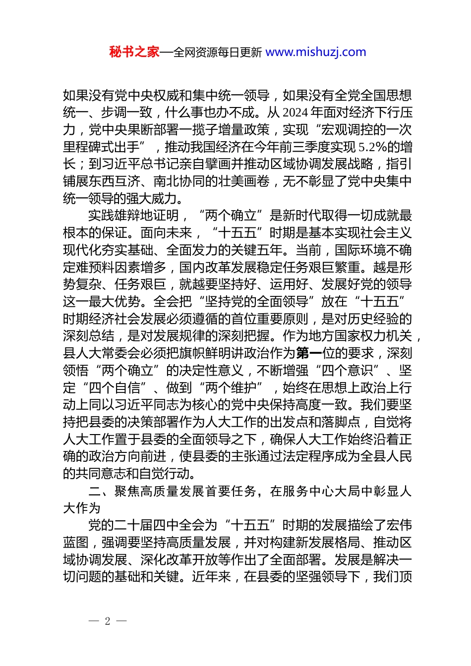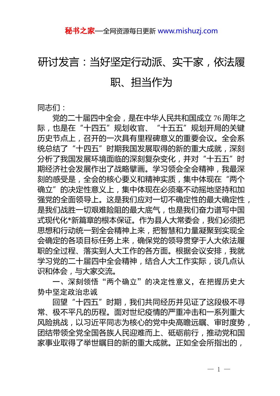 秘书之家—全网资源每日更新 www.mishuzj.com研讨发言:当好坚定行动派、实干家,依法履职、担当作为同志们:党的二十届四中全会,是在中华人民共和国成立 76 周年之际,也是在“十四五”规划收官、“十五五”规划开局的关键历史节点上,召开的一次具有里程碑意义的重要会议。全会系统总结了“十四五”时期我国发展取得的新的重大成就,深刻分析了我国发展环境面临的深刻复杂变化,并对“十五五”时期经济社会发展作出了战略擘画。学习领会全会精神,我最深刻的感受是,全会的核心要义和精神实质,集中体现在“两个确立”的决定性意义上,集中体现在必须毫不动摇地坚持和加强党的全面领导上。这是我们应对一切不确定性的最大确定性,是我们战胜一切艰难险阻的最大底气,也是我们奋力谱写中国式现代化*新篇章的根本保证。作为县人大常委会,我们必须把思想和行动统一到全会精神上来,把智慧和力量凝聚到实现全会确定的各项目标任务上来,确保党的领导贯穿于人大依法履职的全过程、落实到人大工作的各方面。根据会议安排,我就学习党的二十届四中全会精神,结合人大工作实际,谈几点认识和体会,与大家交流。一、深刻领悟“两个确立”的决定性意义,在把握历史大势中坚定政治忠诚回望“十四五”时期,我们共同经历并见证了这段极不寻常、极不平凡的历程。面对世纪疫情的严重冲击和一系列重大风险挑战,以习近平同志为核心的党中央高瞻远瞩、审时度势,团结带领全党全国各族人民迎难而上、砥砺前行,推动党和国家事业取得了举世瞩目的新的重大成就。正如全会所指出的,— 1 —秘书之家—全网资源每日更新 www.mishuzj.com如果没有党中央权威和集中统一领导,如果没有全党全国思想统一、步调一致,什么事也办不成。从 2024 年面对经济下行压力,党中央果断部署一揽子增量政策,实现“宏观调控的一次里程碑式出手”,推动我国经济在今年前三季度实现 5.2%的增长;到习近平总书记亲自擘画并推动区域协调发展战略,指引铺展东西互济、南北协同的壮美画卷,无不彰显了党中央集中统一领导的强大威力。实践雄辩地证明,“两个确立”是新时代取得一切成就最根本的保证。面向未来,“十五五”时期是基本实现社会主义现代化夯实基础、全面发力的关键五年。当前,国际环境不确定难预料因素增多,国内改革发展稳定任务艰巨繁重。越是形势复杂、任务艰巨,就越要坚持好、运用好、发展好党的领导这一最大优势。全会把“坚持党的全面领导”放在“十五五”时期经济社会发展必须遵循的首位重要原则,是对历史经验的深刻总结,是对发展规律的深刻把握。作为地方国家权力机关,县人大常委会必须把旗帜鲜明讲政治作为第一位的要求,深刻领悟“两个确立”的决定性意义,不断增强“四个意识”、坚定“四个自信”、做到“两个维护”,始终在思想上政治上行动上同以习近平同志为核心的党中央保持高度一致。我们要坚持把县委的决策部署作为人大工作的出发点和落脚点,自觉将人大工作置于县委的全面领导之下,确保人大工作始终沿着正确的政治方向前进,使县委的主张通过法定程序成为全县人民的共同意志和自觉行动。二、聚焦高质量发展首要任务,在服务中心大局中彰显人大作为党的二十届四中全会为“十五五”时期的发展描绘了宏伟蓝图,强调要坚持高质量发展,并对构建新发展格局、推动区域协调发展、深化改革开放等作出了全面部署。发展是解决一切问题的基础和关键。近年来,在县委的坚强领导下,我们顶— 2 —秘书之家—全网资源每日更新 www.mishuzj.com住压力、克难奋进,全县经济社会发展保持了稳中有进的良好态势。2024 年,全县地区生产总值历史性突破 500 亿元大关,三次产业结构持续优化。进入 2025 年,全县经济持续回升向好态势,前三季度,一般公共预算收入同比增长 8.5%,固定资产投资同比增长 9.2%,常住人口城镇化率达到 61.2%,一系列主要宏观指标印证了*发展的韧性和活力。这些成绩的取得,正是我们坚持党的全面领导,一张蓝图绘到底,一任接着一任干的结果。人大工作只有紧扣中心、服务大局,才能找准定位、有所作为。我们将紧紧围绕全会精神和县委贯彻落实的具体部署,找...