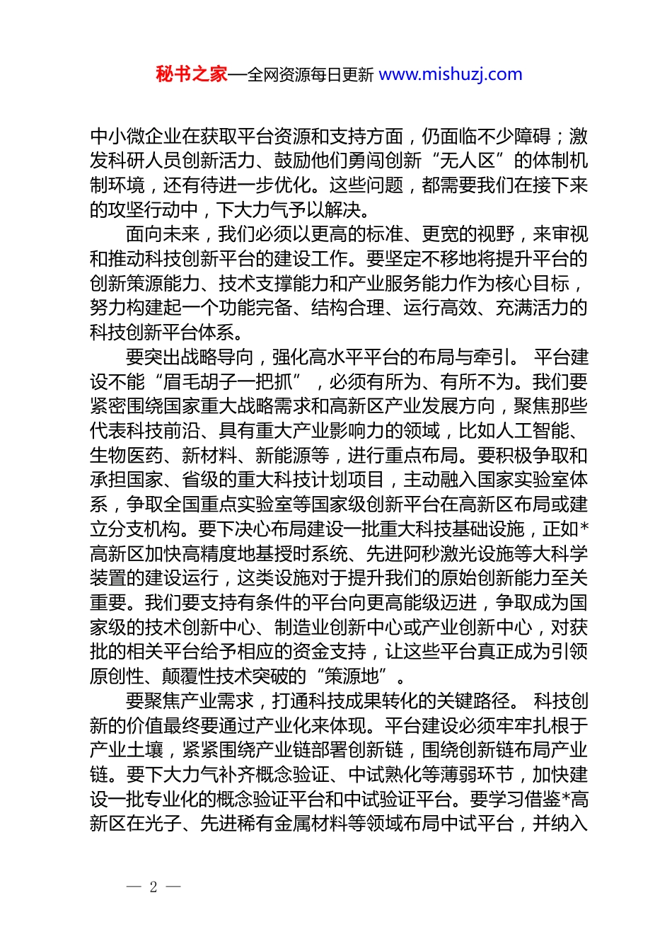 秘书之家—全网资源每日更新 www.mishuzj.com在 2025 年高新区科技创新平台建设攻坚推进会上的讲话今天我们召开这次攻坚推进会,目的非常明确,就是要聚焦科技创新平台建设这一关系高新区长远发展的核心议题,凝聚共识、明确方向、部署任务,以更大的决心、更实的举措,全力推动高新区科技创新平台建设实现新突破、迈上新台阶。科技创新平台是集聚创新资源、组织创新活动、转化创新成果的重要载体,其建设水平直接决定了我们区域创新体系的质量和效能,关乎我们能否在新一轮科技革命和产业变革中抢占先机、赢得主动。当前,我们正处在推动高质量发展、构建现代化产业体系的关键时期,抓好科技创新平台建设,意义尤为重大,任务十分紧迫。我们必须清醒地认识到,科技创新平台建设绝非一朝一夕之功,更不能满足于数量的堆砌和形式的铺陈。它需要我们以战略眼光进行系统谋划,以工匠精神进行精耕细作,更需要我们具备打破常规、勇于探索的改革勇气。近年来,我们在这方面投入了大量精力,也取得了一系列积极进展,一批高能级的研发机构、转化平台和服务载体相继落地并开始发挥作用,为区域创新注入了新的活力。例如,我们对标国内外先进科技园区,在平台体系建设上进行了有益探索,平台对产业发展的支撑作用正在逐步显现。但我们更要正视存在的问题和短板:部分平台的定位还不够清晰,与产业需求的结合不够紧密,“撒胡椒面”式的投入依然存在,资源整合的深度和广度有待加强;不同平台之间的协同效应未能充分激发,存在一定的“孤岛”现象;科技成果转化的“最后一公里”仍需进一步畅通,概念验证、中试熟化等中间环节依然是薄弱点;科技企业,尤其是— 1 —秘书之家—全网资源每日更新 www.mishuzj.com中小微企业在获取平台资源和支持方面,仍面临不少障碍;激发科研人员创新活力、鼓励他们勇闯创新“无人区”的体制机制环境,还有待进一步优化。这些问题,都需要我们在接下来的攻坚行动中,下大力气予以解决。面向未来,我们必须以更高的标准、更宽的视野,来审视和推动科技创新平台的建设工作。要坚定不移地将提升平台的创新策源能力、技术支撑能力和产业服务能力作为核心目标,努力构建起一个功能完备、结构合理、运行高效、充满活力的科技创新平台体系。要突出战略导向,强化高水平平台的布局与牵引。 平台建设不能“眉毛胡子一把抓”,必须有所为、有所不为。我们要紧密围绕国家重大战略需求和高新区产业发展方向,聚焦那些代表科技前沿、具有重大产业影响力的领域,比如人工智能、生物医药、新材料、新能源等,进行重点布局。要积极争取和承担国家、省级的重大科技计划项目,主动融入国家实验室体系,争取全国重点实验室等国家级创新平台在高新区布局或建立分支机构。要下决心布局建设一批重大科技基础设施,正如*高新区加快高精度地基授时系统、先进阿秒激光设施等大科学装置的建设运行,这类设施对于提升我们的原始创新能力至关重要。我们要支持有条件的平台向更高能级迈进,争取成为国家级的技术创新中心、制造业创新中心或产业创新中心,对获批的相关平台给予相应的资金支持,让这些平台真正成为引领原创性、颠覆性技术突破的“策源地”。要聚焦产业需求,打通科技成果转化的关键路径。 科技创新的价值最终要通过产业化来体现。平台建设必须牢牢扎根于产业土壤,紧紧围绕产业链部署创新链,围绕创新链布局产业链。要下大力气补齐概念验证、中试熟化等薄弱环节,加快建设一批专业化的概念验证平台和中试验证平台。要学习借鉴*高新区在光子、先进稀有金属材料等领域布局中试平台,并纳入— 2 —秘书之家—全网资源每日更新 www.mishuzj.com工信部重点培育名单的经验,让更多的实验室成果能够走向产业化。要积极推行“揭榜挂帅”机制,围绕产业链“卡脖子”技术和共性关键技术需求,由龙头企业或政府部门出题,吸引国内外高水平创新团队前来“揭榜”攻关。要鼓励科技领军企业牵头,联合高校、科研机构组建创新联合体,探索建立“产业界出题、科技界答题”的协同创新机制,促进创新链与产业链的深度融合。要激发主体活力,构建大中小企业融通发展的生态。 企业是...