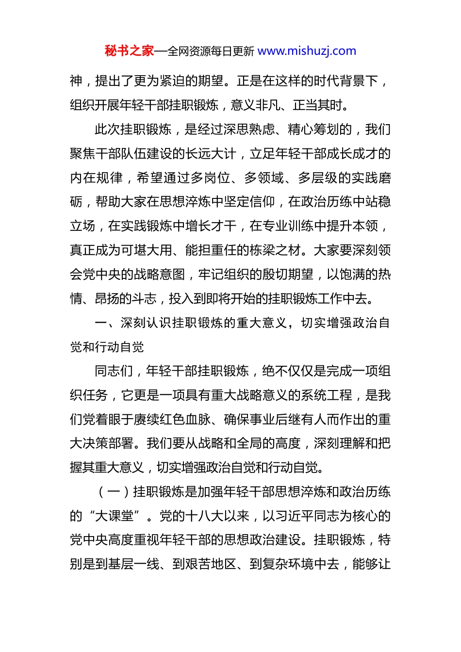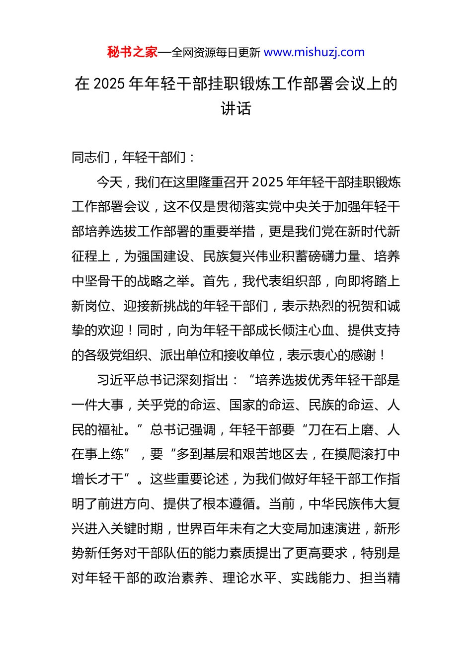 秘书之家—全网资源每日更新 www.mishuzj.com在 2025 年年轻干部挂职锻炼工作部署会议上的讲话 同志们,年轻干部们:今天,我们在这里隆重召开 2025 年年轻干部挂职锻炼工作部署会议,这不仅是贯彻落实党中央关于加强年轻干部培养选拔工作部署的重要举措,更是我们党在新时代新征程上,为强国建设、民族复兴伟业积蓄磅礴力量、培养中坚骨干的战略之举。首先,我代表组织部,向即将踏上新岗位、迎接新挑战的年轻干部们,表示热烈的祝贺和诚挚的欢迎!同时,向为年轻干部成长倾注心血、提供支持的各级党组织、派出单位和接收单位,表示衷心的感谢!习近平总书记深刻指出:“培养选拔优秀年轻干部是一件大事,关乎党的命运、国家的命运、民族的命运、人民的福祉。”总书记强调,年轻干部要“刀在石上磨、人在事上练”,要“多到基层和艰苦地区去,在摸爬滚打中增长才干”。这些重要论述,为我们做好年轻干部工作指明了前进方向、提供了根本遵循。当前,中华民族伟大复兴进入关键时期,世界百年未有之大变局加速演进,新形势新任务对干部队伍的能力素质提出了更高要求,特别是对年轻干部的政治素养、理论水平、实践能力、担当精秘书之家—全网资源每日更新 www.mishuzj.com神,提出了更为紧迫的期望。正是在这样的时代背景下,组织开展年轻干部挂职锻炼,意义非凡、正当其时。此次挂职锻炼,是经过深思熟虑、精心筹划的,我们聚焦干部队伍建设的长远大计,立足年轻干部成长成才的内在规律,希望通过多岗位、多领域、多层级的实践磨砺,帮助大家在思想淬炼中坚定信仰,在政治历练中站稳立场,在实践锻炼中增长才干,在专业训练中提升本领,真正成为可堪大用、能担重任的栋梁之材。大家要深刻领会党中央的战略意图,牢记组织的殷切期望,以饱满的热情、昂扬的斗志,投入到即将开始的挂职锻炼工作中去。一、深刻认识挂职锻炼的重大意义,切实增强政治自觉和行动自觉同志们,年轻干部挂职锻炼,绝不仅仅是完成一项组织任务,它更是一项具有重大战略意义的系统工程,是我们党着眼于赓续红色血脉、确保事业后继有人而作出的重大决策部署。我们要从战略和全局的高度,深刻理解和把握其重大意义,切实增强政治自觉和行动自觉。(一)挂职锻炼是加强年轻干部思想淬炼和政治历练的“大课堂”。党的十八大以来,以习近平同志为核心的党中央高度重视年轻干部的思想政治建设。挂职锻炼,特别是到基层一线、到艰苦地区、到复杂环境中去,能够让秘书之家—全网资源每日更新 www.mishuzj.com年轻干部身临其境地感受国情民意,直面矛盾问题,亲身体验党的路线方针政策在基层落地生根的生动实践。这不仅是对书本知识的验证和深化,更是对党性修养的直接考验和磨砺。在广阔的基层舞台上,年轻干部能够近距离接触群众,了解群众所思所盼,增进同人民群众的感情,从内心深处厚植为民情怀。唯有如此,才能真正理解“江山就是人民,人民就是江山”的深刻内涵,才能在政治上更加成熟,在思想上更加坚定,始终做到听党话、跟党走,永葆共产党人的政治本色。这是我们年轻干部成长道路上最为宝贵的一课,也是确保我们党基业长青的根本保证。(二)挂职锻炼是提升年轻干部实践能力和专业本领的“练兵场”。理论是行动的指南,但实践是检验真理的唯一标准。年轻干部虽然普遍受过良好教育,拥有扎实的理论功底,但在实际工作中,特别是在应对复杂局面、处理棘手问题、推动改革发展方面,仍然需要补齐短板、积累经验。挂职锻炼正是提供了这样一个真刀真枪、摸爬滚打的实践平台。通过参与地方经济社会发展规划、投身乡村振兴、生态文明建设、基层治理等重点工作,年轻干部可以亲身经历从调研论证到决策实施、从矛盾协调到成效评估的全过程,这无疑是提升统筹协调能力、科学决策能力、应急处置能力和抓落实能力的最佳途径。同时,不同秘书之家—全网资源每日更新 www.mishuzj.com岗位的挂职锻炼,还能帮助年轻干部拓宽视野,熟悉不同领域的专业知识和工作方法,从而成为一专多能的复合型人才,为应对新挑战、解决新问题奠定坚实基础。(三)挂职锻炼是优化干部队伍结构、激发队伍活力的“助推器”。年轻干部是党...