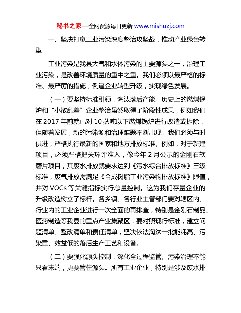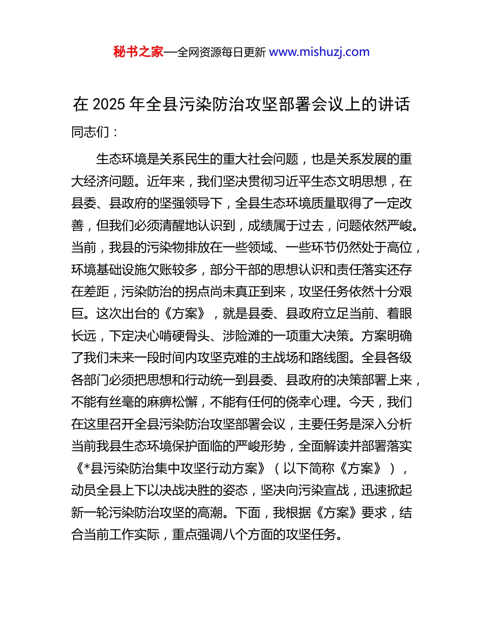 秘书之家—全网资源每日更新 www.mishuzj.com在 2025 年全县污染防治攻坚部署会议上的讲话同志们:生态环境是关系民生的重大社会问题,也是关系发展的重大经济问题。近年来,我们坚决贯彻习近平生态文明思想,在县委、县政府的坚强领导下,全县生态环境质量取得了一定改善,但我们必须清醒地认识到,成绩属于过去,问题依然严峻。当前,我县的污染物排放在一些领域、一些环节仍然处于高位,环境基础设施欠账较多,部分干部的思想认识和责任落实还存在差距,污染防治的拐点尚未真正到来,攻坚任务依然十分艰巨。这次出台的《方案》,就是县委、县政府立足当前、着眼长远,下定决心啃硬骨头、涉险滩的一项重大决策。方案明确了我们未来一段时间内攻坚克难的主战场和路线图。全县各级各部门必须把思想和行动统一到县委、县政府的决策部署上来,不能有丝毫的麻痹松懈,不能有任何的侥幸心理。今天,我们在这里召开全县污染防治攻坚部署会议,主要任务是深入分析当前我县生态环境保护面临的严峻形势,全面解读并部署落实《*县污染防治集中攻坚行动方案》(以下简称《方案》),动员全县上下以决战决胜的姿态,坚决向污染宣战,迅速掀起新一轮污染防治攻坚的高潮。下面,我根据《方案》要求,结合当前工作实际,重点强调八个方面的攻坚任务。秘书之家—全网资源每日更新 www.mishuzj.com一、坚决打赢工业污染深度整治攻坚战,推动产业绿色转型工业污染是我县大气和水体污染的主要源头之一,治理工业污染,是改善环境质量的重中之重。我们必须以最严格的标准、最严厉的措施,倒逼企业转型升级,实现绿色发展。(一)要坚持标准引领,淘汰落后产能。历史上的燃煤锅炉和“小散乱差”企业整治虽然取得了阶段性成果,例如我们在 2017 年前就已对 10 蒸吨以下燃煤锅炉进行改造或拆除,但随着发展,新的污染源和治理难题不断出现。我们必须与时俱进,严格执行最新的国家和地方排放标准。例如,对于新建项目,必须严格把关环评准入,像今年 2 月公示的金刚石软磨片项目,其废水排放就要求达到《污水综合排放标准》三级标准,废气排放需满足《合成树脂工业污染物排放标准》限值,并对 VOCs 等关键指标实行总量控制。这为我们存量企业的升级改造树立了标杆。各乡镇、各行业主管部门要对辖区内、行业内的工业企业进行一次全面的再排查,特别是金刚石制品、医药制造等我县的重点产业集聚区,要对照现行标准,建立问题清单、整改清单和责任清单,坚决依法淘汰一批能耗高、污染重、效益低的落后生产工艺和设备。(二)要强化源头控制,深化全过程监管。污染治理不能只看末端,更要管住源头。所有工业企业,特别是涉及废水排秘书之家—全网资源每日更新 www.mishuzj.com放的企业,必须确保其外排废水全因子稳定达到《惠济河流域水污染物排放标准》(DB41/918-2014)的要求。对于排放总磷的重点企业,要确保总磷在线监控设施稳定运行并与环保部门联网,数据要真实、准确、有效。生态环境分局要进一步完善在线监测和监督性监测机制,加密监测频次,并继续执行每季度向社会公布未达标企业名单的制度,用社会监督的力量促使企业履行治污主体责任。(三)要突出重点整治,务求取得实效。针对工业堆场、料场,要严格落实密闭、覆盖、喷淋等扬尘防控措施;针对涉挥发性有机物(VOCs)排放的企业,要全面推广使用低(无)VOCs 含量原辅材料,并配套建设高效的末端治理设施。我们要通过这次攻坚行动,真正解决一批长期存在的工业污染顽疾,推动我县工业经济走上高质量、可持续的发展轨道。二、坚决打赢黑臭水体歼灭战,还人民群众清水绿岸水环境质量直接关系到人民群众的幸福感和获得感。经过前几年的努力,我县惠济河、古黄河等主要河流水质已从持续稳定 V 类向更好的标准迈进,但县城建成区和部分农村地区的黑臭水体问题依然是群众反映强烈的痛点。(一)目标必须明确。我们的目标是,到 2025 年底,县城建成区黑臭水体基本消除,地表水水质优于Ⅳ类。这意味着我们要让惠济河、古黄河、余河坡、小沙河、永安河、商柘运秘书之家—全网资源每日更新 www.mishuzj.com河等流经我们身边的每一条...