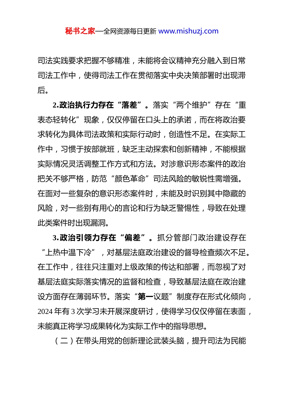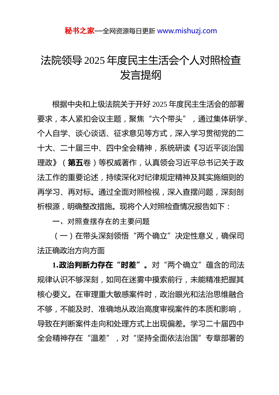 秘书之家—全网资源每日更新 www.mishuzj.com法院领导 2025 年度民主生活会个人对照检查发言提纲 根据中央和上级法院关于开好 2025 年度民主生活会的部署要求,本人紧扣会议主题,聚焦“六个带头”,通过集体研学、个人自学、谈心谈话、征求意见等方式,深入学习贯彻党的二十大、二十届三中、四中全会精神,系统研读《习近平谈治国理政》(第五卷)等权威著作,认真领会习近平总书记关于政法工作的重要论述,持续深化对纪律规定精神及其实施细则的再学习、再对标。通过全面对照检视,深入查摆问题,深刻剖析根源,明确整改措施。现将个人对照检查情况报告如下:一、对照查摆存在的主要问题(一)在带头深刻领悟“两个确立”决定性意义,确保司法正确政治方向方面1.政治判断力存在“时差”。对“两个确立”蕴含的司法规律认识不够深刻,如同在迷雾中摸索前行,未能精准把握其核心要义。在审理重大敏感案件时,政治眼光和法治思维融合不够,不能及时、准确地从政治高度审视案件的本质和影响,导致在判断案件走向和处理方式上出现偏差。学习二十届四中全会精神存在“温差”,对“坚持全面依法治国”专章部署的秘书之家—全网资源每日更新 www.mishuzj.com司法实践要求把握不够精准,未能将会议精神充分融入到日常司法工作中,使得司法工作在贯彻落实中央决策部署时出现滞后。2.政治执行力存在“落差”。落实“两个维护”存在“重表态轻转化”现象,仅仅停留在口头上的承诺,而在将政治要求转化为具体司法政策和实际行动时,创造性不足。在实际工作中,习惯于按部就班,缺乏主动探索和创新精神,不能根据实际情况灵活调整工作方式和方法。对涉意识形态案件的政治把关不够严格,防范“颜色革命”司法风险的敏锐性需增强。在面对一些复杂的意识形态案件时,未能及时识别其中隐藏的风险,对一些别有用心的言论和行为缺乏警惕性,导致在处理此类案件时出现漏洞。3.政治引领力存在“偏差”。抓分管部门政治建设存在“上热中温下冷”,对基层法庭政治建设的督导检查频次不足。在工作中,往往只注重对上级政策的传达和部署,而忽视了对基层法庭实际落实情况的监督和检查,导致基层法庭在政治建设方面存在薄弱环节。落实“第一议题”制度存在形式化倾向,2024 年有 3 次学习未开展深度研讨,使得学习仅仅停留在表面,未能真正将学习成果转化为实际工作中的指导思想。(二)在带头用党的创新理论武装头脑,提升司法为民能秘书之家—全网资源每日更新 www.mishuzj.com力方面1.理论武装“浅表化”。学习《习近平谈治国理政》(第五卷)存在选择性阅读,对“法治篇”反复研读但其他篇章涉猎不深,如同在知识的海洋中只选取了一小片区域进行探索,而忽略了更广阔的知识领域。这种片面的学习方式导致对党的创新理论的理解不够全面和深入,无法形成完整的知识体系。2024 年个人学习笔记中,结合审判工作实际的思考体会占比不足 40%,说明在学习过程中,未能将理论知识与实际工作紧密结合,缺乏对实际问题的深入思考和分析。2.学用转化“碎片化”。运用习近平法治思想破解“执行难”成效不明显,2024 年分管领域终本案件合格率仅 92%。在实际工作中,虽然学习了习近平法治思想,但未能将其有效地运用到解决“执行难”问题中,缺乏具体的实践措施和方法。对“枫桥经验”新时代内涵理解不深,诉源治理措施创新不足。“枫桥经验”是我国基层社会治理的成功典范,其新时代内涵为解决社会矛盾提供了新的思路和方法。但在实际工作中,未能充分理解和运用“枫桥经验”,导致诉源治理工作缺乏创新,效果不佳。3.思想引领“程式化”。与干警谈心谈话存在“三多三少”:谈工作多谈思想少,谈成绩多谈问题少,谈业务多谈理秘书之家—全网资源每日更新 www.mishuzj.com论少。这种谈心谈话方式过于注重表面的工作和成绩,而忽略了干警的思想动态和理论学习情况,无法真正了解干警的内心需求和困惑,也无法为干警提供有效的指导和帮助。分管部门有 12%干警存在“重法条轻理论”倾向,说明在思想引领方面存在不足,未能引导干警树立正确的学习观念和工作态度。(三)在带头坚持党的绝对领导,落实司法...