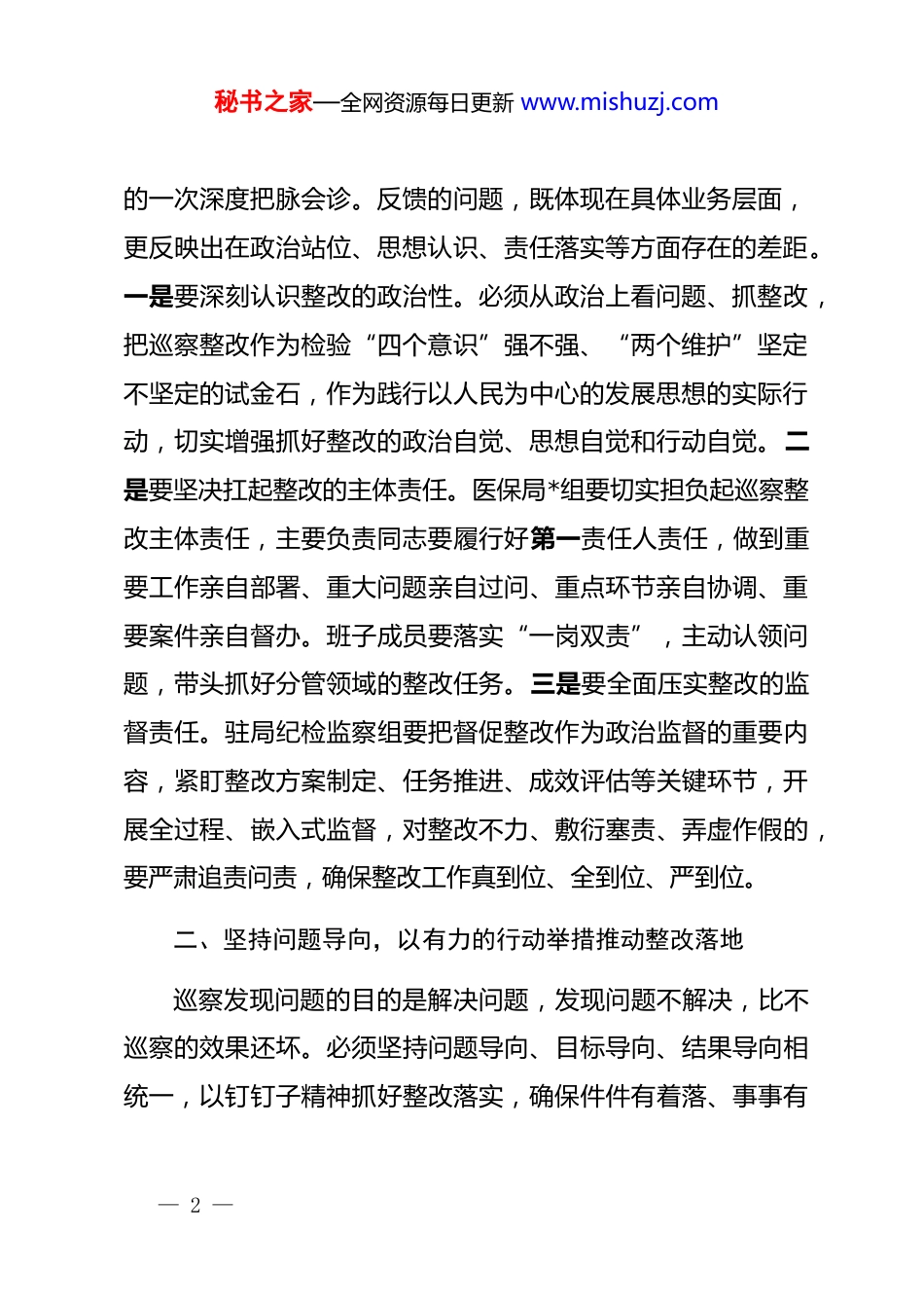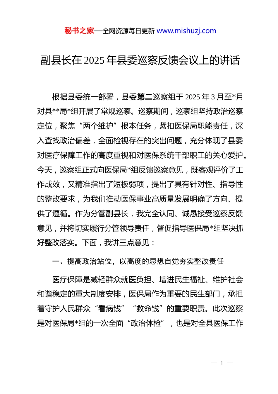 秘书之家—全网资源每日更新 www.mishuzj.com副县长在 2025 年县委巡察反馈会议上的讲话根据县委统一部署,县委第二巡察组于 2025 年 3 月至*月对县**局*组开展了常规巡察。巡察期间,巡察组坚持政治巡察定位,聚焦“两个维护”根本任务,紧扣医保局职能责任,深入查找政治偏差,全面检视存在的突出问题,充分体现了县委对医疗保障工作的高度重视和对医保系统干部职工的关心爱护。今天,巡察组正式向医保局*组反馈巡察意见,既客观评价了工作成效,又精准指出了短板弱项,提出了具有针对性、指导性的整改要求,为我们推动医保事业高质量发展明确了方向、提供了遵循。作为分管副县长,我完全认同、诚恳接受巡察反馈意见,并将切实履行分管领导责任,督促指导医保局*组坚决抓好整改落实。下面,我讲三点意见: 一、提高政治站位,以高度的思想自觉夯实整改责任医疗保障是减轻群众就医负担、增进民生福祉、维护社会和谐稳定的重大制度安排,医保局作为重要的民生部门,承担着守护人民群众“看病钱”“救命钱”的重要职责。此次巡察是对医保局*组的一次全面“政治体检”,也是对全县医保工作— 1 —秘书之家—全网资源每日更新 www.mishuzj.com的一次深度把脉会诊。反馈的问题,既体现在具体业务层面,更反映出在政治站位、思想认识、责任落实等方面存在的差距。一是要深刻认识整改的政治性。必须从政治上看问题、抓整改,把巡察整改作为检验“四个意识”强不强、“两个维护”坚定不坚定的试金石,作为践行以人民为中心的发展思想的实际行动,切实增强抓好整改的政治自觉、思想自觉和行动自觉。二是要坚决扛起整改的主体责任。医保局*组要切实担负起巡察整改主体责任,主要负责同志要履行好第一责任人责任,做到重要工作亲自部署、重大问题亲自过问、重点环节亲自协调、重要案件亲自督办。班子成员要落实“一岗双责”,主动认领问题,带头抓好分管领域的整改任务。三是要全面压实整改的监督责任。驻局纪检监察组要把督促整改作为政治监督的重要内容,紧盯整改方案制定、任务推进、成效评估等关键环节,开展全过程、嵌入式监督,对整改不力、敷衍塞责、弄虚作假的,要严肃追责问责,确保整改工作真到位、全到位、严到位。二、坚持问题导向,以有力的行动举措推动整改落地巡察发现问题的目的是解决问题,发现问题不解决,比不巡察的效果还坏。必须坚持问题导向、目标导向、结果导向相统一,以钉钉子精神抓好整改落实,确保件件有着落、事事有— 2 —秘书之家—全网资源每日更新 www.mishuzj.com回音。一是整改任务要清单化。医保局*组要对照巡察反馈意见,逐条梳理、逐项分析,研究制定整改方案,建立问题清单、任务清单、责任清单和时限清单,明确整改目标、整改措施、责任领导、责任科室和完成时限,做到可操作、可检查、可问责。要区分共性问题和个性问题、当前问题和长远问题,分类施策,精准发力。对于能够立即解决的问题,要立行立改、即知即改;对于需要一定时间解决的问题,要制定阶段性目标,持续攻坚;对于需要长期坚持的制度性问题,要健全长效机制,防止问题反弹。二是整改措施要具体化。整改不能停留在口号上、文件上,必须拿出实实在在的举措。比如,针对“医保基金监管存在薄弱环节”的问题,要加快构建全链条、全流程、全方位的基金监管体系,强化智能监控系统应用,加大飞行检查、专项治理力度,严查欺诈骗保行为,切实守好群众“救命钱”。针对“药品和医用耗材采购政策执行不到位”的问题,要严格规范集中带量采购流程,加强中选产品供应保障和临床使用监测,确保惠民政策落地见效。针对“服务群众能力有待提升”的问题,要深化医保领域“放管服”改革,优化经办服务流程,推广“一站式”结算、“互联网+医保”服务,推动服务向基层延伸,让群众办事更便捷、更高效。三是整改过程要闭环化。要建立整改台账,实行销号管理,完成一项、销号一项。要强— 3 —秘书之家—全网资源每日更新 www.mishuzj.com化跟踪问效,定期召开整改推进会,听取整改进展情况汇报,研究解决整改中的难点问题。要注重举一反三,不仅就事论事整改具体问题,更要从制度机制上...