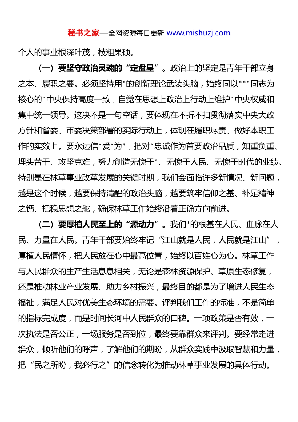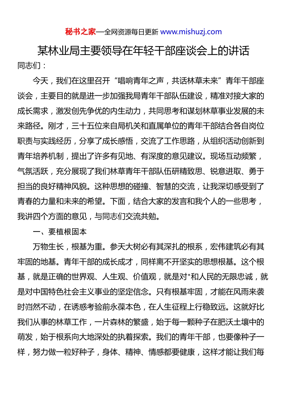 秘书之家—全网资源每日更新 www.mishuzj.com某林业局主要领导在年轻干部座谈会上的讲话同志们:今天,我们在这里召开“唱响青年之声,共话林草未来”青年干部座谈会,主要目的就是进一步加强我局青年干部队伍建设,精准对接大家的成长需求,激发创先争优的内生动力,共同思考和谋划林草事业发展的未来路径。刚才,三十五位来自局机关和直属单位的青年干部结合各自岗位职责与实践经历,分享了成长感悟,交流了工作思路,从组织活动创新到青年培养机制,提出了许多有见地、有深度的意见建议。现场互动频繁,气氛活跃,充分展现了我们林草青年干部队伍研精致思、锐意进取、勇于担当的良好精神风貌。这种思想的碰撞、智慧的交流,让我深切感受到了青春的力量和未来的希望。下面,结合大家的发言和我个人的一些思考,我讲四个方面的意见,与同志们交流共勉。一、要植根固本万物生长,根基为重。参天大树必有其深扎的根系,宏伟建筑必有其牢固的地基。青年干部的成长成才,同样离不开坚实的思想根基。这个根基,就是正确的世界观、人生观、价值观,就是对*和人民的无限忠诚,就是对中国特色社会主义事业的坚定信念。只有根基牢固,才能在风雨来袭时岿然不动,在诱惑考验前永葆本色,在人生征程上行稳致远。这就好比我们从事的林草工作,一片森林的繁盛,始于每一颗种子在肥沃土壤中的萌发,始于根系向大地深处的执着探索。我们的青年干部,也要像种子一样,努力做一粒好种子,身体、精神、情感都要健康,这样才能让我们每秘书之家—全网资源每日更新 www.mishuzj.com个人的事业根深叶茂,枝粗果硕。(一)要坚守政治灵魂的“定盘星”。政治上的坚定是青年干部立身之本、履职之要。必须坚持用*的创新理论武装头脑,始终同以***同志为核心的*中央保持高度一致,自觉在思想上政治上行动上维护*中央权威和集中统一领导。这决不是一句空话,要体现在不折不扣贯彻落实中央大政方针和省委、市委决策部署的实际行动上,体现在履职尽责、做好本职工作的实效上。要永远信*爱*为*,把对*忠诚作为首要政治品质,知重负重、埋头苦干、攻坚克难,努力创造无愧于*、无愧于人民、无愧于时代的业绩。特别是在林草事业改革发展的关键时期,我们会面临许多新情况、新问题,越是这个时候,越要保持清醒的政治头脑,越要筑牢信仰之基、补足精神之钙、把稳思想之舵,确保林草工作始终沿着正确方向前进。(二)要厚植人民至上的“源动力”。我们*的根基在人民、血脉在人民、力量在人民。青年干部要始终牢记“江山就是人民,人民就是江山”,厚植人民情怀,把人民放在心中最高位置,始终以百姓心为心。林草工作与人民群众的生产生活息息相关,无论是森林资源保护、草原生态修复,还是推动林业产业发展、助力乡村振兴,最终目的都是为了增进人民生态福祉,满足人民对优美生态环境的需要。评判我们工作的标准,不是简单的指标完成度,而是时间长河中人民群众的口碑。一项政策是否有效,一次执法是否公正,一场服务是否到位,最终要靠群众来评判。要经常走进群众,倾听他们的呼声,了解他们的期盼,从群众实践中汲取智慧和力量,把“民之所盼,我必行之”的信念转化为推动林草事业发展的具体行动。秘书之家—全网资源每日更新 www.mishuzj.com(三)要淬炼*性修养的“试金石”。*性是*员干部立身、立业、立言、立德的基石。年轻干部的成长不会一蹴而就,必须加强*性锤炼,接受思想洗礼,自觉传承红色基因。要积极主动参加*内政治生活,用好批评与自我批评的武器,勇于到群众中接受监督批评,善于将批评转化为磨砺的契机。要经常对照*章*规 dj,对照先进典型和反面案例,勤掸“思想尘”、多思“贪欲害”、常破“心中贼”,不断自我净化、自我完善、自我革新、自我提高。要自觉从*的百年光辉历程中激发信仰、获得启发、汲取力量,不断坚定“四个自信”,鼓足迈向新征程、奋斗新时代的精气神,永葆共产*人的政治本色。二、要修枝剪叶树木不修不成材,玉器不琢不成器。青年的成长如同树木的生长,不仅需要向阳而生的蓬勃生命力,也需要时常修枝剪叶,才能主干笔挺、枝繁叶茂。这个“修”和“剪”的过程,就是锤炼过...