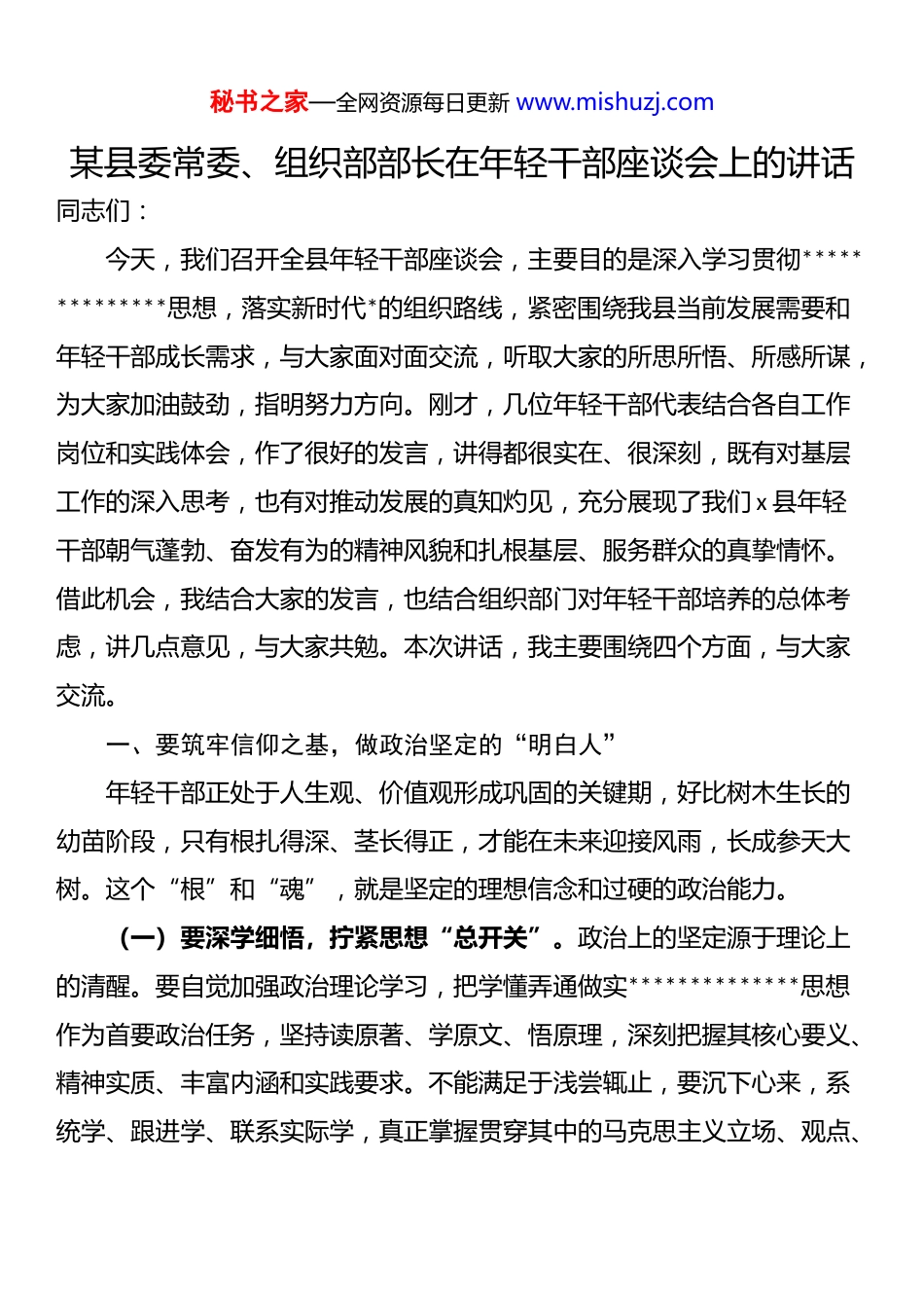 秘书之家—全网资源每日更新 www.mishuzj.com某县委常委、组织部部长在年轻干部座谈会上的讲话同志们:今天,我们召开全县年轻干部座谈会,主要目的是深入学习贯彻**************思想,落实新时代*的组织路线,紧密围绕我县当前发展需要和年轻干部成长需求,与大家面对面交流,听取大家的所思所悟、所感所谋,为大家加油鼓劲,指明努力方向。刚才,几位年轻干部代表结合各自工作岗位和实践体会,作了很好的发言,讲得都很实在、很深刻,既有对基层工作的深入思考,也有对推动发展的真知灼见,充分展现了我们 x 县年轻干部朝气蓬勃、奋发有为的精神风貌和扎根基层、服务群众的真挚情怀。借此机会,我结合大家的发言,也结合组织部门对年轻干部培养的总体考虑,讲几点意见,与大家共勉。本次讲话,我主要围绕四个方面,与大家交流。一、要筑牢信仰之基,做政治坚定的“明白人”年轻干部正处于人生观、价值观形成巩固的关键期,好比树木生长的幼苗阶段,只有根扎得深、茎长得正,才能在未来迎接风雨,长成参天大树。这个“根”和“魂”,就是坚定的理想信念和过硬的政治能力。(一)要深学细悟,拧紧思想“总开关”。政治上的坚定源于理论上的清醒。要自觉加强政治理论学习,把学懂弄通做实**************思想作为首要政治任务,坚持读原著、学原文、悟原理,深刻把握其核心要义、精神实质、丰富内涵和实践要求。不能满足于浅尝辄止,要沉下心来,系统学、跟进学、联系实际学,真正掌握贯穿其中的马克思主义立场、观点、秘书之家—全网资源每日更新 www.mishuzj.com方法,做到学思用贯通、知信行统一。要时刻关注*中央的决策部署和上级*委的工作要求,准确把握大局大势,不断提高政治判断力、政治领悟力、政治执行力,确保各项工作始终沿着正确方向前进,真正做到“不畏浮云遮望眼”。(二)要知行合一,融入发展“大格局”。学习的目的全在于运用。年轻干部要善于把崇高的理想信念转化为推动工作的强大动力,自觉把本职工作放到全县发展大局中去思考、去谋划、去推进。比如,在基层 dj 工作中,不能仅仅满足于完成“三会一课”等规定动作,更要思考如何通过建强*组织,更好地引领产业发展、化解矛盾纠纷、服务人民群众;在优化营商环境工作中,不能只停留在审批流程的简化,更要思考如何真正提升服务意识和效能,让企业和群众有实实在在的获得感。要坚决防止“说一套做一套”,把坚定的信仰体现在履职尽责、担当作为的实际行动上,体现在解决一个个具体问题、推动一项项具体工作的成效上。(三)要修身立德,守住初心“压舱石”。理想信念是具体的、实践的,也需要通过不断的修身立德来巩固和升华。年轻干部要经常对照*的理论和路线方针政策,对照*章*规 dj,对照初心使命,主动查找自身在思想、工作、作风等方面存在的差距和不足。要慎独慎微,从小事小节上加强修养,在一点一滴中完善自己。要正确处理公与私、义与利、是与非、情与法、亲与清的关系,保持清醒头脑,永葆共产*人的政治本色。要学习老一辈革命家和新时期先进模范的崇高精神,不断提升精神境界,做到“心不动于微利之诱,目不眩于五色之惑”,牢牢守住自己的政治生命线。秘书之家—全网资源每日更新 www.mishuzj.com二、要练就过硬本领,做干事创业的“实干家”能力是立身之本、成事之基。年轻干部精力充沛、思维活跃,正处在长本事、长才干的大好时期,一定要珍惜光阴、不负韶华,如饥似渴学习,一刻不停提高,练就担当作为的硬脊梁、宽肩膀、真本事。(一)要精耕主业,成为业务“政策通”。现代工作专业化、精细化程度越来越高,“万金油”式的干部越来越难以适应新时代发展的要求。年轻干部首先要成为本职工作的行家里手。要干一行、爱一行、钻一行、精一行,对自己负责领域的历史沿革、政策法规、业务流程、前沿动态等了然于胸。比如,负责农业农村工作的同志,要对粮食安全、乡村振兴、特色产业发展等方面的政策精神、技术知识、市场行情有深入把握;负责文旅融合的同志,要对本地的历史文化底蕴、旅游资源禀赋、市场需求趋势、推广运营模式有专业研究。不能满足于“大概先生”,要追求精准、精确、精细...