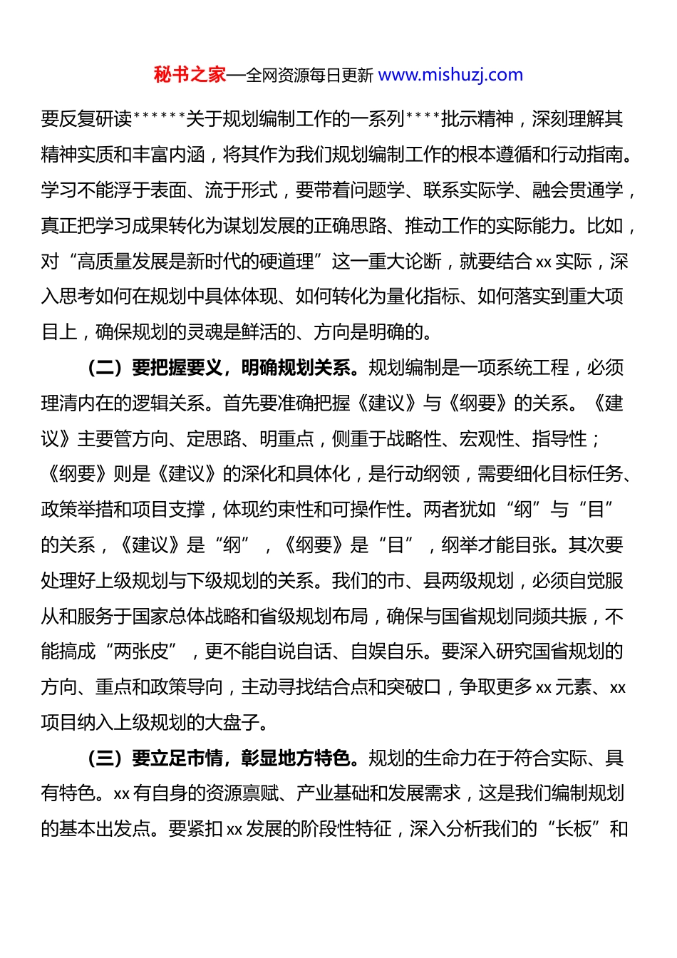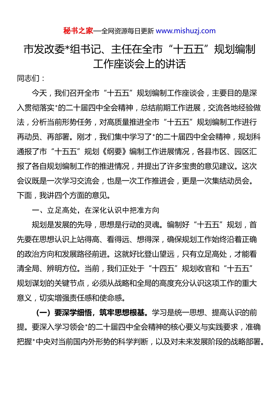 秘书之家—全网资源每日更新 www.mishuzj.com市发改委*组书记、主任在全市“十五五”规划编制工作座谈会上的讲话同志们:今天,我们召开全市“十五五”规划编制工作座谈会,主要目的是深入贯彻落实*的二十届四中全会精神,总结前期工作进展,交流各地经验做法,分析当前形势任务,对高质量推进全市“十五五”规划编制工作进行再动员、再部署。刚才,我们集中学习了*的二十届四中全会精神,规划科通报了市“十五五”规划《纲要》编制工作进展情况,各县市区、园区汇报了各自规划编制工作的推进情况,并提出了许多宝贵的意见建议。这次会议既是一次学习交流会,也是一次工作推进会,更是一次集结动员会。下面,我讲四个方面的意见。一、立足高处,在深化认识中把准方向规划是发展的先导,思想是行动的灵魂。编制好“十五五”规划,首先要在思想认识上站得高、看得远、想得深,确保规划工作始终沿着正确的政治方向和发展路径前进。这就好比登山望远,只有立足高处,才能看清全局、辨明方位。当前,我们正处于“十四五”规划收官和“十五五”规划谋划的关键节点,必须从战略和全局的高度充分认识这项工作的重大意义,切实增强责任感和使命感。(一)要深学细悟,筑牢思想根基。学习是统一思想、提高认识的前提。要深入学习领会*的二十届四中全会精神的核心要义与实践要求,准确把握*中央对当前国内外形势的科学判断,以及对未来发展阶段的战略部署。秘书之家—全网资源每日更新 www.mishuzj.com要反复研读******关于规划编制工作的一系列****批示精神,深刻理解其精神实质和丰富内涵,将其作为我们规划编制工作的根本遵循和行动指南。学习不能浮于表面、流于形式,要带着问题学、联系实际学、融会贯通学,真正把学习成果转化为谋划发展的正确思路、推动工作的实际能力。比如,对“高质量发展是新时代的硬道理”这一重大论断,就要结合 xx 实际,深入思考如何在规划中具体体现、如何转化为量化指标、如何落实到重大项目上,确保规划的灵魂是鲜活的、方向是明确的。(二)要把握要义,明确规划关系。规划编制是一项系统工程,必须理清内在的逻辑关系。首先要准确把握《建议》与《纲要》的关系。《建议》主要管方向、定思路、明重点,侧重于战略性、宏观性、指导性;《纲要》则是《建议》的深化和具体化,是行动纲领,需要细化目标任务、政策举措和项目支撑,体现约束性和可操作性。两者犹如“纲”与“目”的关系,《建议》是“纲”,《纲要》是“目”,纲举才能目张。其次要处理好上级规划与下级规划的关系。我们的市、县两级规划,必须自觉服从和服务于国家总体战略和省级规划布局,确保与国省规划同频共振,不能搞成“两张皮”,更不能自说自话、自娱自乐。要深入研究国省规划的方向、重点和政策导向,主动寻找结合点和突破口,争取更多 xx 元素、xx项目纳入上级规划的大盘子。(三)要立足市情,彰显地方特色。规划的生命力在于符合实际、具有特色。xx 有自身的资源禀赋、产业基础和发展需求,这是我们编制规划的基本出发点。要紧扣 xx 发展的阶段性特征,深入分析我们的“长板”和秘书之家—全网资源每日更新 www.mishuzj.com“短板”、“潜力”和“压力”。比如,我们的区位交通优势、老工业基地基础、历史文化底蕴是“长板”,但可能也面临创新能力不足、产业结构偏重等“短板”。规划编制不能“一刀切”,更不能“依葫芦画瓢”,必须从 xx 的实际出发,搞清楚“我们有什么”“我们能干什么”“群众盼什么”,使规划真正反映 xx 特色、满足 xx 需求、解决 xx 问题。要坚持“项目为王”的理念,但项目谋划不能“撒胡椒面”,要围绕我们的优势特色和短板弱项,精心谋划一批能够提升城市能级、增强发展后劲、改善人民生活的重大项目,让规划既有高度又接地气。二、瞄准远处,在对标对表中科学谋划“十五五”规划关乎 xx 未来五年的发展路径,甚至影响更长远的未来。这就要求我们必须具备战略眼光,善于在时代发展的大潮中找准方位,在国省发展的大局中明确坐标,做到前瞻布局、科学谋划。这好比下棋,既要看眼前一步,更要谋划后面三步、五步,甚至更远。(一)要...