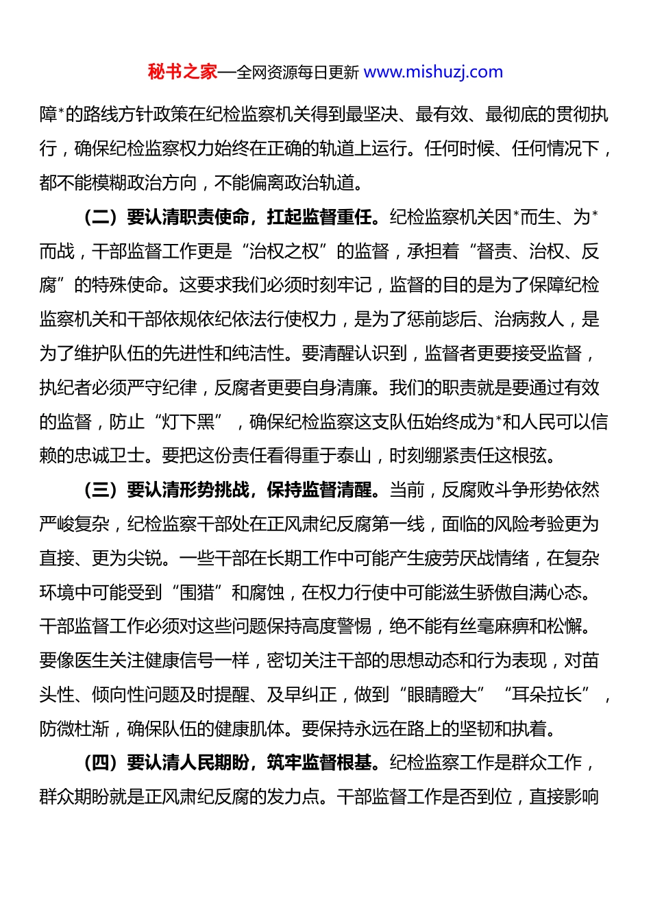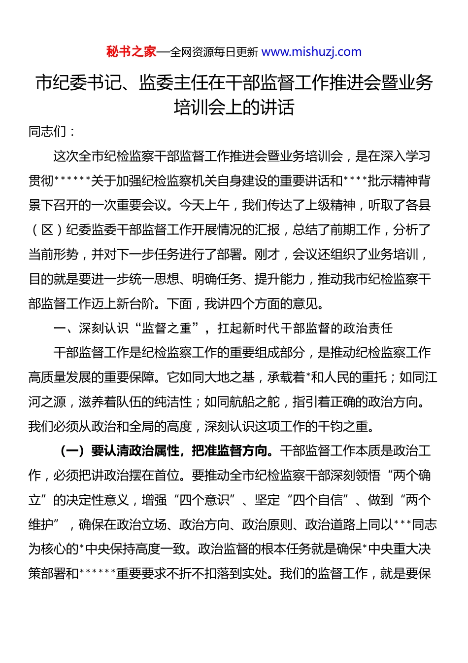 秘书之家—全网资源每日更新 www.mishuzj.com市纪委书记、监委主任在干部监督工作推进会暨业务培训会上的讲话同志们:这次全市纪检监察干部监督工作推进会暨业务培训会,是在深入学习贯彻******关于加强纪检监察机关自身建设的重要讲话和****批示精神背景下召开的一次重要会议。今天上午,我们传达了上级精神,听取了各县(区)纪委监委干部监督工作开展情况的汇报,总结了前期工作,分析了当前形势,并对下一步任务进行了部署。刚才,会议还组织了业务培训,目的就是要进一步统一思想、明确任务、提升能力,推动我市纪检监察干部监督工作迈上新台阶。下面,我讲四个方面的意见。一、深刻认识“监督之重”,扛起新时代干部监督的政治责任干部监督工作是纪检监察工作的重要组成部分,是推动纪检监察工作高质量发展的重要保障。它如同大地之基,承载着*和人民的重托;如同江河之源,滋养着队伍的纯洁性;如同航船之舵,指引着正确的政治方向。我们必须从政治和全局的高度,深刻认识这项工作的千钧之重。(一)要认清政治属性,把准监督方向。干部监督工作本质是政治工作,必须把讲政治摆在首位。要推动全市纪检监察干部深刻领悟“两个确立”的决定性意义,增强“四个意识”、坚定“四个自信”、做到“两个维护”,确保在政治立场、政治方向、政治原则、政治道路上同以***同志为核心的*中央保持高度一致。政治监督的根本任务就是确保*中央重大决策部署和******重要要求不折不扣落到实处。我们的监督工作,就是要保秘书之家—全网资源每日更新 www.mishuzj.com障*的路线方针政策在纪检监察机关得到最坚决、最有效、最彻底的贯彻执行,确保纪检监察权力始终在正确的轨道上运行。任何时候、任何情况下,都不能模糊政治方向,不能偏离政治轨道。(二)要认清职责使命,扛起监督重任。纪检监察机关因*而生、为*而战,干部监督工作更是“治权之权”的监督,承担着“督责、治权、反腐”的特殊使命。这要求我们必须时刻牢记,监督的目的是为了保障纪检监察机关和干部依规依纪依法行使权力,是为了惩前毖后、治病救人,是为了维护队伍的先进性和纯洁性。要清醒认识到,监督者更要接受监督,执纪者必须严守纪律,反腐者更要自身清廉。我们的职责就是要通过有效的监督,防止“灯下黑”,确保纪检监察这支队伍始终成为*和人民可以信赖的忠诚卫士。要把这份责任看得重于泰山,时刻绷紧责任这根弦。(三)要认清形势挑战,保持监督清醒。当前,反腐败斗争形势依然严峻复杂,纪检监察干部处在正风肃纪反腐第一线,面临的风险考验更为直接、更为尖锐。一些干部在长期工作中可能产生疲劳厌战情绪,在复杂环境中可能受到“围猎”和腐蚀,在权力行使中可能滋生骄傲自满心态。干部监督工作必须对这些问题保持高度警惕,绝不能有丝毫麻痹和松懈。要像医生关注健康信号一样,密切关注干部的思想动态和行为表现,对苗头性、倾向性问题及时提醒、及早纠正,做到“眼睛瞪大”“耳朵拉长”,防微杜渐,确保队伍的健康肌体。要保持永远在路上的坚韧和执着。(四)要认清人民期盼,筑牢监督根基。纪检监察工作是群众工作,群众期盼就是正风肃纪反腐的发力点。干部监督工作是否到位,直接影响秘书之家—全网资源每日更新 www.mishuzj.com群众对*风廉政建设和反腐败斗争的获得感、幸福感、安全感。要始终坚持人民至上,把解决群众反映强烈的突出问题作为干部监督的重要切入点,推动监督力量下沉,深入民生一线、项目一线、执法一线,严肃查处纪检监察干部队伍中可能存在的侵害群众利益的不正之风和腐败问题,特别是“微腐败”“小官大贪”等问题,让群众感受到监督就在身边、公平正义就在眼前。要把群众满意与否作为衡量监督工作成效的重要标尺。二、精准把握“监督之要”,落实干部监督的岗位职责干部监督工作不是虚化的概念,而是具体的实践;不能停留在口头,必须落实于行动。关键在于把握核心要领,将监督职责融入日常、抓在平常、严在经常,使监督工作如影随形,无处不在,又精准有效。(一)要聚焦“督责”,常态化开展监督谈话。监督谈话是了解干部、发现问题、传导压力的有效方式。要围绕干部监督责任落实...
