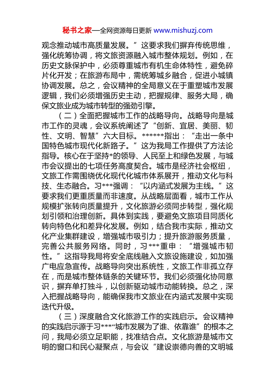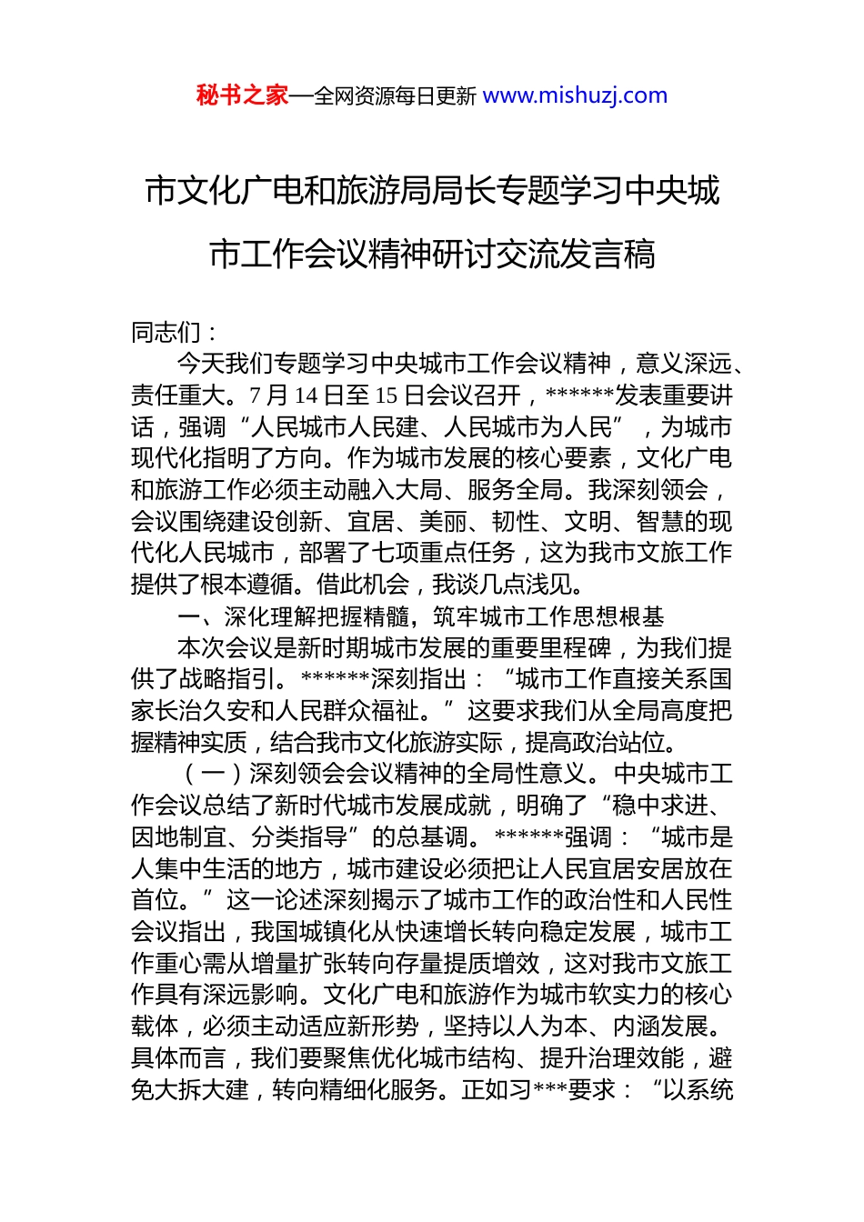 秘书之家—全网资源每日更新 www.mishuzj.com市文化广电和旅游局局长专题学习中央城市工作会议精神研讨交流发言稿同志们:今天我们专题学习中央城市工作会议精神,意义深远、责任重大。7 月 14 日至 15 日会议召开,******发表重要讲话,强调“人民城市人民建、人民城市为人民”,为城市现代化指明了方向。作为城市发展的核心要素,文化广电和旅游工作必须主动融入大局、服务全局。我深刻领会,会议围绕建设创新、宜居、美丽、韧性、文明、智慧的现代化人民城市,部署了七项重点任务,这为我市文旅工作提供了根本遵循。借此机会,我谈几点浅见。一、深化理解把握精髓,筑牢城市工作思想根基本次会议是新时期城市发展的重要里程碑,为我们提供了战略指引。******深刻指出:“城市工作直接关系国家长治久安和人民群众福祉。”这要求我们从全局高度把握精神实质,结合我市文化旅游实际,提高政治站位。(一)深刻领会会议精神的全局性意义。中央城市工作会议总结了新时代城市发展成就,明确了“稳中求进、因地制宜、分类指导”的总基调。******强调:“城市是人集中生活的地方,城市建设必须把让人民宜居安居放在首位。”这一论述深刻揭示了城市工作的政治性和人民性会议指出,我国城镇化从快速增长转向稳定发展,城市工作重心需从增量扩张转向存量提质增效,这对我市文旅工作具有深远影响。文化广电和旅游作为城市软实力的核心载体,必须主动适应新形势,坚持以人为本、内涵发展。具体而言,我们要聚焦优化城市结构、提升治理效能,避免大拆大建,转向精细化服务。正如习***要求:“以系统秘书之家—全网资源每日更新 www.mishuzj.com观念推动城市高质量发展。”这要求我们摒弃传统思维,强化统筹协调,将文旅资源融入城市整体规划。例如,在历史文脉保护中,必须尊重城市有机生命体特性,避免碎片化开发;在旅游布局中,需统筹城乡融合,促进小城镇协调发展。总之,会议精神的全局意义在于重塑城市发展逻辑,我们必须增强历史主动,把握规律、服务大局,确保文旅业成为城市转型的强劲引擎。(二)全面把握城市工作的战略导向。战略导向是城市工作的灵魂,会议系统阐述了“创新、宜居、美丽、韧性、文明、智慧”六大目标。******指出:“走出一条中国特色城市现代化新路子。”这为我局工作提供了方法论指导。核心在于坚持*的领导、人民至上和绿色发展,与城市会议提出的七项任务高度契合。城市是经济社会枢纽,文旅工作需围绕优化现代化城市体系展开,推动文化与科技、生态融合。习***强调:“以内涵式发展为主线。”这要求我们更重质量而非速度。从战略层面看,城市工作从规模扩张转向质量提升,文化旅游必须同步转型,强化规划引领和治理创新。具体到实践,要避免文旅项目同质化转向特色化和差异化发展。例如,结合我市实际,推动文化产业集群建设,增强城市吸引力;提升旅游服务质量,完善公共服务网络。同时,习***重申:“增强城市韧性。”这指导我局将安全底线融入文旅设施建设,如加强广电应急宣传。战略导向突出系统性,文旅工作非孤立存在,而是城市整体链条的关键环节。我们必须强化协同意识,摒弃单打独斗,以创新驱动城市动能转换。总之,深入把握战略导向,能确保我市文旅业在内涵式发展中实现迭代升级。(三)深度融合文化旅游工作的实践启示。会议精神的实践启示源于习***“城市发展为了谁、依靠谁”的根本之问,我局必须立足职能,找准结合点。文化旅游是城市文明的窗口和民心凝聚点,与会议“建设崇德向善的文明城秘书之家—全网资源每日更新 www.mishuzj.com市”任务直接呼应。启示一:文化传承是城市底蕴的核心正如习***强调:“保护城市独特历史文脉、人文地理、自然景观。”这要求我局强化遗产保护和活态利用,避免文化断层。启示二:旅游发展是宜居城市的重要支撑,会议明确“大力发展生活性服务业”,需我局提升公共服务水平,如构建智慧景区网络。启示三:广电宣传是城市治理的喉舌,要创新理念手段,高效解决群众急难愁盼。从深层启示看,城市工作重心转向治理投入,我局应更重制度建设和执行能力,避免形式主义。例如,在 xx 市实践中,推动文脉...