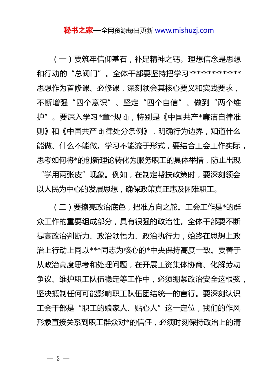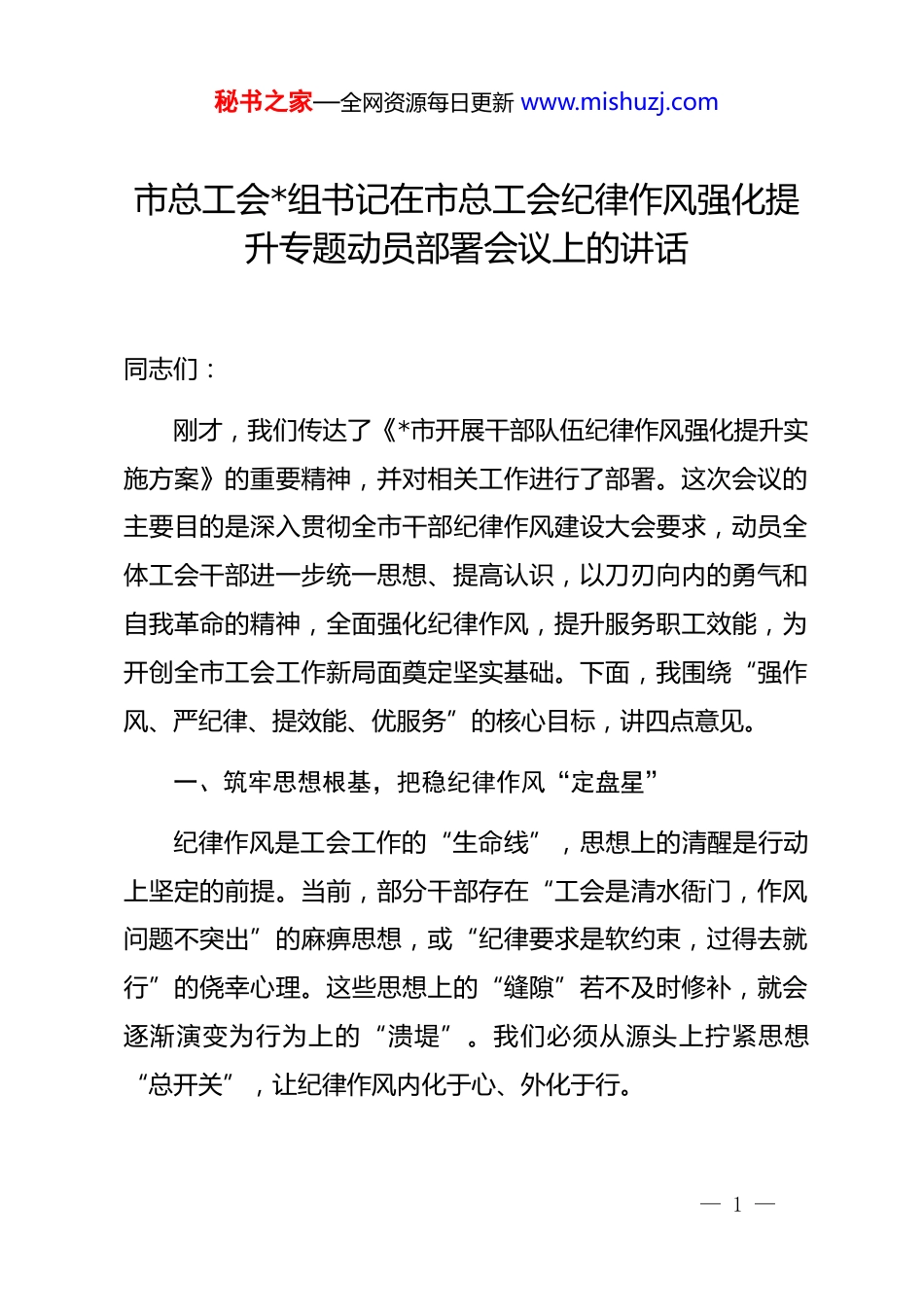 秘书之家—全网资源每日更新 www.mishuzj.com市总工会*组书记在市总工会纪律作风强化提升专题动员部署会议上的讲话同志们:刚才,我们传达了《*市开展干部队伍纪律作风强化提升实施方案》的重要精神,并对相关工作进行了部署。这次会议的主要目的是深入贯彻全市干部纪律作风建设大会要求,动员全体工会干部进一步统一思想、提高认识,以刀刃向内的勇气和自我革命的精神,全面强化纪律作风,提升服务职工效能,为开创全市工会工作新局面奠定坚实基础。下面,我围绕“强作风、严纪律、提效能、优服务”的核心目标,讲四点意见。一、筑牢思想根基,把稳纪律作风“定盘星”纪律作风是工会工作的“生命线”,思想上的清醒是行动上坚定的前提。当前,部分干部存在“工会是清水衙门,作风问题不突出”的麻痹思想,或“纪律要求是软约束,过得去就行”的侥幸心理。这些思想上的“缝隙”若不及时修补,就会逐渐演变为行为上的“溃堤”。我们必须从源头上拧紧思想“总开关”,让纪律作风内化于心、外化于行。— 1 —秘书之家—全网资源每日更新 www.mishuzj.com(一)要筑牢信仰基石,补足精神之钙。理想信念是思想和行动的“总阀门”。全体干部要坚持把学习**************思想作为首修课、必修课,深刻领会其核心要义和实践要求,不断增强“四个意识”、坚定“四个自信”、做到“两个维护”。要深入学习*章*规 dj,特别是《中国共产*廉洁自律准则》和《中国共产 dj 律处分条例》,明确行为边界,知道什么能做、什么不能做。学习不能流于形式,要结合工会工作实际,思考如何将*的创新理论转化为服务职工的具体举措,防止出现“学用两张皮”现象。例如,在制定帮扶政策时,要深刻领会以人民为中心的发展思想,确保政策真正惠及困难职工。(二)要擦亮政治底色,把准方向之舵。工会工作是*的群众工作的重要组成部分,具有很强的政治性。全体干部要不断提高政治判断力、政治领悟力、政治执行力,始终在思想上政治上行动上同以***同志为核心的*中央保持高度一致。要善于从政治高度思考和处理问题,在开展工资集体协商、化解劳动争议、维护职工队伍稳定等工作中,必须绷紧政治安全这根弦,坚决抵制任何可能影响职工队伍团结统一的言行。要深刻认识工会干部是“职工的娘家人、贴心人”这一定位,我们的作风形象直接关系到职工群众对*的信任,必须时刻保持政治上的清— 2 —秘书之家—全网资源每日更新 www.mishuzj.com醒和坚定。(三)要破除思想坚冰,激发活力之源。当前,工会工作面临许多新情况新挑战,如新就业形态劳动者权益保障、数字经济下的劳动关系变化等。有些干部仍习惯于按老经验、老办法办事,存在“路径依赖”。我们必须打破思维定势,主动适应新常态。要深入开展解放思想大讨论,鼓励干部跳出*看工会,学习借鉴先进地区经验,比如一些地方工会在运用“互联网+”服务职工、构建和谐劳动关系方面的创新做法。要树立“终身学习”理念,不仅学政治理论,还要学法律法规、学经济知识、学现代信息技术,克服“本领恐慌”,努力成为工会工作的行家里手。二、聚焦突出问题,打响整改提升“攻坚战”纪律作风强化提升,关键在于找准问题、精准发力。我们要以“钉钉子”精神,紧盯当前干部队伍中存在的突出问题,瞄着问题去、追着问题改,不解决问题绝不撒手。(一)要根治“慵懒散漫”,绷紧纪律高压线。纪律松弛是作风涣散的开始。要坚决纠治迟到早退、脱岗离岗、上班时间处理私事等自由散漫现象;坚决纠正对待工作敷衍塞责、推— 3 —秘书之家—全网资源每日更新 www.mishuzj.com诿扯皮、效率低下等“慢粗虚”问题;严肃查处不依纪依法办事,甚至利用微小权力“吃拿卡要”的行为。要严格执行请销假、外出报备、会议纪律等日常管理制度,让铁规发力、禁令生威。市总将成立纪律作风督查小组,采取定期检查与随机抽查相结合的方式,对发现的问题“零容忍”,发现一起、查处一起,绝不姑息迁就,让纪律真正成为带电的“高压线”。(二)要整治“虚浮推拖”,擦亮服务金名片。工会工作的价值体现在服务职工的实际成效上。要重点整治服务职工群众意识淡薄、工作不接地气、满足于“纸...