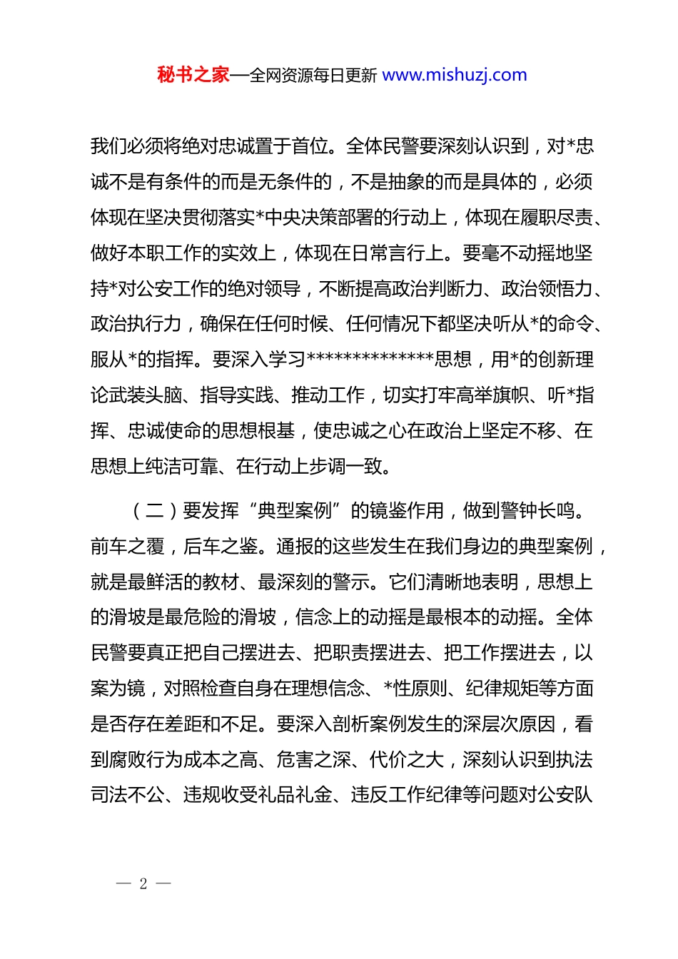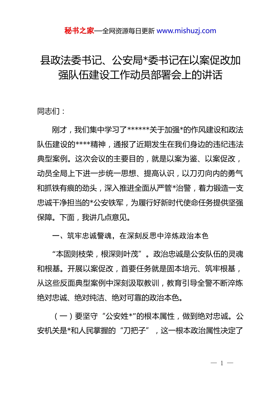 秘书之家—全网资源每日更新 www.mishuzj.com县政法委书记、公安局*委书记在以案促改加强队伍建设工作动员部署会上的讲话同志们:刚才,我们集中学习了******关于加强*的作风建设和政法队伍建设的****精神,通报了近期发生在我们身边的违纪违法典型案例。这次会议的主要目的,就是以案为鉴、以案促改,动员全局上下进一步统一思想、提高认识,以刀刃向内的勇气和抓铁有痕的劲头,深入推进全面从严管*治警,着力锻造一支忠诚干净担当的*公安铁军,为履行好新时代使命任务提供坚强保障。下面,我讲几点意见。一、筑牢忠诚警魂,在深刻反思中淬炼政治本色“本固则枝荣,根深则叶茂”。政治忠诚是公安队伍的灵魂和根基。开展以案促改,首要任务就是固本培元、筑牢根基,从这些反面典型案例中深刻汲取教训,教育引导全警不断淬炼绝对忠诚、绝对纯洁、绝对可靠的政治本色。(一)要坚守“公安姓*”的根本属性,做到绝对忠诚。公安机关是*和人民掌握的“刀把子”,这一根本政治属性决定了— 1 —秘书之家—全网资源每日更新 www.mishuzj.com我们必须将绝对忠诚置于首位。全体民警要深刻认识到,对*忠诚不是有条件的而是无条件的,不是抽象的而是具体的,必须体现在坚决贯彻落实*中央决策部署的行动上,体现在履职尽责、做好本职工作的实效上,体现在日常言行上。要毫不动摇地坚持*对公安工作的绝对领导,不断提高政治判断力、政治领悟力、政治执行力,确保在任何时候、任何情况下都坚决听从*的命令、服从*的指挥。要深入学习**************思想,用*的创新理论武装头脑、指导实践、推动工作,切实打牢高举旗帜、听*指挥、忠诚使命的思想根基,使忠诚之心在政治上坚定不移、在思想上纯洁可靠、在行动上步调一致。(二)要发挥“典型案例”的镜鉴作用,做到警钟长鸣。前车之覆,后车之鉴。通报的这些发生在我们身边的典型案例,就是最鲜活的教材、最深刻的警示。它们清晰地表明,思想上的滑坡是最危险的滑坡,信念上的动摇是最根本的动摇。全体民警要真正把自己摆进去、把职责摆进去、把工作摆进去,以案为镜,对照检查自身在理想信念、*性原则、纪律规矩等方面是否存在差距和不足。要深入剖析案例发生的深层次原因,看到腐败行为成本之高、危害之深、代价之大,深刻认识到执法司法不公、违规收受礼品礼金、违反工作纪律等问题对公安队— 2 —秘书之家—全网资源每日更新 www.mishuzj.com伍形象、对执法公信力、对*和政府威信的严重破坏。要通过警示教育,让每一名民警都知敬畏、存戒惧、守底线,在心中筑起一道拒腐防变的坚固堤坝,达到“查处一案、警示一片、治理一域”的效果。(三)要夯实“理想信念”的信仰基石,做到矢志不渝。理想信念是精神之“钙”,缺钙就会得“软骨病”。一些干警之所以出问题,根源就在于理想信念这个“总开关”没有拧紧。必须把理想信念教育作为育警铸魂、固本培元的战略工程常抓不懈。要紧密结合*史学习教育,弘扬伟大建*精神,传承红色基因,从*的百年奋斗历程中汲取智慧和力量,不断补足精神之钙、筑牢信仰之基。要引导全警胸怀“国之大者”,增强忧患意识,发扬斗争精神,在大是大非面前旗帜鲜明,在风浪考验面前无所畏惧,在各种诱惑面前立场坚定,永葆人民警察的初心使命,矢志不渝做中国特色社会主义事业的建设者和捍卫者。二、清除沉疴积弊,在刮骨疗毒中净化队伍肌体“蠹众而木折,隙大而墙坏”。公安队伍是维护社会稳定的重要力量,肌体健康至关重要。我们必须勇于直面问题,敢于动真碰硬,以刮骨疗毒的决心和勇气,坚决清除害群之马,彻底整治顽瘴痼疾,不断净化优化队伍政治生态。— 3 —秘书之家—全网资源每日更新 www.mishuzj.com(一)要刀刃向内“清病灶”,坚决清除害群之马。害群之马是公安队伍的“毒瘤”,严重损害队伍肌体健康,严重破坏警民关系。对这类问题,必须坚持无禁区、全覆盖、零容忍,坚持重遏制、强高压、长震慑。要聚焦执法司法腐败问题,重点严查*的十八大以来不收敛、不收手,问题线索反映集中、群众反映强烈的违纪违法案件,特别是对那些滥用职权、贪赃枉法、以案谋私,甚至充当黑恶势力、黄赌毒“保护伞”的,...