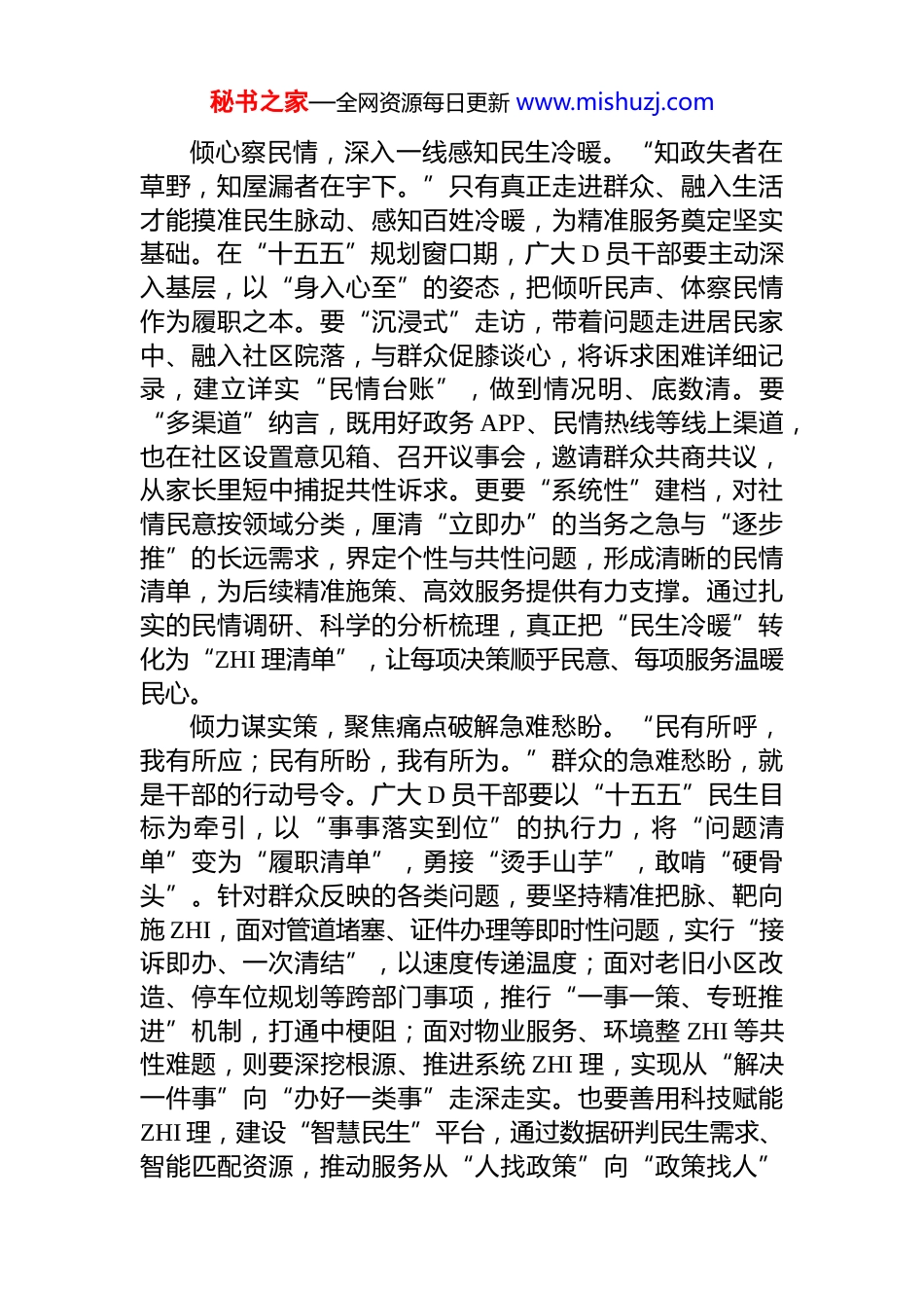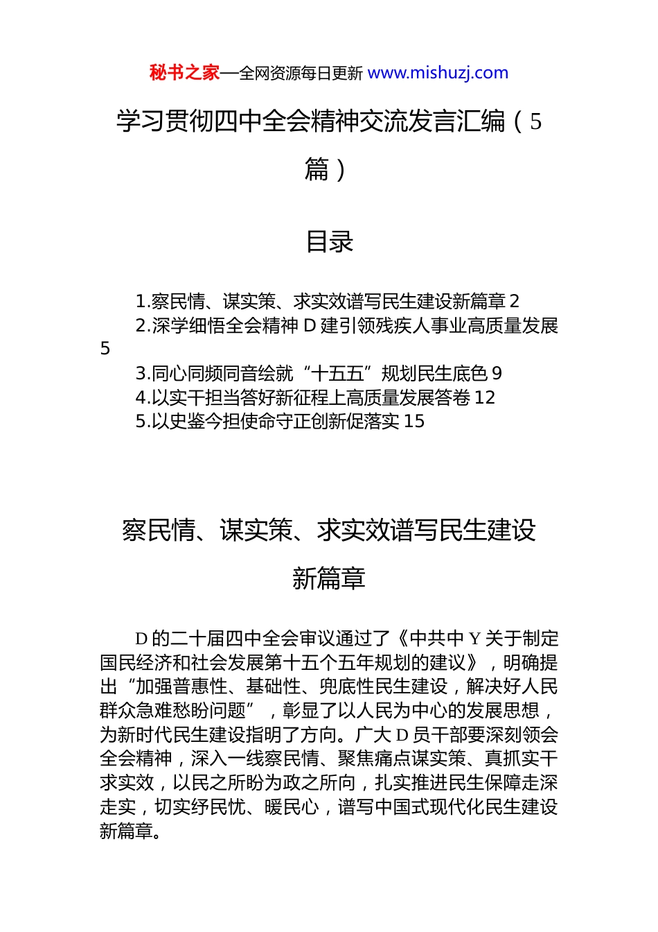 秘书之家—全网资源每日更新 www.mishuzj.com学习贯彻四中全会精神交流发言汇编(5篇)目录1.察民情、谋实策、求实效谱写民生建设新篇章 22.深学细悟全会精神 D 建引领残疾人事业高质量发展53.同心同频同音绘就“十五五”规划民生底色 94.以实干担当答好新征程上高质量发展答卷 125.以史鉴今担使命守正创新促落实 15察民情、谋实策、求实效谱写民生建设新篇章D 的二十届四中全会审议通过了《中共中 Y 关于制定国民经济和社会发展第十五个五年规划的建议》,明确提出“加强普惠性、基础性、兜底性民生建设,解决好人民群众急难愁盼问题”,彰显了以人民为中心的发展思想,为新时代民生建设指明了方向。广大 D 员干部要深刻领会全会精神,深入一线察民情、聚焦痛点谋实策、真抓实干求实效,以民之所盼为政之所向,扎实推进民生保障走深走实,切实纾民忧、暖民心,谱写中国式现代化民生建设新篇章。秘书之家—全网资源每日更新 www.mishuzj.com倾心察民情,深入一线感知民生冷暖。“知政失者在草野,知屋漏者在宇下。”只有真正走进群众、融入生活才能摸准民生脉动、感知百姓冷暖,为精准服务奠定坚实基础。在“十五五”规划窗口期,广大 D 员干部要主动深入基层,以“身入心至”的姿态,把倾听民声、体察民情作为履职之本。要“沉浸式”走访,带着问题走进居民家中、融入社区院落,与群众促膝谈心,将诉求困难详细记录,建立详实“民情台账”,做到情况明、底数清。要“多渠道”纳言,既用好政务 APP、民情热线等线上渠道,也在社区设置意见箱、召开议事会,邀请群众共商共议,从家长里短中捕捉共性诉求。更要“系统性”建档,对社情民意按领域分类,厘清“立即办”的当务之急与“逐步推”的长远需求,界定个性与共性问题,形成清晰的民情清单,为后续精准施策、高效服务提供有力支撑。通过扎实的民情调研、科学的分析梳理,真正把“民生冷暖”转化为“ZHI 理清单”,让每项决策顺乎民意、每项服务温暖民心。倾力谋实策,聚焦痛点破解急难愁盼。“民有所呼,我有所应;民有所盼,我有所为。”群众的急难愁盼,就是干部的行动号令。广大 D 员干部要以“十五五”民生目标为牵引,以“事事落实到位”的执行力,将“问题清单”变为“履职清单”,勇接“烫手山芋”,敢啃“硬骨头”。针对群众反映的各类问题,要坚持精准把脉、靶向施 ZHI,面对管道堵塞、证件办理等即时性问题,实行“接诉即办、一次清结”,以速度传递温度;面对老旧小区改造、停车位规划等跨部门事项,推行“一事一策、专班推进”机制,打通中梗阻;面对物业服务、环境整 ZHI 等共性难题,则要深挖根源、推进系统 ZHI 理,实现从“解决一件事”向“办好一类事”走深走实。也要善用科技赋能ZHI 理,建设“智慧民生”平台,通过数据研判民生需求、智能匹配资源,推动服务从“人找政策”向“政策找人”秘书之家—全网资源每日更新 www.mishuzj.com转变,持续打通民生堵点,让民生服务可感可及、高效便捷,以科学精准之策回应民生关切,增强群众获得感、幸福感、安全感。倾责求实效,真抓实干筑牢幸福根基。“民生无小事,枝叶总关情。”做好民生工作,重在务实担当、贵在久久为功。广大 D 员干部要立足高质量发展要求,坚持实效导向,既要做让群众看得见、得实惠的显绩,也要做为后人打基础、利长远的潜绩,切实把工作着力点放在解决群众急难愁盼上,确保每件民生实事落地有声、务实有效。要推动服务资源直达基层,打通惠民“最后一公里”,依托“家门口”服务站点和“一站式”便民中心,实现政策咨询、业务办理、公共服务向社区延伸,让群众少跑腿、好办事。同时要注重民生项目的长效运营,落实“建管用”一体化机制,既确保设施建得好,更保障服务用得久。要把群众满意度作为衡量标尺,建立实事办结回访机制,通过入户走访、线上问卷、数据监测等方式,跟踪项目实效听取真实反馈,对运行不畅的服务及时优化,对群众新需求快速响应。唯有扎实办好每件民生小事,以干部的“辛苦指数”提升人民的“幸福指数”,才能赢得群众真信任筑牢幸福硬根基,为绘就“十五五”民生新图景注入持久动能。深学...