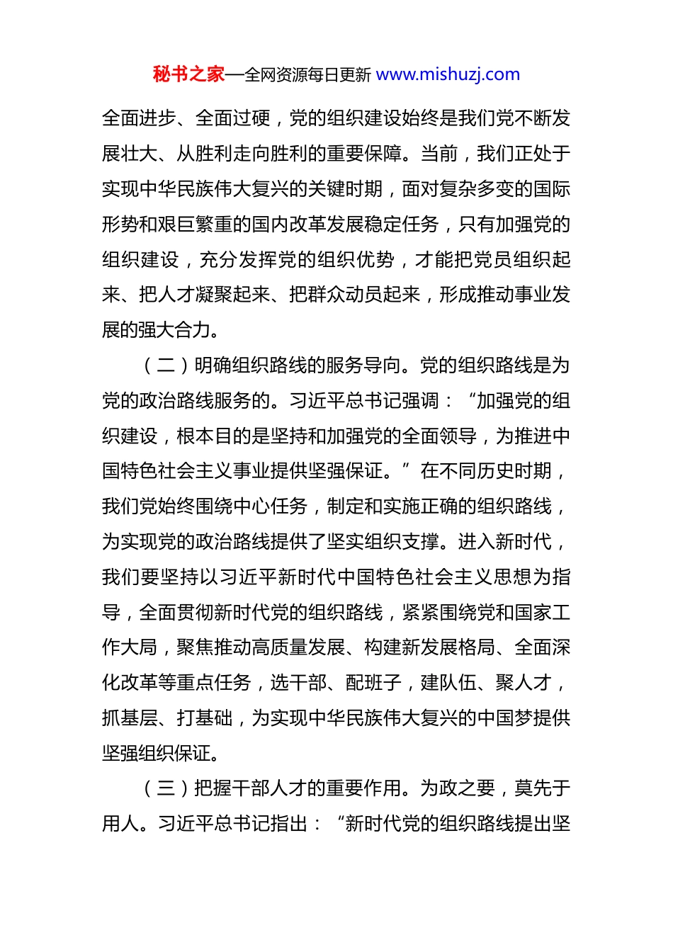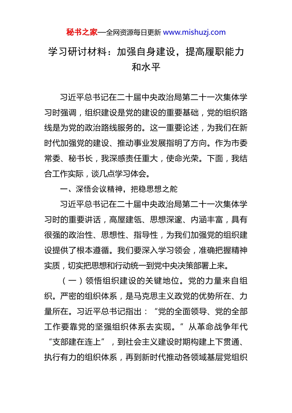 秘书之家—全网资源每日更新 www.mishuzj.com学习研讨材料:加强自身建设,提高履职能力和水平 习近平总书记在二十届中央政治局第二十一次集体学习时强调,组织建设是党的建设的重要基础,党的组织路线是为党的政治路线服务的。这一重要论述,为我们在新时代加强党的建设、推动事业发展指明了方向。作为市委常委、秘书长,我深感责任重大,使命光荣。下面,我结合工作实际,谈几点学习体会。一、深悟会议精神,把稳思想之舵习近平总书记在二十届中央政治局第二十一次集体学习时的重要讲话,高屋建瓴、思想深邃、内涵丰富,具有很强的政治性、思想性、指导性,为我们加强党的组织建设提供了根本遵循。我们要深入学习领会,准确把握精神实质,切实把思想和行动统一到党中央决策部署上来。(一)领悟组织建设的关键地位。党的力量来自组织。严密的组织体系,是马克思主义政党的优势所在、力量所在。习近平总书记指出:“党的全面领导、党的全部工作要靠党的坚强组织体系去实现。”从革命战争年代“支部建在连上”,到社会主义建设时期构建上下贯通、执行有力的组织体系,再到新时代推动各领域基层党组织秘书之家—全网资源每日更新 www.mishuzj.com全面进步、全面过硬,党的组织建设始终是我们党不断发展壮大、从胜利走向胜利的重要保障。当前,我们正处于实现中华民族伟大复兴的关键时期,面对复杂多变的国际形势和艰巨繁重的国内改革发展稳定任务,只有加强党的组织建设,充分发挥党的组织优势,才能把党员组织起来、把人才凝聚起来、把群众动员起来,形成推动事业发展的强大合力。(二)明确组织路线的服务导向。党的组织路线是为党的政治路线服务的。习近平总书记强调:“加强党的组织建设,根本目的是坚持和加强党的全面领导,为推进中国特色社会主义事业提供坚强保证。”在不同历史时期,我们党始终围绕中心任务,制定和实施正确的组织路线,为实现党的政治路线提供了坚实组织支撑。进入新时代,我们要坚持以习近平新时代中国特色社会主义思想为指导,全面贯彻新时代党的组织路线,紧紧围绕党和国家工作大局,聚焦推动高质量发展、构建新发展格局、全面深化改革等重点任务,选干部、配班子,建队伍、聚人才,抓基层、打基础,为实现中华民族伟大复兴的中国梦提供坚强组织保证。(三)把握干部人才的重要作用。为政之要,莫先于用人。习近平总书记指出:“新时代党的组织路线提出坚秘书之家—全网资源每日更新 www.mishuzj.com持德才兼备、以德为先、任人唯贤的方针,就是强调选干部、用人才既要重品德,也不能忽视才干。”干部是党的事业的骨干,人才是实现民族振兴、赢得国际竞争主动的战略资源。我们要树立正确选人用人导向,坚持把政治标准放在首位,突出实干实绩,大力选拔任用忠诚干净担当的高素质干部。要深化人才发展体制机制改革,聚天下英才而用之,为各类人才施展才华提供广阔舞台,让更多千里马在神州大地竞相奔腾。二、紧扣工作实际,践行使命担当作为市委常委、秘书长,我将紧密结合工作实际,把学习贯彻习近平总书记重要讲话精神转化为推动工作的强大动力,努力在加强党的组织建设、服务中心大局中展现新作为、作出新贡献。(一)强化政治引领,筑牢忠诚根基。一是坚定政治信仰。深入学习习近平新时代中国特色社会主义思想,深刻领悟“两个确立”的决定性意义,增强“四个意识”、坚定“四个自信”、做到“两个维护”,始终在思想上政治上行动上同以习近平同志为核心的党中央保持高度一致。二是严守政治纪律。严格遵守党的政治纪律和政治规矩,自觉维护党中央权威和集中统一领导,坚决贯彻执行党中央决策部署和市委工作要求,做到令行禁止、政令畅秘书之家—全网资源每日更新 www.mishuzj.com通。三是提高政治能力。加强政治历练,提高政治判断力、政治领悟力、政治执行力,善于从政治上分析问题、解决问题,确保各项工作始终沿着正确政治方向前进。(二)加强组织建设,提升整体效能。一是完善组织体系。按照党中央关于加强党的组织体系建设的部署要求,推动各级党组织健全组织、优化设置、理顺关系,构建上下贯通、执行有力的严密组织体系。加强市委机关党...