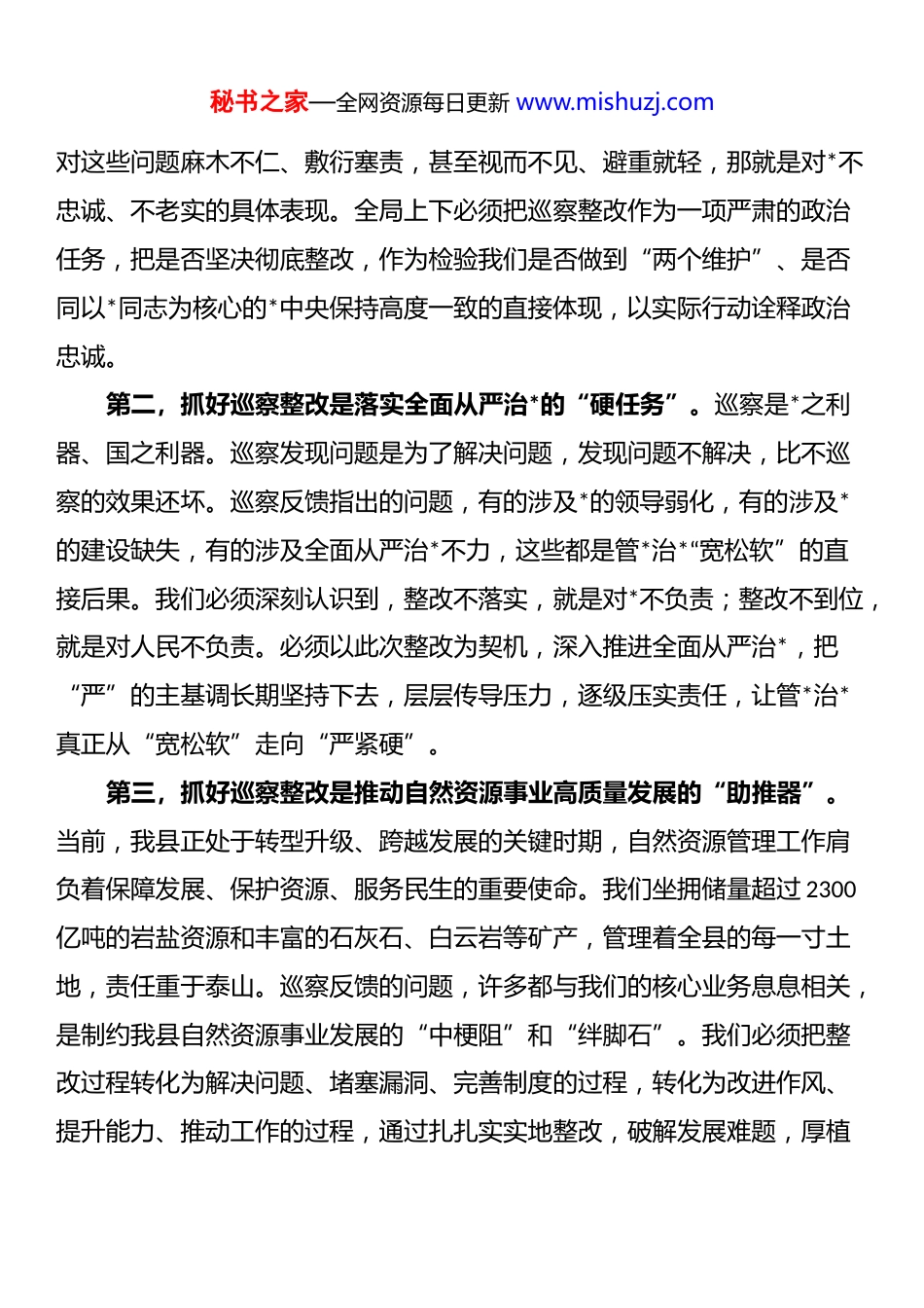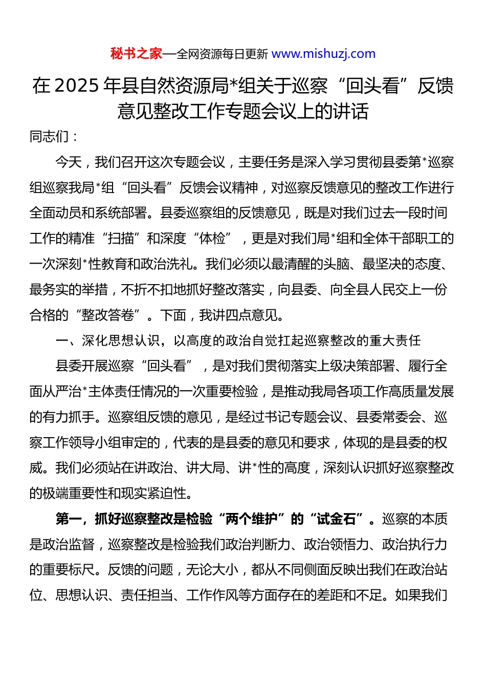 秘书之家—全网资源每日更新 www.mishuzj.com在 2025 年县自然资源局*组关于巡察“回头看”反馈意见整改工作专题会议上的讲话同志们:今天,我们召开这次专题会议,主要任务是深入学习贯彻县委第*巡察组巡察我局*组“回头看”反馈会议精神,对巡察反馈意见的整改工作进行全面动员和系统部署。县委巡察组的反馈意见,既是对我们过去一段时间工作的精准“扫描”和深度“体检”,更是对我们局*组和全体干部职工的一次深刻*性教育和政治洗礼。我们必须以最清醒的头脑、最坚决的态度、最务实的举措,不折不扣地抓好整改落实,向县委、向全县人民交上一份合格的“整改答卷”。下面,我讲四点意见。一、深化思想认识,以高度的政治自觉扛起巡察整改的重大责任县委开展巡察“回头看”,是对我们贯彻落实上级决策部署、履行全面从严治*主体责任情况的一次重要检验,是推动我局各项工作高质量发展的有力抓手。巡察组反馈的意见,是经过书记专题会议、县委常委会、巡察工作领导小组审定的,代表的是县委的意见和要求,体现的是县委的权威。我们必须站在讲政治、讲大局、讲*性的高度,深刻认识抓好巡察整改的极端重要性和现实紧迫性。第一,抓好巡察整改是检验“两个维护”的“试金石”。巡察的本质是政治监督,巡察整改是检验我们政治判断力、政治领悟力、政治执行力的重要标尺。反馈的问题,无论大小,都从不同侧面反映出我们在政治站位、思想认识、责任担当、工作作风等方面存在的差距和不足。如果我们秘书之家—全网资源每日更新 www.mishuzj.com对这些问题麻木不仁、敷衍塞责,甚至视而不见、避重就轻,那就是对*不忠诚、不老实的具体表现。全局上下必须把巡察整改作为一项严肃的政治任务,把是否坚决彻底整改,作为检验我们是否做到“两个维护”、是否同以*同志为核心的*中央保持高度一致的直接体现,以实际行动诠释政治忠诚。第二,抓好巡察整改是落实全面从严治*的“硬任务”。巡察是*之利器、国之利器。巡察发现问题是为了解决问题,发现问题不解决,比不巡察的效果还坏。巡察反馈指出的问题,有的涉及*的领导弱化,有的涉及*的建设缺失,有的涉及全面从严治*不力,这些都是管*治*“宽松软”的直接后果。我们必须深刻认识到,整改不落实,就是对*不负责;整改不到位,就是对人民不负责。必须以此次整改为契机,深入推进全面从严治*,把“严”的主基调长期坚持下去,层层传导压力,逐级压实责任,让管*治*真正从“宽松软”走向“严紧硬”。第三,抓好巡察整改是推动自然资源事业高质量发展的“助推器”。当前,我县正处于转型升级、跨越发展的关键时期,自然资源管理工作肩负着保障发展、保护资源、服务民生的重要使命。我们坐拥储量超过 2300亿吨的岩盐资源和丰富的石灰石、白云岩等矿产,管理着全县的每一寸土地,责任重于泰山。巡察反馈的问题,许多都与我们的核心业务息息相关,是制约我县自然资源事业发展的“中梗阻”和“绊脚石”。我们必须把整改过程转化为解决问题、堵塞漏洞、完善制度的过程,转化为改进作风、提升能力、推动工作的过程,通过扎扎实实地整改,破解发展难题,厚植秘书之家—全网资源每日更新 www.mishuzj.com发展优势,为*县经济社会高质量发展提供更加坚实的自然资源保障。二、坚持问题导向,以彻底的自我革命精神深挖问题根源县委第*巡察组反馈的意见实事求是、全面客观,指出的问题一针见血、切中要害,提出的建议对症下药、精准深刻。局*组完全赞同、诚恳接受、照单全收。会前,我们已经对反馈问题进行了初步梳理和对照分析,*组成员都主动认领、对号入座。我们不能仅仅满足于认领问题,更要透过现象看本质,从思想深处、制度层面、工作肌理上深挖问题产生的根源,真正做到举一反三、标本兼治。(一)在政治理论学习和贯彻落实上存在“温差”。巡察反馈指出我们“学习贯彻*的创新理论不够深入,与自然资源工作结合不够紧密”。反思根源,主要在于:一是思想认识不到位。部分同志满足于“学过了”“读过了”,但在“学懂弄通做实”上下的功夫不够,没有真正把蕴含其中的立场、观点、方法转化为谋划工作的思路、破解难题的本领。二是学用结合不紧密。...