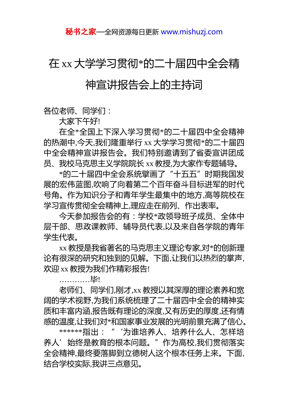 秘书之家—全网资源每日更新 www.mishuzj.com在 xx 大学学习贯彻*的二十届四中全会精神宣讲报告会上的主持词各位老师、同学们:大家下午好!在全*全国上下深入学习贯彻*的二十届四中全会精神的热潮中,今天,我们隆重举行 xx 大学学习贯彻*的二十届四中全会精神宣讲报告会。我们特别邀请到了省委宣讲团成员、我校马克思主义学院院长 xx 教授,为大家作专题辅导。*的二十届四中全会系统擘画了“十五五”时期我国发展的宏伟蓝图,吹响了向着第二个百年奋斗目标进军的时代号角。作为知识分子和青年学生最集中的地方,高等院校在学习宣传贯彻全会精神上,理应走在前列、作出表率。今天参加报告会的有:学校*政领导班子成员、全体中层干部、思政课教师、辅导员代表,以及来自各学院的青年学生代表。xx 教授是我省著名的马克思主义理论专家,对*的创新理论有很深的研究和独到的见解。下面,让我们以热烈的掌声,欢迎 xx 教授为我们作精彩报告!…………毕!老师们、同学们,刚才,xx 教授以其深厚的理论素养和宽阔的学术视野,为我们系统梳理了二十届四中全会的精神实质和丰富内涵,报告既有理论的深度,又有历史的厚度,还有情感的温度,让我们对*和国家事业发展的光明前景充满了信心。******指出:“‘为谁培养人、培养什么人、怎样培养人’始终是教育的根本问题。”作为高校,我们贯彻落实全会精神,最终要落脚到立德树人这个根本任务上来。下面,结合学校实际,我讲三点意见。秘书之家—全网资源每日更新 www.mishuzj.com一、在理论武装上持续深化,筑牢青年学生理想信念之基。高校是*的意识形态工作前沿阵地。各级*组织、各学院要将学习宣传贯彻二十届四中全会精神作为当前思政工作的重中之重。马克思主义学院要发挥主力军作用,第一时间推动全会精神进教材、进课堂、进头脑,开发一批高质量的教学课件和理论文章。宣传部要统筹校内各类媒体资源,开设专题专栏,形成线上线下联动的立体化宣传格局。要组织青年宣讲团、博士生讲师团,用青年的视角、青年的话语,向广大学生讲清楚“十五五”规划与个人成长的关系,引导广大青年学生深刻感悟*的创新理论的真理力量和实践伟力,坚定不移听*话、跟*走。二、在科研创新上主动作为,服务国家高水平科技自立自强。二十届四中全会把科技创新摆在了前所未有的战略高度。作为国家战略科技力量的重要组成部分,我们 xx 大学必须主动担当、奋发有为。各理工科学院和重点实验室,要紧密对接“十五五”规划建议中明确的重大战略需求,调整优化科研主攻方向。要聚焦新一代信息技术、高端装备、生物技术等前沿领域,敢于挑战“卡脖子”难题,努力产出一批原创性、引领性的高水平科研成果。学校将进一步深化科研体制机制改革,完善以创新价值、能力、贡献为导向的评价体系,为科研人员潜心研究、攻坚克难创造更好条件,为实现国家高水平科技自立自强贡献 xx 大学的智慧和力量。三、在人才培养上精准发力,为中国式现代化建设输送栋梁之才。全会描绘的宏伟蓝图,需要一代又一代的奋斗者去实现。我们的根本任务就是培养担当民族复兴大任的时代新人。各学院要结合“十五五”规划对人才的新需求,动态调整学科专业设置和人才培养方案,着力培养学生的创新精神和实践能力。要鼓励和支持广大学生积极投身社会实践,到祖国最需要的地方去建功立业。******曾寄语青年,“新时代的中国青年,生逢其时、重任在肩,施展才干的舞台无比广阔,实现梦想的前景无比光明。”希望同学们把个人理想秘书之家—全网资源每日更新 www.mishuzj.com融入*和国家事业之中,刻苦学习、增长本领,努力成为可堪大用、能担重任的栋梁之才,在全面建设社会主义现代化国家的新征程中,书写无愧于时代的青春华章。今天的报告会到此结束,谢谢大家!
