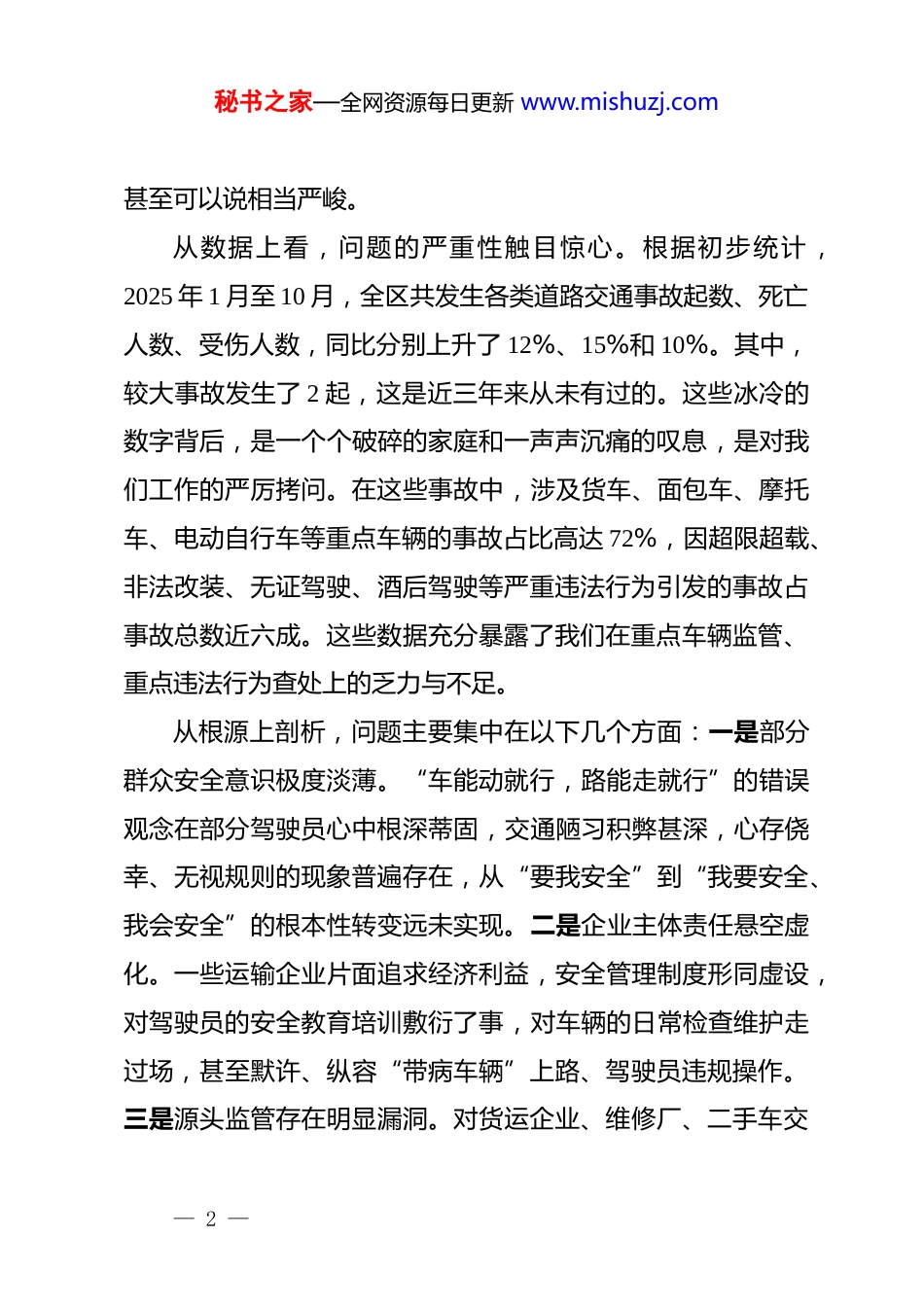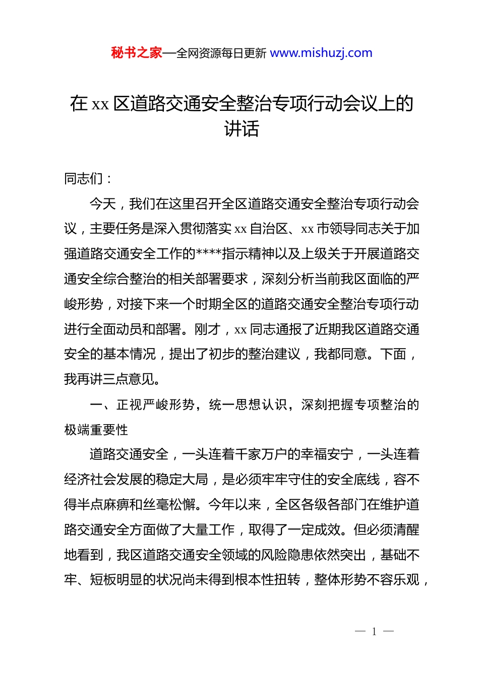 秘书之家—全网资源每日更新 www.mishuzj.com在 xx 区道路交通安全整治专项行动会议上的讲话同志们:今天,我们在这里召开全区道路交通安全整治专项行动会议,主要任务是深入贯彻落实 xx 自治区、xx 市领导同志关于加强道路交通安全工作的****指示精神以及上级关于开展道路交通安全综合整治的相关部署要求,深刻分析当前我区面临的严峻形势,对接下来一个时期全区的道路交通安全整治专项行动进行全面动员和部署。刚才,xx 同志通报了近期我区道路交通安全的基本情况,提出了初步的整治建议,我都同意。下面,我再讲三点意见。一、正视严峻形势,统一思想认识,深刻把握专项整治的极端重要性道路交通安全,一头连着千家万户的幸福安宁,一头连着经济社会发展的稳定大局,是必须牢牢守住的安全底线,容不得半点麻痹和丝毫松懈。今年以来,全区各级各部门在维护道路交通安全方面做了大量工作,取得了一定成效。但必须清醒地看到,我区道路交通安全领域的风险隐患依然突出,基础不牢、短板明显的状况尚未得到根本性扭转,整体形势不容乐观,— 1 —秘书之家—全网资源每日更新 www.mishuzj.com甚至可以说相当严峻。从数据上看,问题的严重性触目惊心。根据初步统计 ,2025 年 1 月至 10 月,全区共发生各类道路交通事故起数、死亡人数、受伤人数,同比分别上升了 12%、15%和 10%。其中,较大事故发生了 2 起,这是近三年来从未有过的。这些冰冷的数字背后,是一个个破碎的家庭和一声声沉痛的叹息,是对我们工作的严厉拷问。在这些事故中,涉及货车、面包车、摩托车、电动自行车等重点车辆的事故占比高达 72%,因超限超载、非法改装、无证驾驶、酒后驾驶等严重违法行为引发的事故占事故总数近六成。这些数据充分暴露了我们在重点车辆监管、重点违法行为查处上的乏力与不足。从根源上剖析,问题主要集中在以下几个方面:一是部分群众安全意识极度淡薄。“车能动就行,路能走就行”的错误观念在部分驾驶员心中根深蒂固,交通陋习积弊甚深,心存侥幸、无视规则的现象普遍存在,从“要我安全”到“我要安全、我会安全”的根本性转变远未实现。二是企业主体责任悬空虚化。一些运输企业片面追求经济利益,安全管理制度形同虚设,对驾驶员的安全教育培训敷衍了事,对车辆的日常检查维护走过场,甚至默许、纵容“带病车辆”上路、驾驶员违规操作。三是源头监管存在明显漏洞。对货运企业、维修厂、二手车交— 2 —秘书之家—全网资源每日更新 www.mishuzj.com易市场的联合监管机制还不健全,未能形成有效闭环,导致非法改装、拼装车辆等问题屡禁不绝,从源头上为事故埋下了巨大隐患。四是道路基础设施仍有欠账。部分城乡结合部、国省道穿村过镇路段的安全设施不完善,标志标线不清、防护栏缺失、人车混行等问题突出,道路安全保障水平亟待提升。同志们,每一个数字的背后都是血的教训,每一次事故的发生都在冲击着社会稳定的底线。如果这种局面不能得到迅速扭转,我们不仅无法向 xx 市委、市政府和全区人民交代,更将严重影响我区来之不易的发展环境和整体形象。因此,开展这次全区范围的道路交通安全整治专项行动,既是贯彻上级决策部署的政治要求,也是保障人民群众生命财产安全的迫切需要,更是推动我区经济社会高质量发展的必然选择。全区上下必须立即警醒起来,深刻认识到当前形势的极端严峻性、开展专项整治的极端重要性和现实紧迫性,以“时时放心不下”的责任感,采取超常决心、超常举措、超常力度,坚决打赢这场硬仗,迅速扭转被动局面。二、聚焦关键环节,实施精准发力,全面掀起专项整治的强大攻势此次专项行动,任务艰巨,时间紧迫。必须坚持问题导向、目标导向、结果导向,摒弃“大水漫灌”式的粗放管理,实施— 3 —秘书之家—全网资源每日更新 www.mishuzj.com“精准滴灌”式的靶向治疗。各单位、各部门要紧紧围绕以下四个关键环节,集中优势兵力,发起凌厉攻势。第一,紧盯源头,铁腕治理,坚决堵塞安全监管漏洞。事故的根源在隐患,隐患的源头在管理。必须把源头治理作为重中之重,实现全链条、穿透式监管。交通、交警、市场监管等部门要立即组建...