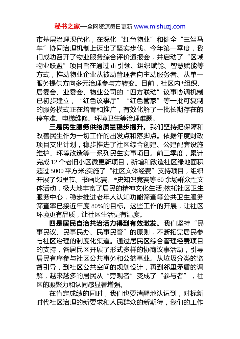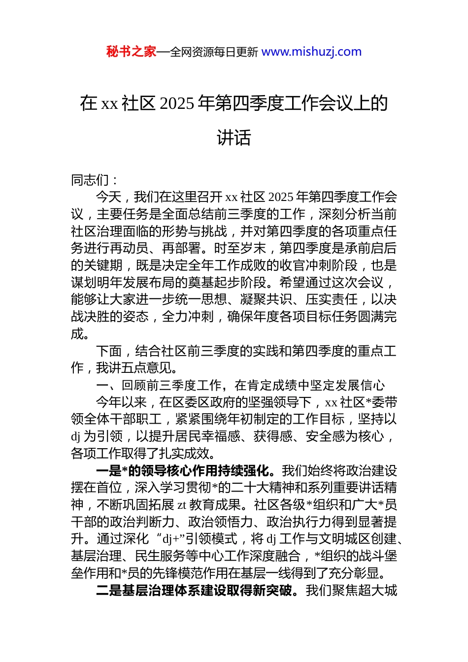 秘书之家—全网资源每日更新 www.mishuzj.com在 xx 社区 2025 年第四季度工作会议上的讲话同志们:今天,我们在这里召开 xx 社区 2025 年第四季度工作会议,主要任务是全面总结前三季度的工作,深刻分析当前社区治理面临的形势与挑战,并对第四季度的各项重点任务进行再动员、再部署。时至岁末,第四季度是承前启后的关键期,既是决定全年工作成败的收官冲刺阶段,也是谋划明年发展布局的奠基起步阶段。希望通过这次会议,能够让大家进一步统一思想、凝聚共识、压实责任,以决战决胜的姿态,全力冲刺,确保年度各项目标任务圆满完成。下面,结合社区前三季度的实践和第四季度的重点工作,我讲五点意见。一、回顾前三季度工作,在肯定成绩中坚定发展信心今年以来,在区委区政府的坚强领导下,xx 社区*委带领全体干部职工,紧紧围绕年初制定的工作目标,坚持以dj 为引领,以提升居民幸福感、获得感、安全感为核心,各项工作取得了扎实成效。一是*的领导核心作用持续强化。我们始终将政治建设摆在首位,深入学习贯彻*的二十大精神和系列重要讲话精神,不断巩固拓展 zt 教育成果。社区各级*组织和广大*员干部的政治判断力、政治领悟力、政治执行力得到显著提升。通过深化“dj+”引领模式,将 dj 工作与文明城区创建、基层治理、民生服务等中心工作深度融合,*组织的战斗堡垒作用和*员的先锋模范作用在基层一线得到了充分彰显。二是基层治理体系建设取得新突破。我们聚焦超大城秘书之家—全网资源每日更新 www.mishuzj.com市基层治理现代化,在深化“红色物业”和健全“三驾马车”协同治理机制上迈出了坚实步伐。今年第一季度,我们成功召开了物业服务综合评价通报会,并启动了“区域物业联盟”项目旨在通过 dj 引领、组织赋能、智慧赋能等方式,推动物业企业从被动管理者向主动服务者、从单一服务提供方向多元治理参与方转变。目前,社区内*组织、居委会、业委会、物业公司的“四方联动”议事协调机制已初步建立,“红色议事厅”“红色管家”等一批可复制的服务模式正在培育和推广,有效化解了一批长期存在的停车难、电梯维修、环境卫生等治理难题。三是民生服务供给质量稳步提升。我们坚持把保障和改善民生作为一切工作的出发点和落脚点。依据年度财政项目支出计划,稳步推进了社区综合创建、公建配套设施维护、环境改造等一系列民生实事项目。前三季度,累计完成 12 个老旧小区微更新项目,新增和改造社区绿地面积超过 5000 平方米;实施了“社区文体经费”支持项目,组织开展了邻里节、书画比赛、*史知识竞赛等 60 余场群众性文体活动,极大地丰富了居民的精神文化生活;依托社区卫生服务中心,稳步推进老年人认知功能筛查等公共卫生服务筛查率已接近年度 80%的目标。这些工作的开展,让社区环境更有品质,让社区生活更有温度。四是居民自治共治活力得到有效激发。我们坚持“民事民议、民事民办、民事民管”的原则,不断拓宽居民参与社区治理的制度化渠道。通过居民区综合管理经费项目的支持,各居民区开展了形式多样的协商议事活动,引导居民有序参与社区公共事务和公益事业。从垃圾分类的监督引导,到社区公共空间的规划设计,再到邻里矛盾的调解,越来越多的居民从“旁观者”变成了“参与者”,社区的凝聚力和认同感显著增强。在肯定成绩的同时,我们也要清醒地认识到,对标新时代社区治理的新要求和人民群众的新期待,我们的工作秘书之家—全网资源每日更新 www.mishuzj.com还存在一些短板和不足。比如,多元共治的协同性仍需加强,“三驾马车”协同运行中偶有权责不清、步调不一的问题;居民参与的广度和深度还有待拓展,部分居民的“主人翁”意识仍需进一步唤醒;服务的精准化水平有待提高,距离真正实现从“大水漫灌”到“精准滴灌”的转变还有差距;一些深层次、历史性的矛盾纠纷化解难度较大,需要更有力的制度和机制支撑。对于这些问题,我们必须高度重视,在第四季度的工作中采取有效措施,切实加以解决。二、聚焦第四季度任务,以决战姿态打好全年收官之战第四季度是全年工作的冲刺阶段,任务艰巨,责任重大。社区上下要迅速行动起来,对照年度目...