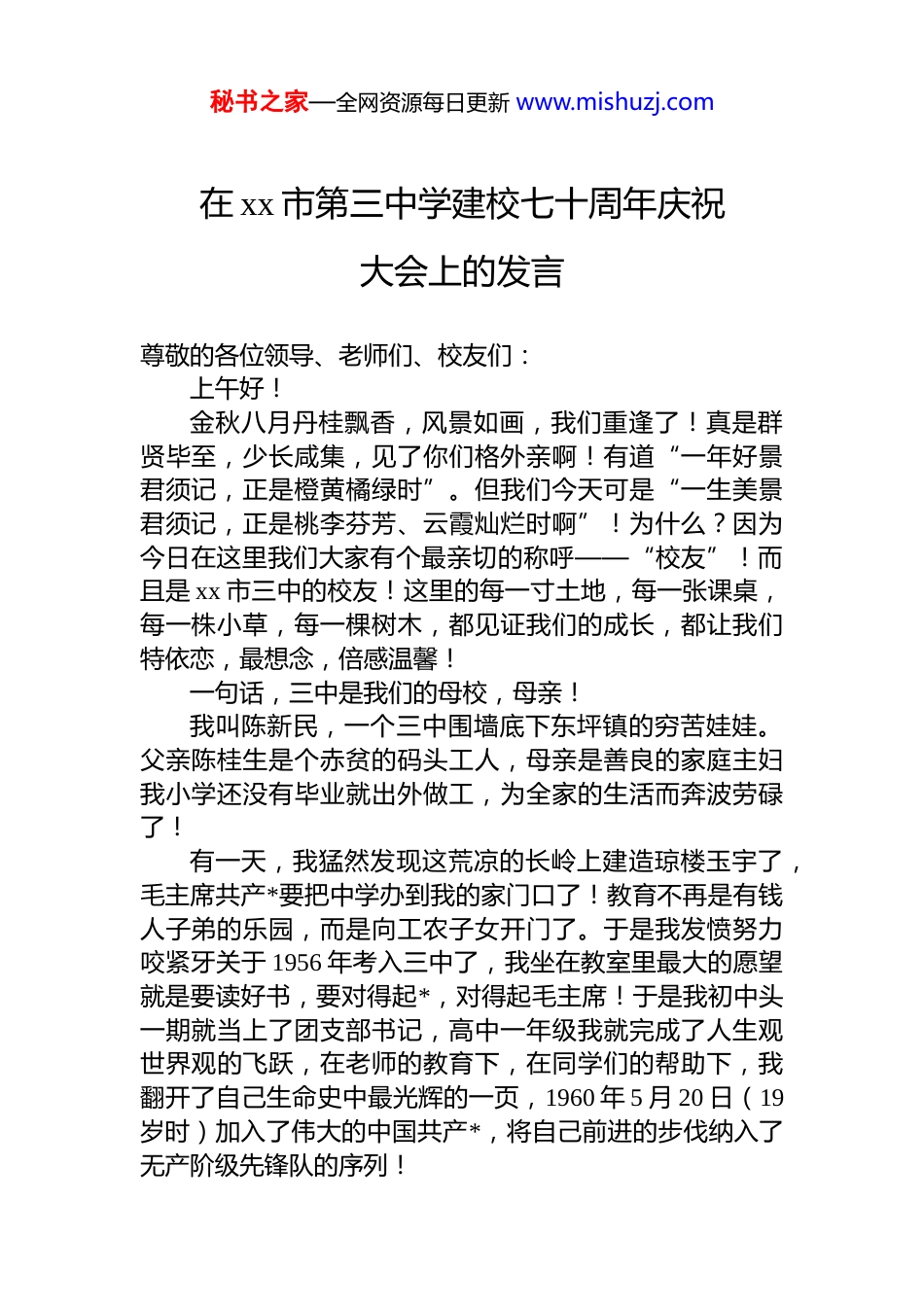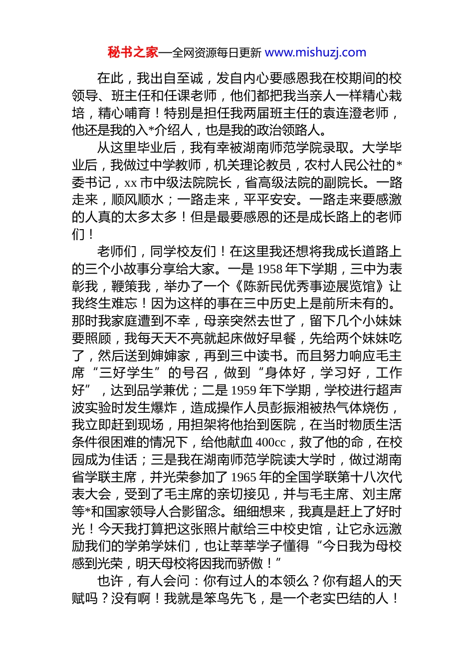 秘书之家—全网资源每日更新 www.mishuzj.com在 xx 市第三中学建校七十周年庆祝大会上的发言尊敬的各位领导、老师们、校友们:上午好!金秋八月丹桂飘香,风景如画,我们重逢了!真是群贤毕至,少长咸集,见了你们格外亲啊!有道“一年好景君须记,正是橙黄橘绿时”。但我们今天可是“一生美景君须记,正是桃李芬芳、云霞灿烂时啊”!为什么?因为今日在这里我们大家有个最亲切的称呼——“校友”!而且是 xx 市三中的校友!这里的每一寸土地,每一张课桌,每一株小草,每一棵树木,都见证我们的成长,都让我们特依恋,最想念,倍感温馨!一句话,三中是我们的母校,母亲!我叫陈新民,一个三中围墙底下东坪镇的穷苦娃娃。父亲陈桂生是个赤贫的码头工人,母亲是善良的家庭主妇我小学还没有毕业就出外做工,为全家的生活而奔波劳碌了!有一天,我猛然发现这荒凉的长岭上建造琼楼玉宇了,毛主席共产*要把中学办到我的家门口了!教育不再是有钱人子弟的乐园,而是向工农子女开门了。于是我发愤努力咬紧牙关于 1956 年考入三中了,我坐在教室里最大的愿望就是要读好书,要对得起*,对得起毛主席!于是我初中头一期就当上了团支部书记,高中一年级我就完成了人生观世界观的飞跃,在老师的教育下,在同学们的帮助下,我翻开了自己生命史中最光辉的一页,1960 年 5 月 20 日(19岁时)加入了伟大的中国共产*,将自己前进的步伐纳入了无产阶级先锋队的序列!秘书之家—全网资源每日更新 www.mishuzj.com在此,我出自至诚,发自内心要感恩我在校期间的校领导、班主任和任课老师,他们都把我当亲人一样精心栽培,精心哺育!特别是担任我两届班主任的袁连澄老师,他还是我的入*介绍人,也是我的政治领路人。从这里毕业后,我有幸被湖南师范学院录取。大学毕业后,我做过中学教师,机关理论教员,农村人民公社的*委书记,xx 市中级法院院长,省高级法院的副院长。一路走来,顺风顺水;一路走来,平平安安。一路走来要感激的人真的太多太多!但是最要感恩的还是成长路上的老师们!老师们,同学校友们!在这里我还想将我成长道路上的三个小故事分享给大家。一是 1958 年下学期,三中为表彰我,鞭策我,举办了一个《陈新民优秀事迹展览馆》让我终生难忘!因为这样的事在三中历史上是前所未有的。那时我家庭遭到不幸,母亲突然去世了,留下几个小妹妹要照顾,我每天天不亮就起床做好早餐,先给两个妹妹吃了,然后送到婶婶家,再到三中读书。而且努力响应毛主席“三好学生”的号召,做到“身体好,学习好,工作好”,达到品学兼优;二是 1959 年下学期,学校进行超声波实验时发生爆炸,造成操作人员彭振湘被热气体烧伤,我立即赶到现场,用担架将他抬到医院,在当时物质生活条件很困难的情况下,给他献血 400cc,救了他的命,在校园成为佳话;三是我在湖南师范学院读大学时,做过湖南省学联主席,并光荣参加了 1965 年的全国学联第十八次代表大会,受到了毛主席的亲切接见,并与毛主席、刘主席等*和国家领导人合影留念。细细想来,我真是赶上了好时光!今天我打算把这张照片献给三中校史馆,让它永远激励我们的学弟学妹们,也让莘莘学子懂得“今日我为母校感到光荣,明天母校将因我而骄傲!”也许,有人会问:你有过人的本领么?你有超人的天赋吗?没有啊!我就是笨鸟先飞,是一个老实巴结的人!秘书之家—全网资源每日更新 www.mishuzj.com老实人,天不负!我就是听*的话,听老师的话,得意不忘形,失败不气馁!这次校庆回到母校,学校变化很大,我亲眼见证了母校已具备一支高素质的领导管理团队及师资队伍,亲眼见证了母校在硬件设施与教育理念上的飞跃。哎呀!树老根多,人老话多。今天太兴奋了!想说的太多了!太多了!就让我们打开记忆闸,共感三中恩,回首青春美,活出精气神吧!祝我的母校三中明天更辉煌!