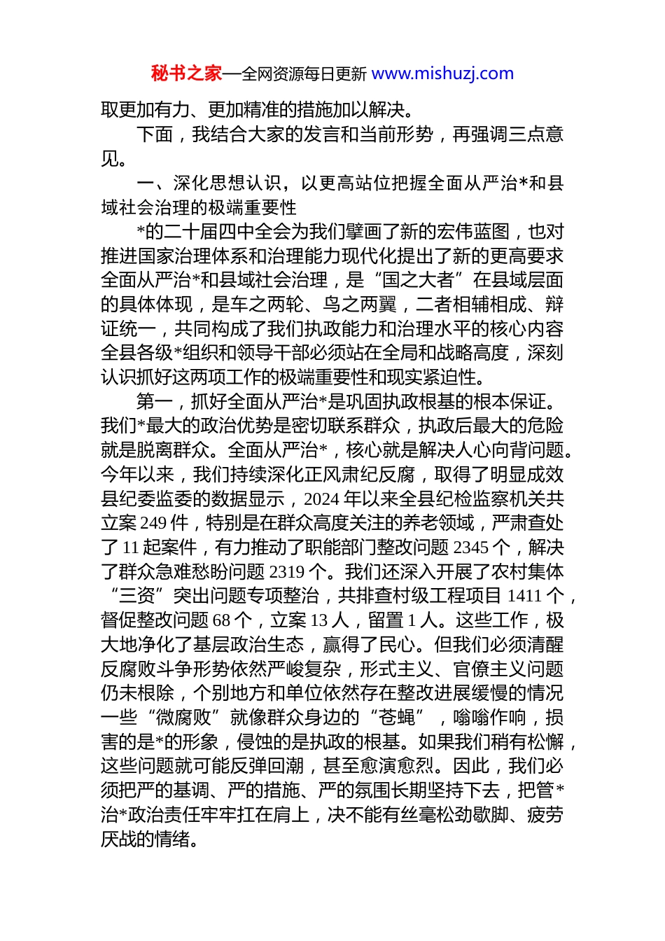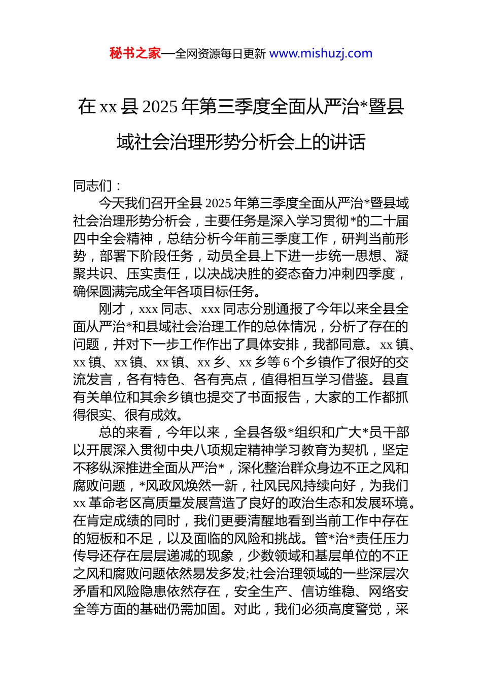 秘书之家—全网资源每日更新 www.mishuzj.com在 xx 县 2025 年第三季度全面从严治*暨县域社会治理形势分析会上的讲话同志们:今天我们召开全县 2025 年第三季度全面从严治*暨县域社会治理形势分析会,主要任务是深入学习贯彻*的二十届四中全会精神,总结分析今年前三季度工作,研判当前形势,部署下阶段任务,动员全县上下进一步统一思想、凝聚共识、压实责任,以决战决胜的姿态奋力冲刺四季度,确保圆满完成全年各项目标任务。刚才,xxx 同志、xxx 同志分别通报了今年以来全县全面从严治*和县域社会治理工作的总体情况,分析了存在的问题,并对下一步工作作出了具体安排,我都同意。xx 镇、xx 镇、xx 镇、xx 镇、xx 乡、xx 乡等 6 个乡镇作了很好的交流发言,各有特色、各有亮点,值得相互学习借鉴。县直有关单位和其余乡镇也提交了书面报告,大家的工作都抓得很实、很有成效。总的来看,今年以来,全县各级*组织和广大*员干部以开展深入贯彻中央八项规定精神学习教育为契机,坚定不移纵深推进全面从严治*,深化整治群众身边不正之风和腐败问题,*风政风焕然一新,社风民风持续向好,为我们xx 革命老区高质量发展营造了良好的政治生态和发展环境。在肯定成绩的同时,我们更要清醒地看到当前工作中存在的短板和不足,以及面临的风险和挑战。管*治*责任压力传导还存在层层递减的现象,少数领域和基层单位的不正之风和腐败问题依然易发多发;社会治理领域的一些深层次矛盾和风险隐患依然存在,安全生产、信访维稳、网络安全等方面的基础仍需加固。对此,我们必须高度警觉,采秘书之家—全网资源每日更新 www.mishuzj.com取更加有力、更加精准的措施加以解决。下面,我结合大家的发言和当前形势,再强调三点意见。一、深化思想认识,以更高站位把握全面从严治*和县域社会治理的极端重要性*的二十届四中全会为我们擘画了新的宏伟蓝图,也对推进国家治理体系和治理能力现代化提出了新的更高要求全面从严治*和县域社会治理,是“国之大者”在县域层面的具体体现,是车之两轮、鸟之两翼,二者相辅相成、辩证统一,共同构成了我们执政能力和治理水平的核心内容全县各级*组织和领导干部必须站在全局和战略高度,深刻认识抓好这两项工作的极端重要性和现实紧迫性。第一,抓好全面从严治*是巩固执政根基的根本保证。我们*最大的政治优势是密切联系群众,执政后最大的危险就是脱离群众。全面从严治*,核心就是解决人心向背问题。今年以来,我们持续深化正风肃纪反腐,取得了明显成效县纪委监委的数据显示,2024 年以来全县纪检监察机关共立案 249 件,特别是在群众高度关注的养老领域,严肃查处了 11 起案件,有力推动了职能部门整改问题 2345 个,解决了群众急难愁盼问题 2319 个。我们还深入开展了农村集体“三资”突出问题专项整治,共排查村级工程项目 1411 个,督促整改问题 68 个,立案 13 人,留置 1 人。这些工作,极大地净化了基层政治生态,赢得了民心。但我们必须清醒反腐败斗争形势依然严峻复杂,形式主义、官僚主义问题仍未根除,个别地方和单位依然存在整改进展缓慢的情况一些“微腐败”就像群众身边的“苍蝇”,嗡嗡作响,损害的是*的形象,侵蚀的是执政的根基。如果我们稍有松懈,这些问题就可能反弹回潮,甚至愈演愈烈。因此,我们必须把严的基调、严的措施、严的氛围长期坚持下去,把管*治*政治责任牢牢扛在肩上,决不能有丝毫松劲歇脚、疲劳厌战的情绪。秘书之家—全网资源每日更新 www.mishuzj.com第二,抓好县域社会治理是推动高质量发展的必然要求。发展是第一要务,稳定是第一责任。一个地方如果社会秩序混乱、安全事故频发、矛盾纠纷不断,就不可能有好的发展环境,再好的发展蓝图也只能是空中楼阁。当前我们正处在转型发展的关键时期,各种新旧矛盾交织叠加对我们的治理能力提出了前所未有的考验。我们欣喜地看到,在全县上下的共同努力下,我们的社会治理水平在稳步提升。生态环保工作成效显著,空气质量优良天数比例和水质达标率持续保持高位;安全生产形势总体平稳,县委县政府多次召开专题会议部署,持续开展督导检查,压实各...