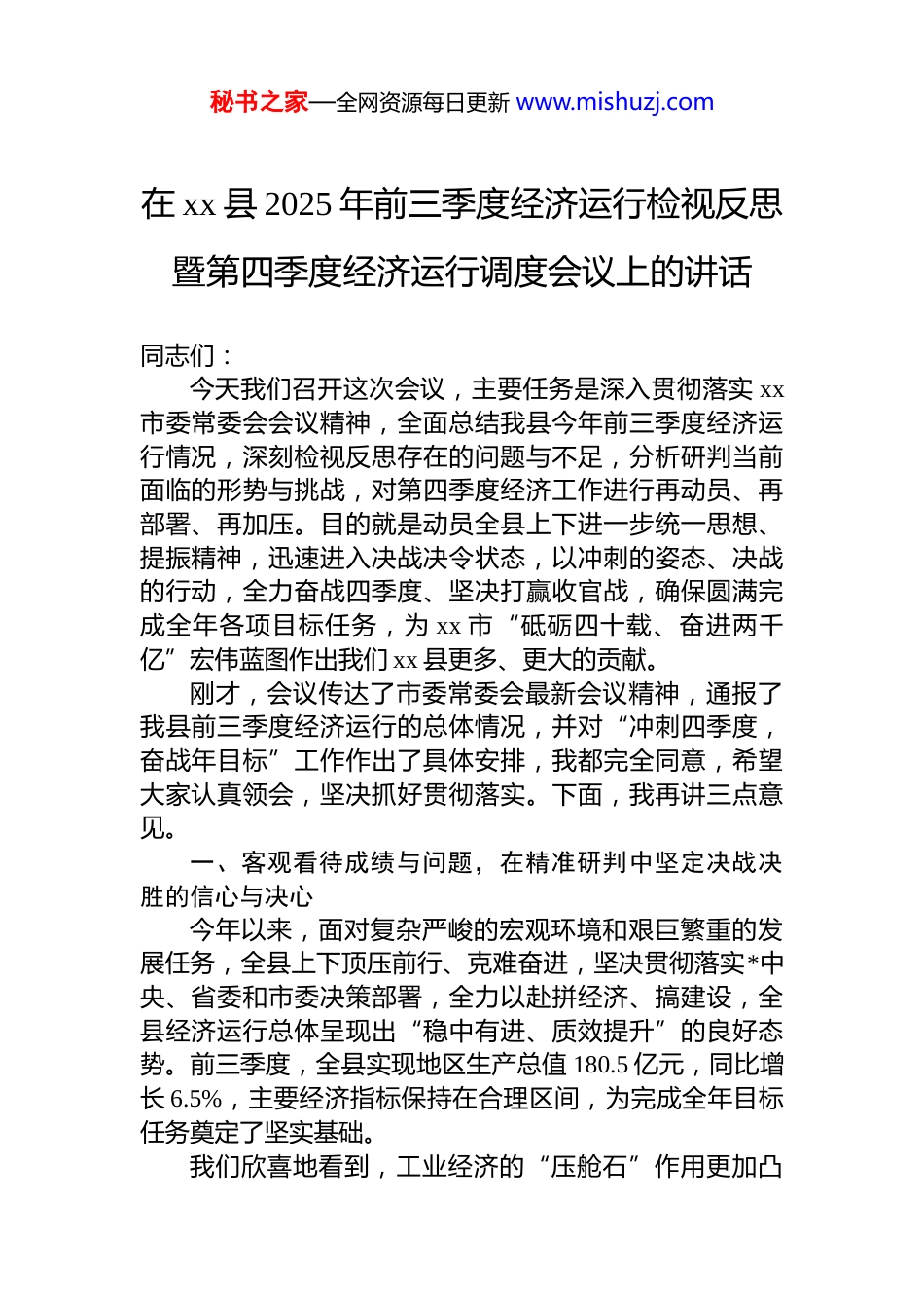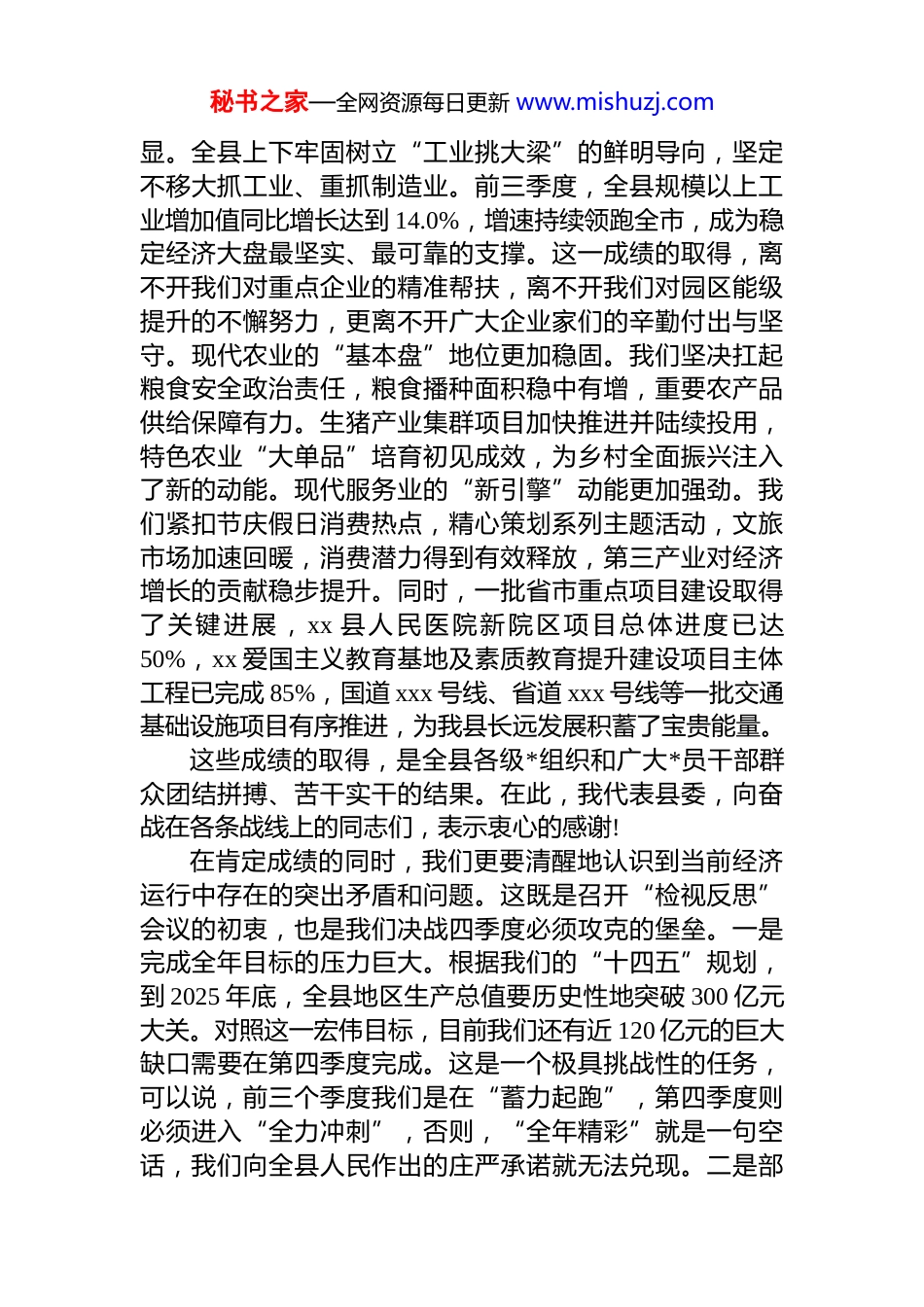 秘书之家—全网资源每日更新 www.mishuzj.com在 xx 县 2025 年前三季度经济运行检视反思暨第四季度经济运行调度会议上的讲话同志们:今天我们召开这次会议,主要任务是深入贯彻落实 xx市委常委会会议精神,全面总结我县今年前三季度经济运行情况,深刻检视反思存在的问题与不足,分析研判当前面临的形势与挑战,对第四季度经济工作进行再动员、再部署、再加压。目的就是动员全县上下进一步统一思想、提振精神,迅速进入决战决令状态,以冲刺的姿态、决战的行动,全力奋战四季度、坚决打赢收官战,确保圆满完成全年各项目标任务,为 xx 市“砥砺四十载、奋进两千亿”宏伟蓝图作出我们 xx 县更多、更大的贡献。刚才,会议传达了市委常委会最新会议精神,通报了我县前三季度经济运行的总体情况,并对“冲刺四季度,奋战年目标”工作作出了具体安排,我都完全同意,希望大家认真领会,坚决抓好贯彻落实。下面,我再讲三点意见。一、客观看待成绩与问题,在精准研判中坚定决战决胜的信心与决心今年以来,面对复杂严峻的宏观环境和艰巨繁重的发展任务,全县上下顶压前行、克难奋进,坚决贯彻落实*中央、省委和市委决策部署,全力以赴拼经济、搞建设,全县经济运行总体呈现出“稳中有进、质效提升”的良好态势。前三季度,全县实现地区生产总值 180.5 亿元,同比增长 6.5%,主要经济指标保持在合理区间,为完成全年目标任务奠定了坚实基础。我们欣喜地看到,工业经济的“压舱石”作用更加凸秘书之家—全网资源每日更新 www.mishuzj.com显。全县上下牢固树立“工业挑大梁”的鲜明导向,坚定不移大抓工业、重抓制造业。前三季度,全县规模以上工业增加值同比增长达到 14.0%,增速持续领跑全市,成为稳定经济大盘最坚实、最可靠的支撑。这一成绩的取得,离不开我们对重点企业的精准帮扶,离不开我们对园区能级提升的不懈努力,更离不开广大企业家们的辛勤付出与坚守。现代农业的“基本盘”地位更加稳固。我们坚决扛起粮食安全政治责任,粮食播种面积稳中有增,重要农产品供给保障有力。生猪产业集群项目加快推进并陆续投用,特色农业“大单品”培育初见成效,为乡村全面振兴注入了新的动能。现代服务业的“新引擎”动能更加强劲。我们紧扣节庆假日消费热点,精心策划系列主题活动,文旅市场加速回暖,消费潜力得到有效释放,第三产业对经济增长的贡献稳步提升。同时,一批省市重点项目建设取得了关键进展,xx 县人民医院新院区项目总体进度已达50%,xx 爱国主义教育基地及素质教育提升建设项目主体工程已完成 85%,国道 xxx 号线、省道 xxx 号线等一批交通基础设施项目有序推进,为我县长远发展积蓄了宝贵能量。这些成绩的取得,是全县各级*组织和广大*员干部群众团结拼搏、苦干实干的结果。在此,我代表县委,向奋战在各条战线上的同志们,表示衷心的感谢!在肯定成绩的同时,我们更要清醒地认识到当前经济运行中存在的突出矛盾和问题。这既是召开“检视反思”会议的初衷,也是我们决战四季度必须攻克的堡垒。一是完成全年目标的压力巨大。根据我们的“十四五”规划,到 2025 年底,全县地区生产总值要历史性地突破 300 亿元大关。对照这一宏伟目标,目前我们还有近 120 亿元的巨大缺口需要在第四季度完成。这是一个极具挑战性的任务,可以说,前三个季度我们是在“蓄力起跑”,第四季度则必须进入“全力冲刺”,否则,“全年精彩”就是一句空话,我们向全县人民作出的庄严承诺就无法兑现。二是部秘书之家—全网资源每日更新 www.mishuzj.com分关键指标增长乏力。从通报的情况看,我们在固定资产投资、社会消费品零售总额等领域的增速不及预期,与兄弟县(区)相比存在一定差距。这反映出我们的项目储备和转化效率有待提高,消费场景创新和消费能力提振的力度仍需加强。有效投资不足,是未来增长的最大隐患;消费恢复偏慢,是经济循环的最大堵点。三是发展中的风险挑战不容忽视。安全生产的警钟必须长鸣,部分领域依然存在风险隐患;地方金融风险防范、政府债务化解任务艰巨;在征地拆迁、环境保护、民生保障等领域,一些历史遗留的矛盾和群众反映强烈的问题还需要我...