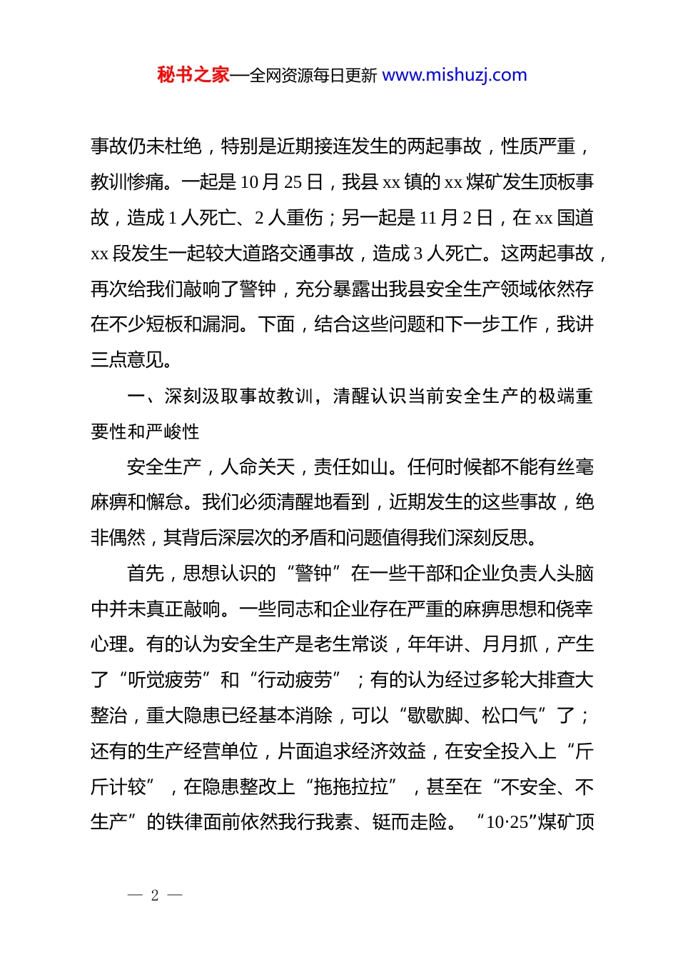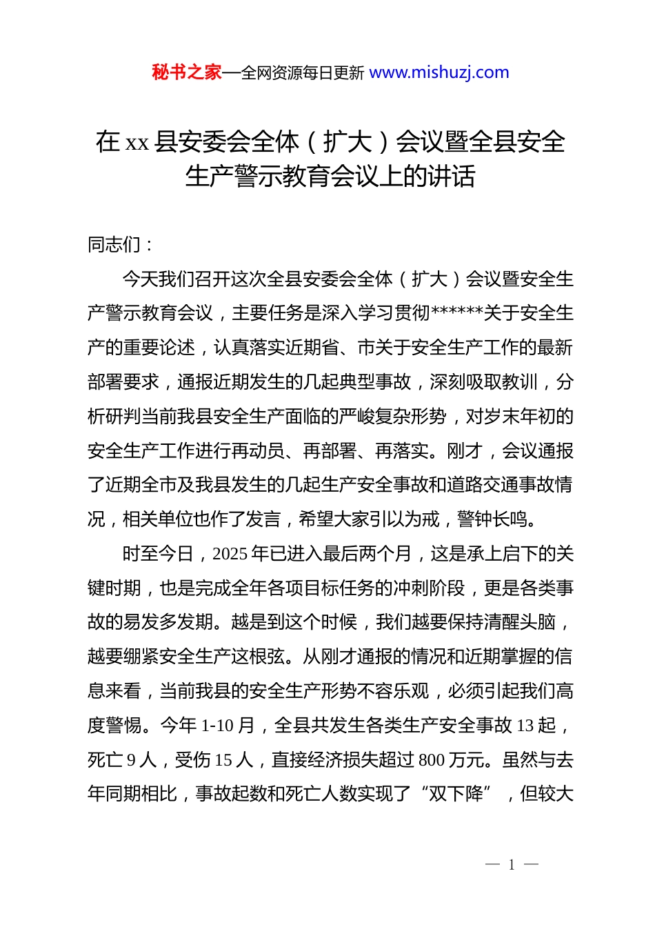 秘书之家—全网资源每日更新 www.mishuzj.com在 xx 县安委会全体(扩大)会议暨全县安全生产警示教育会议上的讲话同志们:今天我们召开这次全县安委会全体(扩大)会议暨安全生产警示教育会议,主要任务是深入学习贯彻******关于安全生产的重要论述,认真落实近期省、市关于安全生产工作的最新部署要求,通报近期发生的几起典型事故,深刻吸取教训,分析研判当前我县安全生产面临的严峻复杂形势,对岁末年初的安全生产工作进行再动员、再部署、再落实。刚才,会议通报了近期全市及我县发生的几起生产安全事故和道路交通事故情况,相关单位也作了发言,希望大家引以为戒,警钟长鸣。时至今日,2025 年已进入最后两个月,这是承上启下的关键时期,也是完成全年各项目标任务的冲刺阶段,更是各类事故的易发多发期。越是到这个时候,我们越要保持清醒头脑,越要绷紧安全生产这根弦。从刚才通报的情况和近期掌握的信息来看,当前我县的安全生产形势不容乐观,必须引起我们高度警惕。今年 1-10 月,全县共发生各类生产安全事故 13 起,死亡 9 人,受伤 15 人,直接经济损失超过 800 万元。虽然与去年同期相比,事故起数和死亡人数实现了“双下降”,但较大— 1 —秘书之家—全网资源每日更新 www.mishuzj.com事故仍未杜绝,特别是近期接连发生的两起事故,性质严重,教训惨痛。一起是 10 月 25 日,我县 xx 镇的 xx 煤矿发生顶板事故,造成 1 人死亡、2 人重伤;另一起是 11 月 2 日,在 xx 国道xx 段发生一起较大道路交通事故,造成 3 人死亡。这两起事故,再次给我们敲响了警钟,充分暴露出我县安全生产领域依然存在不少短板和漏洞。下面,结合这些问题和下一步工作,我讲三点意见。一、深刻汲取事故教训,清醒认识当前安全生产的极端重要性和严峻性安全生产,人命关天,责任如山。任何时候都不能有丝毫麻痹和懈怠。我们必须清醒地看到,近期发生的这些事故,绝非偶然,其背后深层次的矛盾和问题值得我们深刻反思。首先,思想认识的“警钟”在一些干部和企业负责人头脑中并未真正敲响。一些同志和企业存在严重的麻痹思想和侥幸心理。有的认为安全生产是老生常谈,年年讲、月月抓,产生了“听觉疲劳”和“行动疲劳”;有的认为经过多轮大排查大整治,重大隐患已经基本消除,可以“歇歇脚、松口气”了;还有的生产经营单位,片面追求经济效益,在安全投入上“斤斤计较”,在隐患整改上“拖拖拉拉”,甚至在“不安全、不生产”的铁律面前依然我行我素、铤而走险。“10·25”煤矿顶— 2 —秘书之家—全网资源每日更新 www.mishuzj.com板事故的发生,就是企业安全生产主体责任悬空、现场管理混乱、违规冒险作业的典型后果。这种思想上的“跑偏”和“缺位”,是安全生产最大的隐患。其次,责任落实的“链条”在一些环节上存在明显的“断点”和“堵点”。安全生产责任体系的“四梁八柱”虽然已经建立,但“上热中温下冷”的现象依然突出。从领导责任看,有的领导干部对分管行业领域的安全风险底数不清、情况不明,检查工作“走马观花”,满足于开了会、发了文,对工作的实际效果缺乏跟踪问效。从部门监管责任看,“管行业必须管安全、管业务必须管安全、管生产经营必须管安全”的要求还没有完全落到实处,个别部门之间存在推诿扯皮现象,监管执法“宽松软”,对违法违规行为打击不力,未能形成有效震慑。从企业主体责任看,部分企业安全管理制度形同虚设,安全培训“走过场”,应急演练“假把式”,一线员工的“三违”行为屡禁不止。企业主要负责人作为安全生产第一责任人的责任意识淡薄,安全生产的压力未能有效传导到“最后一公里”。再次,隐患排查的“筛子”在一些领域织得不够严密,风险管控存在盲区。当前,我县正处于转型发展的关键时期,新旧风险交织叠加,安全生产的复杂性、艰巨性前所未有。我们必须准确把握安全生产的新特点、新变化。— 3 —秘书之家—全网资源每日更新 www.mishuzj.com在煤矿领域,随着保供任务加重,部分煤矿超能力、超强度、超定员组织生产的冲动强烈,采掘接续紧张、安全管理混乱的问题凸显。特别是部分停产整顿...