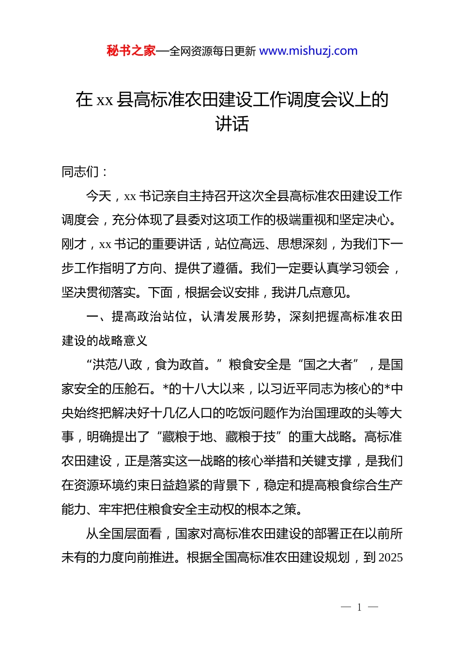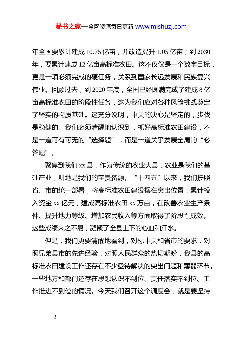 秘书之家—全网资源每日更新 www.mishuzj.com在 xx 县高标准农田建设工作调度会议上的讲话同志们:今天,xx 书记亲自主持召开这次全县高标准农田建设工作调度会,充分体现了县委对这项工作的极端重视和坚定决心。刚才,xx 书记的重要讲话,站位高远、思想深刻,为我们下一步工作指明了方向、提供了遵循。我们一定要认真学习领会,坚决贯彻落实。下面,根据会议安排,我讲几点意见。一、提高政治站位,认清发展形势,深刻把握高标准农田建设的战略意义“洪范八政,食为政首。”粮食安全是“国之大者”,是国家安全的压舱石。*的十八大以来,以习近平同志为核心的*中央始终把解决好十几亿人口的吃饭问题作为治国理政的头等大事,明确提出了“藏粮于地、藏粮于技”的重大战略。高标准农田建设,正是落实这一战略的核心举措和关键支撑,是我们在资源环境约束日益趋紧的背景下,稳定和提高粮食综合生产能力、牢牢把住粮食安全主动权的根本之策。从全国层面看,国家对高标准农田建设的部署正在以前所未有的力度向前推进。根据全国高标准农田建设规划,到 2025— 1 —秘书之家—全网资源每日更新 www.mishuzj.com年全国要累计建成 10.75 亿亩,并改造提升 1.05 亿亩;到 2030年,要累计建成 12 亿亩高标准农田。这不仅仅是一个数字目标,更是一项必须完成的硬任务,关系到国家长远发展和民族复兴伟业。回顾过去,到 2020 年底,全国已经圆满完成了建成 8 亿亩高标准农田的阶段性任务,这为我们应对各种风险挑战奠定了坚实的物质基础。这充分说明,中央的决心是坚定的,步伐是稳健的。我们必须清醒地认识到,抓好高标准农田建设,不是一道可有可无的“选择题”,而是一道关乎发展全局的“必答题”。聚焦到我们 xx 县,作为传统的农业大县,农业是我们的基础产业,耕地是我们的宝贵资源。“十四五”以来,我们按照省、市的统一部署,将高标准农田建设摆在突出位置,累计投入资金 xx 亿元,建成高标准农田 xx 万亩,在改善农业生产条件、提升地力等级、增加农民收入等方面取得了阶段性成效。这些成绩来之不易,凝聚了全县上下的心血和汗水。但是,我们更要清醒地看到,对标中央和省市的要求,对照兄弟县市的先进经验,对照人民群众的热切期盼,我县的高标准农田建设工作还存在不少亟待解决的突出问题和薄弱环节。一些地方和部门还存在思想认识不到位、责任落实不到位、工作推进不到位的情况。今天我们召开这个调度会,就是要坚持— 2 —秘书之家—全网资源每日更新 www.mishuzj.com问题导向,把脉会诊、对症下药,动员全县上下以更高的标准、更严的要求、更实的举措,奋力开创我县高标准农田建设新局面,为全方位夯实粮食安全根基、加快推进农业农村现代化提供坚实支撑。二、坚持问题导向,聚焦关键环节,精准破解“谋、投、建、管、用”中的短板弱项xx 书记刚才强调,要聚焦“谋、投、建、管、用”找准问题、分析症结。这五个字,高度概括了高标准农田建设的全链条、全周期,是我们抓好这项工作的“纲”和“魂”。我们必须牢牢扭住这五个关键环节,逐一审视、逐项剖析,下大力气补齐短板、锻造长板。第一,在“谋”字上要突出科学性和前瞻性。科学规划是项目成功的前提。从前期的摸排情况和审计、督查反馈来看,我们一些项目在“谋”的环节就存在先天不足。有的项目规划设计脱离实际,对地形地貌、水源条件、土壤状况等基础因素研究不深不透,图上作业、闭门造车,导致工程方案与当地农业生产需求不匹配;有的项目公众参与度不高,在项目选址、方案设计等环节,没有充分听取和吸收村组干部、农民群众的意见,导致项目建成后群众不满意、不愿用。“凡事预则立,不预则废。”我们必须把规划设计作为项目建设的“第一道工— 3 —秘书之家—全网资源每日更新 www.mishuzj.com序”,坚决杜绝“先开工、后设计”或者“边设计、边施工”的现象。一要坚持规划先行。县农业农村、自然资源等部门要牵头,整合利用最新的国土空间规划、水利规划等成果,运用gis 等现代信息技术,对全县永久基本农田的现状进行一次全面“体检”,科学确定项目建设的区域布局、时序安排...
