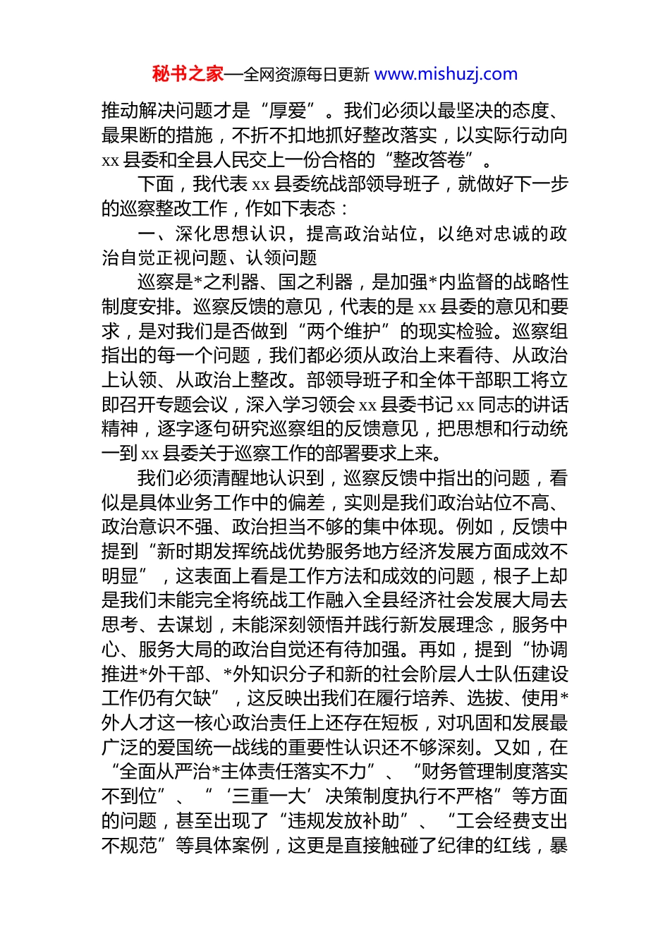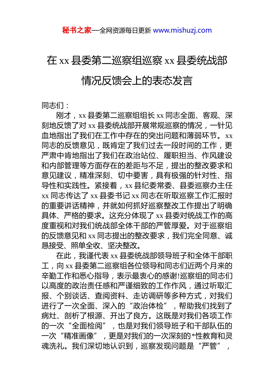 秘书之家—全网资源每日更新 www.mishuzj.com在 xx 县委第二巡察组巡察 xx 县委统战部情况反馈会上的表态发言同志们:刚才,xx 县委第二巡察组组长 xx 同志全面、客观、深刻地反馈了对 xx 县委统战部开展常规巡察的情况,一针见血地指出了我们在工作中存在的突出问题和薄弱环节。xx同志的反馈意见,既肯定了我们过去一段时间的工作,更严肃中肯地指出了我们在政治站位、履职担当、作风建设和内部管理等方面存在的差距与不足,提出的整改要求和意见建议,精准深刻、切中要害,具有极强的针对性、指导性和实践性。紧接着,xx 县纪委常委、县委巡察办主任xx 同志传达了 xx 县委书记 xx 同志在听取巡察工作汇报时的重要讲话精神,并就如何抓好巡察整改工作提出了明确具体、严格的要求。这充分体现了 xx 县委对统战工作的高度重视和对我们统战部全体干部的严管厚爱。对于巡察组的反馈意见和 xx 同志提出的整改要求,我们完全同意、诚恳接受、照单全收、坚决整改。在此,我谨代表 xx 县委统战部领导班子和全体干部职工,向 xx 县委第二巡察组各位领导和同志们近两个月来的辛勤工作和悉心指导,表示最衷心的感谢!巡察组的同志们以高度的政治责任感和严谨细致的工作作风,通过听取汇报、个别谈话、查阅资料、走访调研等多种方式,对我们进行了一次全面、深入的“政治体检”,帮助我们找到了病灶、剖析了根源、开出了良方。这既是对我们各项工作的一次“全面检阅”,也是对我们领导班子和干部队伍的一次“精准画像”,更是对我们的一次深刻的*性教育和灵魂洗礼。我们深切地认识到,巡察发现问题是“严管”,秘书之家—全网资源每日更新 www.mishuzj.com推动解决问题才是“厚爱”。我们必须以最坚决的态度、最果断的措施,不折不扣地抓好整改落实,以实际行动向xx 县委和全县人民交上一份合格的“整改答卷”。下面,我代表 xx 县委统战部领导班子,就做好下一步的巡察整改工作,作如下表态:一、深化思想认识,提高政治站位,以绝对忠诚的政治自觉正视问题、认领问题巡察是*之利器、国之利器,是加强*内监督的战略性制度安排。巡察反馈的意见,代表的是 xx 县委的意见和要求,是对我们是否做到“两个维护”的现实检验。巡察组指出的每一个问题,我们都必须从政治上来看待、从政治上认领、从政治上整改。部领导班子和全体干部职工将立即召开专题会议,深入学习领会 xx 县委书记 xx 同志的讲话精神,逐字逐句研究巡察组的反馈意见,把思想和行动统一到 xx 县委关于巡察工作的部署要求上来。我们必须清醒地认识到,巡察反馈中指出的问题,看似是具体业务工作中的偏差,实则是我们政治站位不高、政治意识不强、政治担当不够的集中体现。例如,反馈中提到“新时期发挥统战优势服务地方经济发展方面成效不明显”,这表面上看是工作方法和成效的问题,根子上却是我们未能完全将统战工作融入全县经济社会发展大局去思考、去谋划,未能深刻领悟并践行新发展理念,服务中心、服务大局的政治自觉还有待加强。再如,提到“协调推进*外干部、*外知识分子和新的社会阶层人士队伍建设工作仍有欠缺”,这反映出我们在履行培养、选拔、使用*外人才这一核心政治责任上还存在短板,对巩固和发展最广泛的爱国统一战线的重要性认识还不够深刻。又如,在“全面从严治*主体责任落实不力”、“财务管理制度落实不到位”、“‘三重一大’决策制度执行不严格”等方面的问题,甚至出现了“违规发放补助”、“工会经费支出不规范”等具体案例,这更是直接触碰了纪律的红线,暴秘书之家—全网资源每日更新 www.mishuzj.com露出我们管*治*“宽松软”的倾向,主体责任意识淡薄,制度执行缺乏刚性约束,对干部队伍的日常教育监督管理失之于宽、失之于软。这些问题的产生,根源在于我们对新时代*的建设总要求和全面从严治*新形势新任务的理解不深、把握不准,在于我们自我革命的精神不足,满足于过往的成绩,对存在的问题产生了麻痹思想。对此,我们绝不回避、绝不遮掩绝不推诿。我们将把这次巡察整改作为一次加强*性锻炼、检验对*忠诚的重大政治考验,作为一次激浊扬清、改进工作作风的...