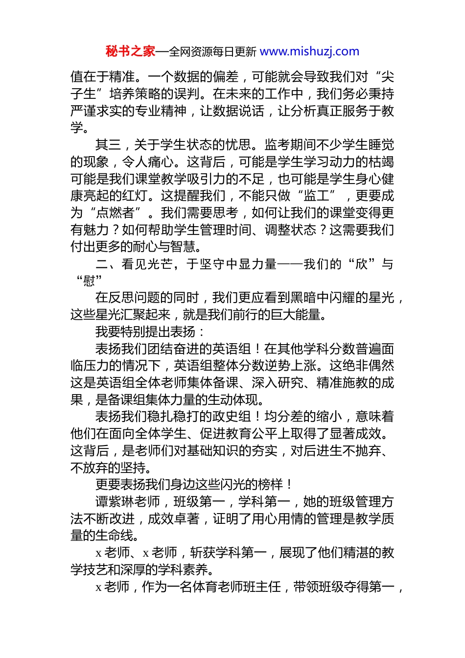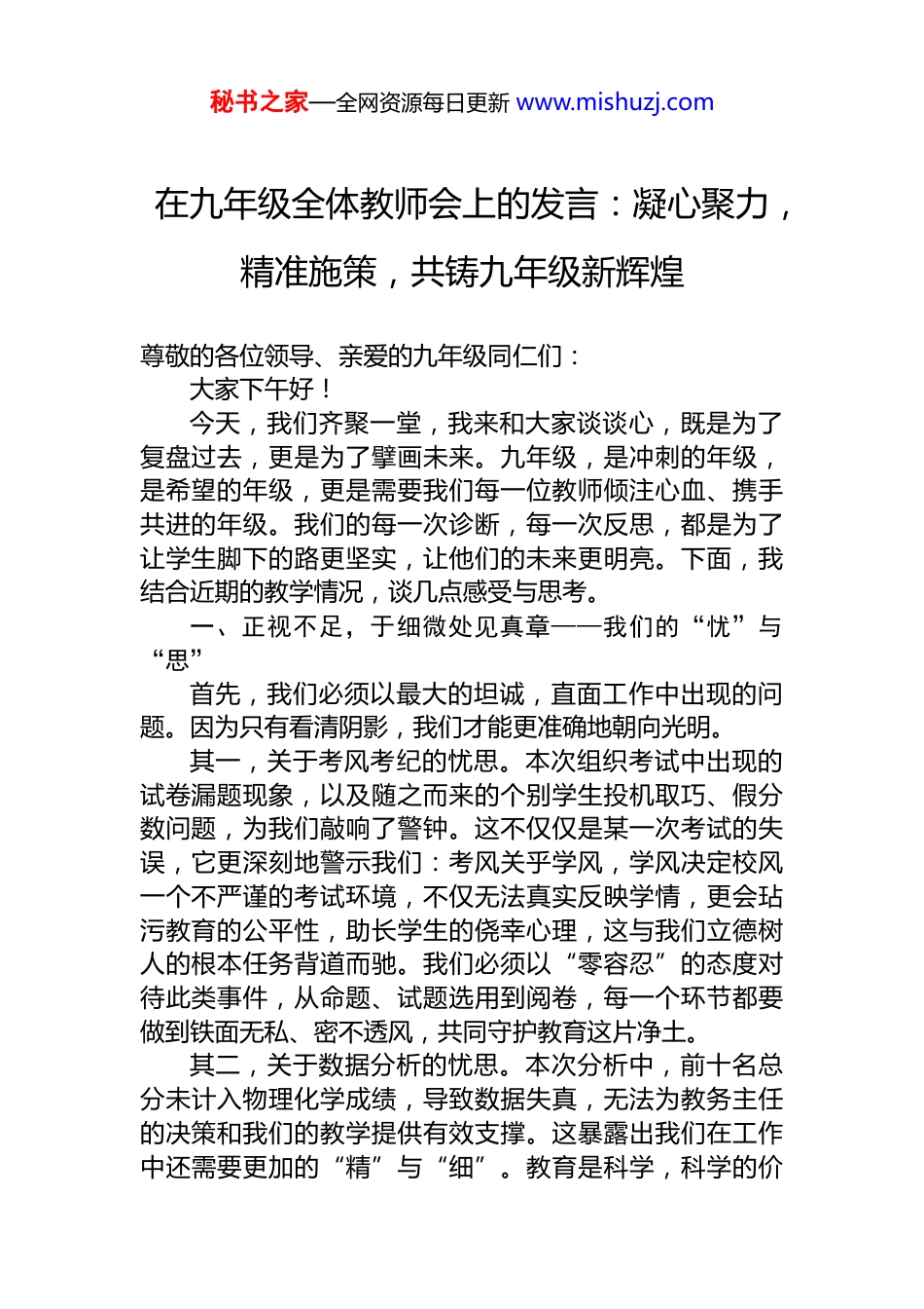 秘书之家—全网资源每日更新 www.mishuzj.com在九年级全体教师会上的发言:凝心聚力,精准施策,共铸九年级新辉煌尊敬的各位领导、亲爱的九年级同仁们:大家下午好!今天,我们齐聚一堂,我来和大家谈谈心,既是为了复盘过去,更是为了擘画未来。九年级,是冲刺的年级,是希望的年级,更是需要我们每一位教师倾注心血、携手共进的年级。我们的每一次诊断,每一次反思,都是为了让学生脚下的路更坚实,让他们的未来更明亮。下面,我结合近期的教学情况,谈几点感受与思考。一、正视不足,于细微处见真章——我们的“忧”与“思”首先,我们必须以最大的坦诚,直面工作中出现的问题。因为只有看清阴影,我们才能更准确地朝向光明。其一,关于考风考纪的忧思。本次组织考试中出现的试卷漏题现象,以及随之而来的个别学生投机取巧、假分数问题,为我们敲响了警钟。这不仅仅是某一次考试的失误,它更深刻地警示我们:考风关乎学风,学风决定校风一个不严谨的考试环境,不仅无法真实反映学情,更会玷污教育的公平性,助长学生的侥幸心理,这与我们立德树人的根本任务背道而驰。我们必须以“零容忍”的态度对待此类事件,从命题、试题选用到阅卷,每一个环节都要做到铁面无私、密不透风,共同守护教育这片净土。其二,关于数据分析的忧思。本次分析中,前十名总分未计入物理化学成绩,导致数据失真,无法为教务主任的决策和我们的教学提供有效支撑。这暴露出我们在工作中还需要更加的“精”与“细”。教育是科学,科学的价秘书之家—全网资源每日更新 www.mishuzj.com值在于精准。一个数据的偏差,可能就会导致我们对“尖子生”培养策略的误判。在未来的工作中,我们务必秉持严谨求实的专业精神,让数据说话,让分析真正服务于教学。其三,关于学生状态的忧思。监考期间不少学生睡觉的现象,令人痛心。这背后,可能是学生学习动力的枯竭可能是我们课堂教学吸引力的不足,也可能是学生身心健康亮起的红灯。这提醒我们,不能只做“监工”,更要成为“点燃者”。我们需要思考,如何让我们的课堂变得更有魅力?如何帮助学生管理时间、调整状态?这需要我们付出更多的耐心与智慧。二、看见光芒,于坚守中显力量——我们的“欣”与“慰”在反思问题的同时,我们更应看到黑暗中闪耀的星光,这些星光汇聚起来,就是我们前行的巨大能量。我要特别提出表扬:表扬我们团结奋进的英语组!在其他学科分数普遍面临压力的情况下,英语组整体分数逆势上涨。这绝非偶然这是英语组全体老师集体备课、深入研究、精准施教的成果,是备课组集体力量的生动体现。表扬我们稳扎稳打的政史组!均分差的缩小,意味着他们在面向全体学生、促进教育公平上取得了显著成效。这背后,是老师们对基础知识的夯实,对后进生不抛弃、不放弃的坚持。更要表扬我们身边这些闪光的榜样!谭紫琳老师,班级第一,学科第一,她的班级管理方法不断改进,成效卓著,证明了用心用情的管理是教学质量的生命线。x 老师、x 老师,斩获学科第一,展现了他们精湛的教学技艺和深厚的学科素养。x 老师,作为一名体育老师班主任,带领班级夺得第一,秘书之家—全网资源每日更新 www.mishuzj.com他用行动告诉我们:用心陪伴,就是最好的管理;人格魅力,就是最硬的班风。这些成绩和榜样,让我们有理由相信,只要我们心往一处想,劲往一处使,就没有克服不了的困难。当然,还有一群老师,他们无私奉献,默默耕耘,取得了很好的成绩,在此,不一一列举。三、明确方向,于共识中求突破——我们的“行”与“动”基于以上的“忧”与“欣”,我想提出三点建议,与大家共勉:第一,筑牢根基:班风正,学风浓。班主任是班级的灵魂,要更加尽心尽力,营造积极向上、公平竞争的班级氛围。同时,我要强调,每一位科任老师都不是孤岛,我们都是学生成长生态系统中不可或缺的一环。我们每个人都是独特而重要的自己,任何一个学科组都不能掉队。唯有同频共振,才能奏出最美的乐章。第二,聚焦课堂:备得精,练得实。课堂是我们的主阵地。我们要认真备课,实施分层教学,让优生吃得饱,后进生跟得上。我倡导“严谨点,少讲点,多练点,一课一得”的务实作风...