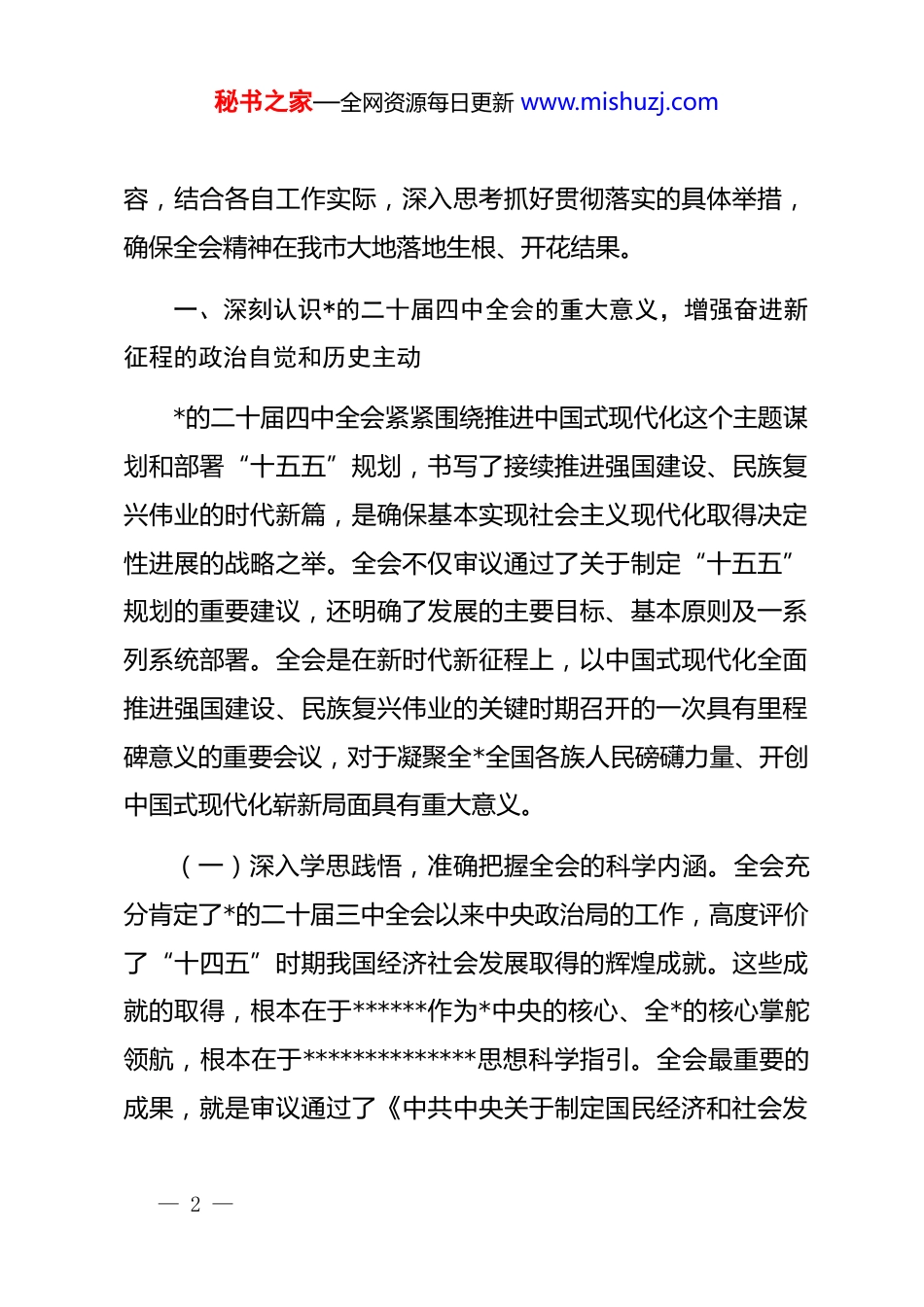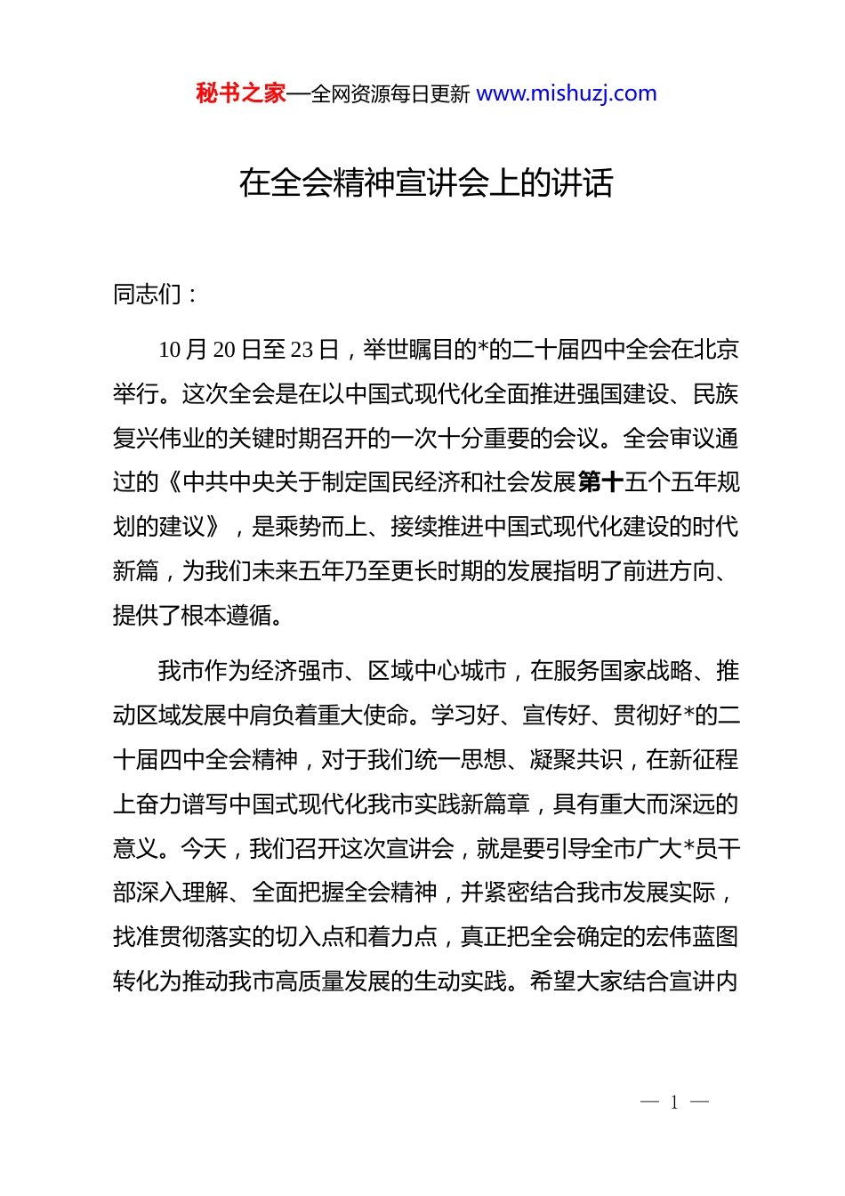 秘书之家—全网资源每日更新 www.mishuzj.com在全会精神宣讲会上的讲话同志们:10 月 20 日至 23 日,举世瞩目的*的二十届四中全会在北京举行。这次全会是在以中国式现代化全面推进强国建设、民族复兴伟业的关键时期召开的一次十分重要的会议。全会审议通过的《中共中央关于制定国民经济和社会发展第十五个五年规划的建议》,是乘势而上、接续推进中国式现代化建设的时代新篇,为我们未来五年乃至更长时期的发展指明了前进方向、提供了根本遵循。我市作为经济强市、区域中心城市,在服务国家战略、推动区域发展中肩负着重大使命。学习好、宣传好、贯彻好*的二十届四中全会精神,对于我们统一思想、凝聚共识,在新征程上奋力谱写中国式现代化我市实践新篇章,具有重大而深远的意义。今天,我们召开这次宣讲会,就是要引导全市广大*员干部深入理解、全面把握全会精神,并紧密结合我市发展实际,找准贯彻落实的切入点和着力点,真正把全会确定的宏伟蓝图转化为推动我市高质量发展的生动实践。希望大家结合宣讲内— 1 —秘书之家—全网资源每日更新 www.mishuzj.com容,结合各自工作实际,深入思考抓好贯彻落实的具体举措,确保全会精神在我市大地落地生根、开花结果。一、深刻认识*的二十届四中全会的重大意义,增强奋进新征程的政治自觉和历史主动*的二十届四中全会紧紧围绕推进中国式现代化这个主题谋划和部署“十五五”规划,书写了接续推进强国建设、民族复兴伟业的时代新篇,是确保基本实现社会主义现代化取得决定性进展的战略之举。全会不仅审议通过了关于制定“十五五”规划的重要建议,还明确了发展的主要目标、基本原则及一系列系统部署。全会是在新时代新征程上,以中国式现代化全面推进强国建设、民族复兴伟业的关键时期召开的一次具有里程碑意义的重要会议,对于凝聚全*全国各族人民磅礴力量、开创中国式现代化崭新局面具有重大意义。(一)深入学思践悟,准确把握全会的科学内涵。全会充分肯定了*的二十届三中全会以来中央政治局的工作,高度评价了“十四五”时期我国经济社会发展取得的辉煌成就。这些成就的取得,根本在于******作为*中央的核心、全*的核心掌舵领航,根本在于**************思想科学指引。全会最重要的成果,就是审议通过了《中共中央关于制定国民经济和社会发— 2 —秘书之家—全网资源每日更新 www.mishuzj.com展第十五个五年规划的建议》。******亲自担任文件起草组组长,全程擘画、精心指导,确保了《建议》的起草过程充分发扬民主、集思广益,集中了*内外智慧,凝聚了最广泛的发展共识。《建议》提出的一系列新思想、新观点、新部署,特别是关于“必须把因地制宜发展新质生产力摆在更加突出的战略位置”、“坚持以人民为中心的发展思想”、“统筹发展和安全”等重要论述,为我市在新发展阶段推动高质量发展、建设新时代社会主义现代化经济强市提供了行动指南。当前,我市正处于新旧动能转换的攻坚期、城市能级提升的关键期、高质量发展的机遇期。全会精神为我们破解发展难题、激发发展活力、厚植发展优势指明了路径。我们必须深刻认识到,贯彻落实全会精神,是我市践行“两个维护”、服务国家战略的必然要求,是推动经济强市高质量发展、提升城市综合竞争力的迫切需要,也是不断满足人民群众对美好生活向往的根本途径。(二)坚持历史主动,在新征程上续写“两大奇迹”新篇章。科学制定和接续实施五年规划,是我们*治国理政的重要经验和显著优势。全会深刻洞察世界之变、时代之变、历史之变,强调必须把发展新质生产力摆在更加突出的战略位置,这对于我市这样一座正致力于打造科创我市、智造我市的城市而言,— 3 —秘书之家—全网资源每日更新 www.mishuzj.com既是重大机遇,也是重大责任。我市拥有国家新一代人工智能创新发展试验区、国家量子科技研发中心等重大创新平台,在量子科技、人工智能、生物医药、空天信息等领域具备一定的先发优势。我们要深刻领会全会精神,将发展新质生产力作为推动高质量发展的首要任务和关键抓手,充分发挥科教资源富集、产业基础雄厚的优势,在科技创新引领、现代化产业体系建设等方面走在前列,...