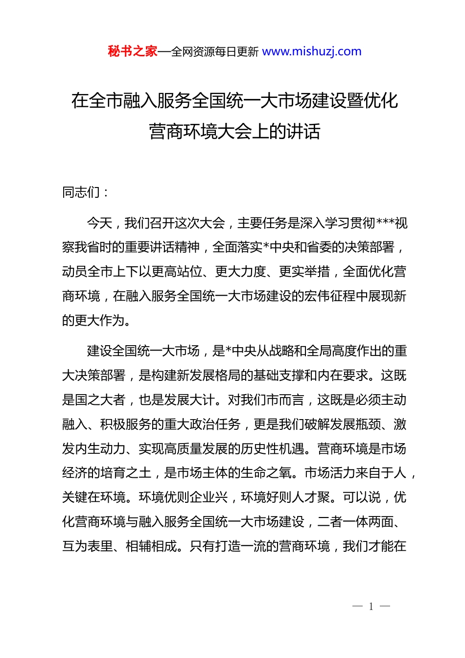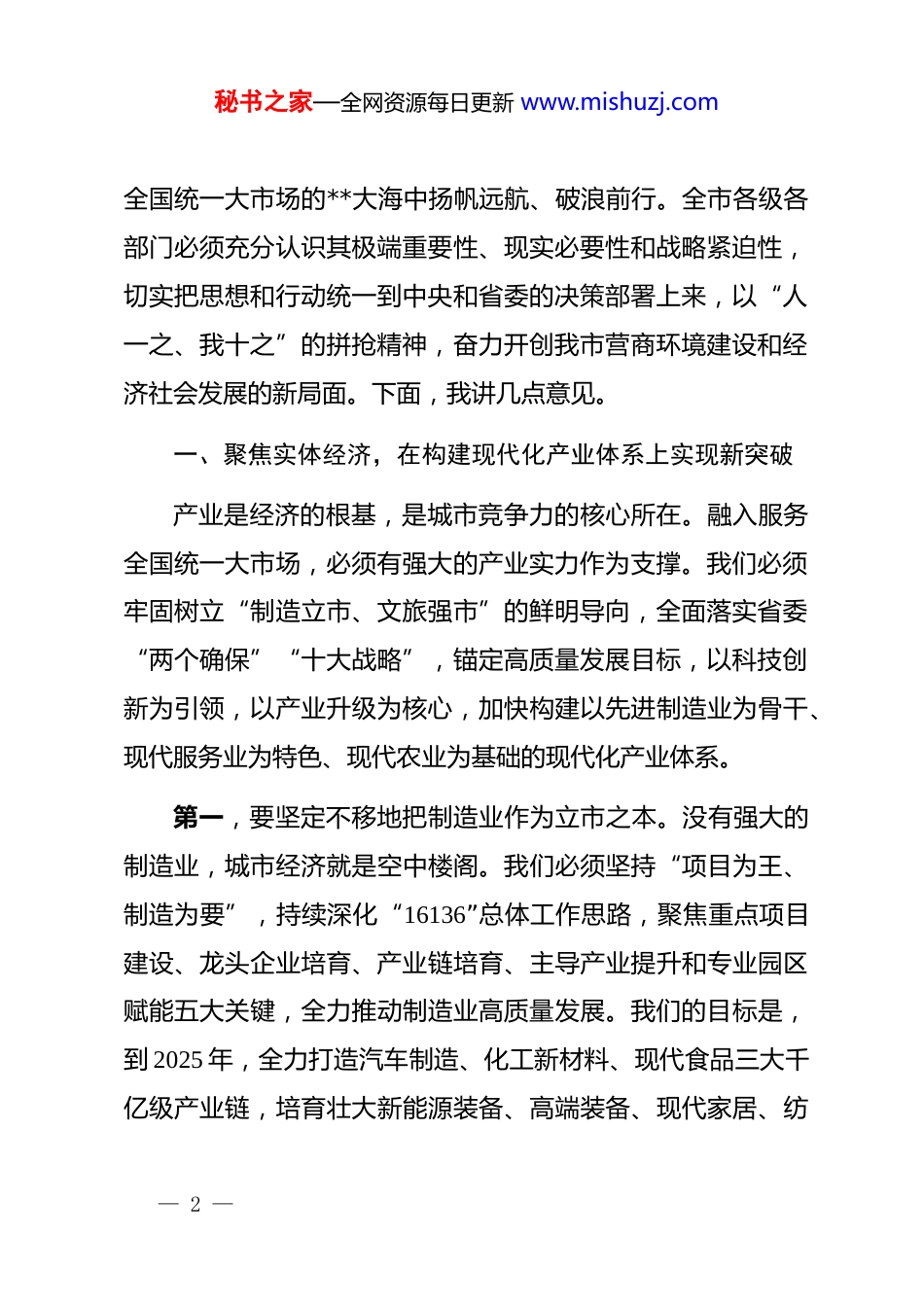 秘书之家—全网资源每日更新 www.mishuzj.com在全市融入服务全国统一大市场建设暨优化营商环境大会上的讲话同志们:今天,我们召开这次大会,主要任务是深入学习贯彻***视察我省时的重要讲话精神,全面落实*中央和省委的决策部署,动员全市上下以更高站位、更大力度、更实举措,全面优化营商环境,在融入服务全国统一大市场建设的宏伟征程中展现新的更大作为。建设全国统一大市场,是*中央从战略和全局高度作出的重大决策部署,是构建新发展格局的基础支撑和内在要求。这既是国之大者,也是发展大计。对我们市而言,这既是必须主动融入、积极服务的重大政治任务,更是我们破解发展瓶颈、激发内生动力、实现高质量发展的历史性机遇。营商环境是市场经济的培育之土,是市场主体的生命之氧。市场活力来自于人,关键在环境。环境优则企业兴,环境好则人才聚。可以说,优化营商环境与融入服务全国统一大市场建设,二者一体两面、互为表里、相辅相成。只有打造一流的营商环境,我们才能在— 1 —秘书之家—全网资源每日更新 www.mishuzj.com全国统一大市场的**大海中扬帆远航、破浪前行。全市各级各部门必须充分认识其极端重要性、现实必要性和战略紧迫性,切实把思想和行动统一到中央和省委的决策部署上来,以“人一之、我十之”的拼抢精神,奋力开创我市营商环境建设和经济社会发展的新局面。下面,我讲几点意见。一、聚焦实体经济,在构建现代化产业体系上实现新突破产业是经济的根基,是城市竞争力的核心所在。融入服务全国统一大市场,必须有强大的产业实力作为支撑。我们必须牢固树立“制造立市、文旅强市”的鲜明导向,全面落实省委“两个确保”“十大战略”,锚定高质量发展目标,以科技创新为引领,以产业升级为核心,加快构建以先进制造业为骨干、现代服务业为特色、现代农业为基础的现代化产业体系。第一,要坚定不移地把制造业作为立市之本。没有强大的制造业,城市经济就是空中楼阁。我们必须坚持“项目为王、制造为要”,持续深化“16136”总体工作思路,聚焦重点项目建设、龙头企业培育、产业链培育、主导产业提升和专业园区赋能五大关键,全力推动制造业高质量发展。我们的目标是,到 2025 年,全力打造汽车制造、化工新材料、现代食品三大千亿级产业链,培育壮大新能源装备、高端装备、现代家居、纺— 2 —秘书之家—全网资源每日更新 www.mishuzj.com织服装四个五百亿级产业链,以及高端仪器仪表、生物医药、新一代信息技术及集成电路三个百亿级产业链。为此,我们要集中力量抓好几个关键集群。汽车及零部件产业,要依托现有产业基础,加快推进 xx 汽车 xx 万辆整车、新能源汽车等重大项目建设,积极引进和培育一批核心零部件配套企业,打造链条完整、配套完善的汽车产业生态。化工新材料产业,要以安全、绿色、高效为方向,加快推进 xx 化工老厂区搬迁升级、xx化工合成氨等项目,向精细化工、新材料领域延伸,力争到2025 年培育形成 500 亿级的化工产业集群。现代食品产业,要发挥我市作为农业大市的原料优势,支持 xx 食品、xx 面粉、xx肉类等龙头企业做大做强,推动农产品由“原字号”向“制成品”转变,由“大粮仓”向“大厨房”“大餐桌”转型。现代家居产业,要抢抓消费升级机遇,推动从传统板材加工向全屋定制、智能家居、绿色建材等领域升级,力争到 2025 年产业集群主营业务收入突破 500 亿元。同时,要前瞻布局未来产业,在新一代信息技术、生物医药、新能源及智能网联汽车等领域,谋划和储备一批引领性、颠覆性项目,抢占未来发展制高点。第二,要全力以赴地把文旅产业打造成战略支柱。我市历史文化底蕴深厚,这是我们最宝贵的财富,也是我们融入新发— 3 —秘书之家—全网资源每日更新 www.mishuzj.com展格局中最独特的优势。必须坚持以文塑旅、以旅彰文,创新供给、融合发展,将文化优势转化为发展胜势。我们的目标是,到 2025 年,全市旅游综合收入突破 1000 亿元,文化产业增加值占 gdp 比重超过 8.5%。要高标准推进重大文旅项目建设。xx河文化主地标工程、xx 遗产区保护利用等项目,是展示我市文化魅力的“窗口...