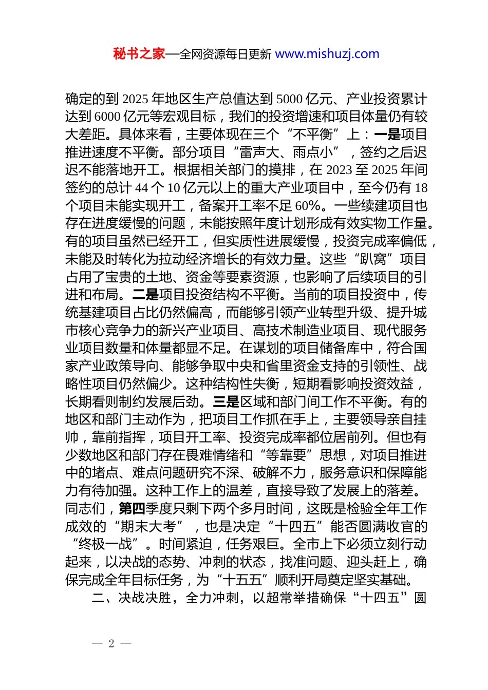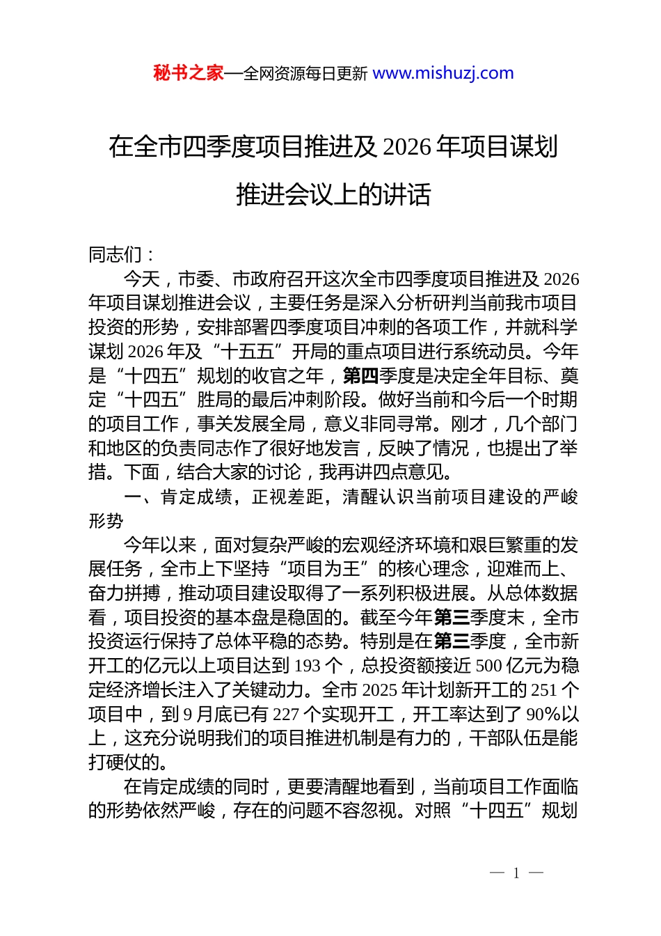 秘书之家—全网资源每日更新 www.mishuzj.com在全市四季度项目推进及 2026 年项目谋划推进会议上的讲话同志们:今天,市委、市政府召开这次全市四季度项目推进及 2026年项目谋划推进会议,主要任务是深入分析研判当前我市项目投资的形势,安排部署四季度项目冲刺的各项工作,并就科学谋划 2026 年及“十五五”开局的重点项目进行系统动员。今年是“十四五”规划的收官之年,第四季度是决定全年目标、奠定“十四五”胜局的最后冲刺阶段。做好当前和今后一个时期的项目工作,事关发展全局,意义非同寻常。刚才,几个部门和地区的负责同志作了很好地发言,反映了情况,也提出了举措。下面,结合大家的讨论,我再讲四点意见。一、肯定成绩,正视差距,清醒认识当前项目建设的严峻形势今年以来,面对复杂严峻的宏观经济环境和艰巨繁重的发展任务,全市上下坚持“项目为王”的核心理念,迎难而上、奋力拼搏,推动项目建设取得了一系列积极进展。从总体数据看,项目投资的基本盘是稳固的。截至今年第三季度末,全市投资运行保持了总体平稳的态势。特别是在第三季度,全市新开工的亿元以上项目达到 193 个,总投资额接近 500 亿元为稳定经济增长注入了关键动力。全市 2025 年计划新开工的 251 个项目中,到 9 月底已有 227 个实现开工,开工率达到了 90%以上,这充分说明我们的项目推进机制是有力的,干部队伍是能打硬仗的。在肯定成绩的同时,更要清醒地看到,当前项目工作面临的形势依然严峻,存在的问题不容忽视。对照“十四五”规划— 1 —秘书之家—全网资源每日更新 www.mishuzj.com确定的到 2025 年地区生产总值达到 5000 亿元、产业投资累计达到 6000 亿元等宏观目标,我们的投资增速和项目体量仍有较大差距。具体来看,主要体现在三个“不平衡”上:一是项目推进速度不平衡。部分项目“雷声大、雨点小”,签约之后迟迟不能落地开工。根据相关部门的摸排,在 2023 至 2025 年间签约的总计 44 个 10 亿元以上的重大产业项目中,至今仍有 18个项目未能实现开工,备案开工率不足 60%。一些续建项目也存在进度缓慢的问题,未能按照年度计划形成有效实物工作量。有的项目虽然已经开工,但实质性进展缓慢,投资完成率偏低,未能及时转化为拉动经济增长的有效力量。这些“趴窝”项目占用了宝贵的土地、资金等要素资源,也影响了后续项目的引进和布局。二是项目投资结构不平衡。当前的项目投资中,传统基建项目占比仍然偏高,而能够引领产业转型升级、提升城市核心竞争力的新兴产业项目、高技术制造业项目、现代服务业项目数量和体量都显不足。在谋划的项目储备库中,符合国家产业政策导向、能够争取中央和省里资金支持的引领性、战略性项目仍然偏少。这种结构性失衡,短期看影响投资效益,长期看则制约发展后劲。三是区域和部门间工作不平衡。有的地区和部门主动作为,把项目工作抓在手上,主要领导亲自挂帅,靠前指挥,项目开工率、投资完成率都位居前列。但也有少数地区和部门存在畏难情绪和“等靠要”思想,对项目推进中的堵点、难点问题研究不深、破解不力,服务意识和保障能力有待加强。这种工作上的温差,直接导致了发展上的落差。同志们,第四季度只剩下两个多月时间,这既是检验全年工作成效的“期末大考”,也是决定“十四五”能否圆满收官的“终极一战”。时间紧迫,任务艰巨。全市上下必须立刻行动起来,以决战的态势、冲刺的状态,找准问题、迎头赶上,确保完成全年目标任务,为“十五五”顺利开局奠定坚实基础。二、决战决胜,全力冲刺,以超常举措确保“十四五”圆— 2 —秘书之家—全网资源每日更新 www.mishuzj.com满收官打好第四季度项目攻坚战,必须采取超常规的思路和举措,拿出“跳起来够得着”的奋斗目标,把压力层层传导下去,把责任一一压实到位。要聚焦关键环节,精准发力,确保各项工作落地见效。第一,全力攻坚清零未开复工项目。对于前面提到的17、18 个未开工的重大项目必须作为本季度攻坚的重中之重。要建立“一个项目、一名领导、一个专班、一抓到底”的包保责任制。市级领导要带头深入一线,现场办公,协调解决...