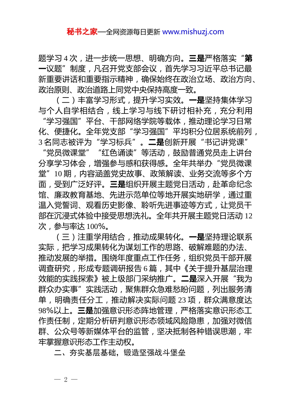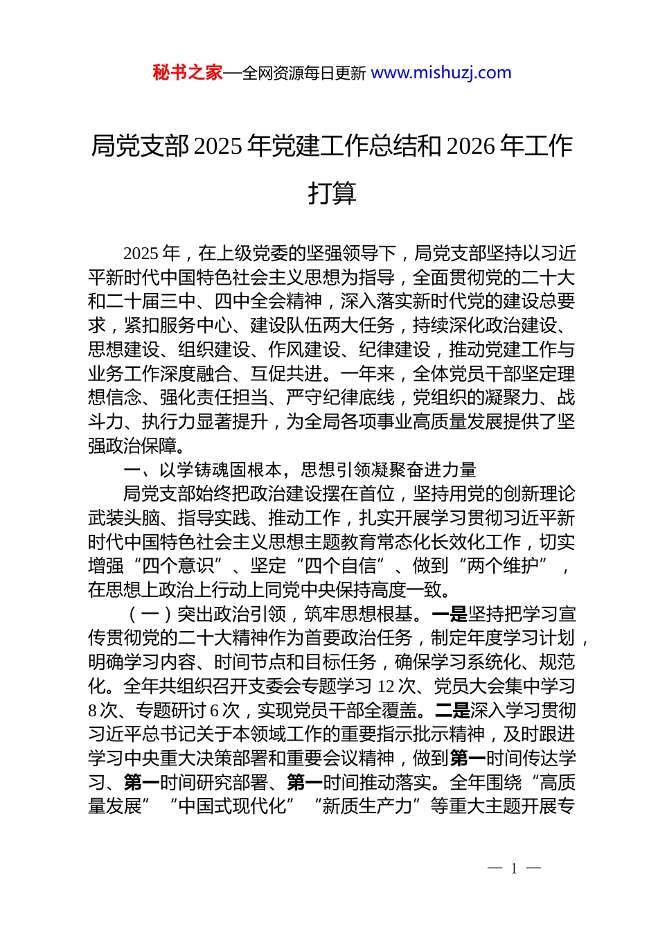 秘书之家—全网资源每日更新 www.mishuzj.com局党支部 2025 年党建工作总结和 2026 年工作打算2025 年,在上级党委的坚强领导下,局党支部坚持以习近平新时代中国特色社会主义思想为指导,全面贯彻党的二十大和二十届三中、四中全会精神,深入落实新时代党的建设总要求,紧扣服务中心、建设队伍两大任务,持续深化政治建设、思想建设、组织建设、作风建设、纪律建设,推动党建工作与业务工作深度融合、互促共进。一年来,全体党员干部坚定理想信念、强化责任担当、严守纪律底线,党组织的凝聚力、战斗力、执行力显著提升,为全局各项事业高质量发展提供了坚强政治保障。一、以学铸魂固根本,思想引领凝聚奋进力量局党支部始终把政治建设摆在首位,坚持用党的创新理论武装头脑、指导实践、推动工作,扎实开展学习贯彻习近平新时代中国特色社会主义思想主题教育常态化长效化工作,切实增强“四个意识”、坚定“四个自信”、做到“两个维护”,在思想上政治上行动上同党中央保持高度一致。(一)突出政治引领,筑牢思想根基。一是坚持把学习宣传贯彻党的二十大精神作为首要政治任务,制定年度学习计划,明确学习内容、时间节点和目标任务,确保学习系统化、规范化。全年共组织召开支委会专题学习 12 次、党员大会集中学习8 次、专题研讨 6 次,实现党员干部全覆盖。二是深入学习贯彻习近平总书记关于本领域工作的重要指示批示精神,及时跟进学习中央重大决策部署和重要会议精神,做到第一时间传达学习、第一时间研究部署、第一时间推动落实。全年围绕“高质量发展”“中国式现代化”“新质生产力”等重大主题开展专— 1 —秘书之家—全网资源每日更新 www.mishuzj.com题学习 4 次,进一步统一思想、明确方向。三是严格落实“第一议题”制度,凡召开党支部会议,首先学习习近平总书记最新重要讲话和重要指示精神,确保始终在政治立场、政治方向、政治原则、政治道路上同党中央保持高度一致。(二)丰富学习形式,提升学习实效。一是坚持集体学习与个人自学相结合,线上学习与线下研讨相补充,充分利用“学习强国”平台、干部网络学院等载体,推动理论学习日常化、便捷化。全年党支部“学习强国”平均积分位居系统前列,3 名同志被评为“学习标兵”。二是创新开展“书记讲党课”“党员微课堂”“红色诵读”等活动,鼓励普通党员走上讲台分享学习体会,增强参与感和获得感。全年共举办“党员微课堂”10 期,内容涵盖党史故事、政策解读、业务交流等多个方面,受到广泛好评。三是组织开展主题党日活动,赴革命纪念馆、廉政教育基地、先进示范单位等地开展实地研学,通过重温入党誓词、观看历史影像、聆听先进事迹等方式,让党员干部在沉浸式体验中接受思想洗礼。全年共开展主题党日活动 12次,参与率达 100%。(三)注重学用结合,推动成果转化。一是坚持理论联系实际,把学习成果转化为谋划工作的思路、破解难题的办法、推动发展的举措。围绕年度重点工作任务,组织党员干部开展调查研究,形成专题调研报告 6 篇,其中《关于提升基层治理效能的实践探索》被上级部门采纳推广。二是深入开展“我为群众办实事”实践活动,聚焦群众急难愁盼问题,列出服务清单,明确责任分工,推动解决实际问题 23 项,群众满意度达98%以上。三是加强意识形态阵地管理,严格落实意识形态工作责任制,定期分析研判意识形态领域风险隐患,加强对微信群、公众号等新媒体平台的监管,坚决抵制各种错误思潮,牢牢掌握意识形态工作主动权。二、夯实基层基础,锻造坚强战斗堡垒— 2 —秘书之家—全网资源每日更新 www.mishuzj.com局党支部始终坚持大抓基层的鲜明导向,深入贯彻《中国共产党支部工作条例(试行)》,持续推进党支部标准化规范化建设,不断增强党组织的政治功能和组织功能,切实把党支部建设成为有效实现党的领导的坚强战斗堡垒。(一)规范组织运行,提升制度执行力。一是严格执行“三会一课”制度,全年召开支部党员大会 8 次、支委会 12 次、党小组会 24 次,上党课 4 次,会议记录完整规范,程序严谨有序。二是认真落实组织生活会和民主评议党员制度,2025 ...