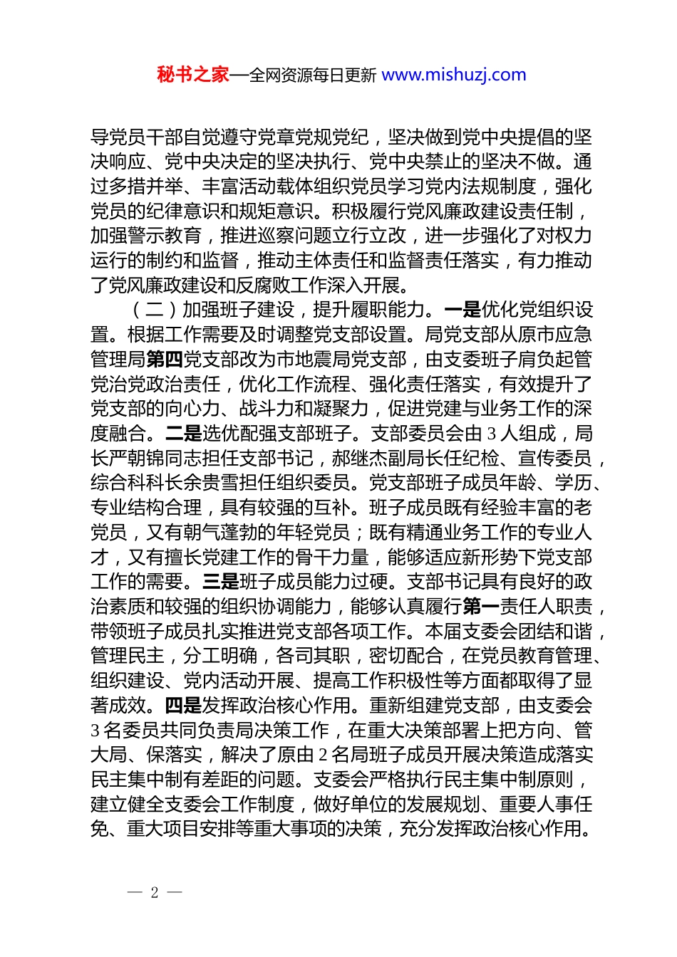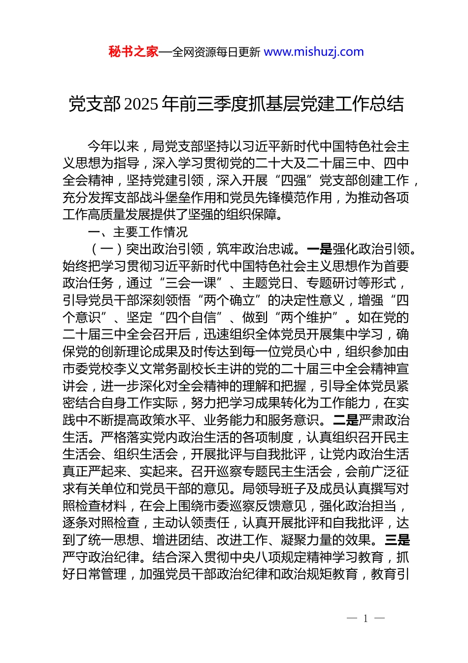 秘书之家—全网资源每日更新 www.mishuzj.com党支部 2025 年前三季度抓基层党建工作总结今年以来,局党支部坚持以习近平新时代中国特色社会主义思想为指导,深入学习贯彻党的二十大及二十届三中、四中全会精神,坚持党建引领,深入开展“四强”党支部创建工作,充分发挥支部战斗堡垒作用和党员先锋模范作用,为推动各项工作高质量发展提供了坚强的组织保障。一、主要工作情况(一)突出政治引领,筑牢政治忠诚。一是强化政治引领。始终把学习贯彻习近平新时代中国特色社会主义思想作为首要政治任务,通过“三会一课”、主题党日、专题研讨等形式,引导党员干部深刻领悟“两个确立”的决定性意义,增强“四个意识”、坚定“四个自信”、做到“两个维护”。如在党的二十届三中全会召开后,迅速组织全体党员开展集中学习,确保党的创新理论成果及时传达到每一位党员心中,组织参加由市委党校李义文常务副校长主讲的党的二十届三中全会精神宣讲会,进一步深化对全会精神的理解和把握,引导全体党员紧密结合自身工作实际,努力把学习成果转化为工作能力,在实践中不断提高政策水平、业务能力和服务意识。二是严肃政治生活。严格落实党内政治生活的各项制度,认真组织召开民主生活会、组织生活会,开展批评与自我批评,让党内政治生活真正严起来、实起来。召开巡察专题民主生活会,会前广泛征求有关单位和党员干部的意见。局领导班子及成员认真撰写对照检查材料,在会上围绕市委巡察反馈意见,强化政治担当,逐条对照检查,主动认领责任,认真开展批评和自我批评,达到了统一思想、增进团结、改进工作、凝聚力量的效果。三是严守政治纪律。结合深入贯彻中央八项规定精神学习教育,抓好日常管理,加强党员干部政治纪律和政治规矩教育,教育引— 1 —秘书之家—全网资源每日更新 www.mishuzj.com导党员干部自觉遵守党章党规党纪,坚决做到党中央提倡的坚决响应、党中央决定的坚决执行、党中央禁止的坚决不做。通过多措并举、丰富活动载体组织党员学习党内法规制度,强化党员的纪律意识和规矩意识。积极履行党风廉政建设责任制,加强警示教育,推进巡察问题立行立改,进一步强化了对权力运行的制约和监督,推动主体责任和监督责任落实,有力推动了党风廉政建设和反腐败工作深入开展。(二)加强班子建设,提升履职能力。一是优化党组织设置。根据工作需要及时调整党支部设置。局党支部从原市应急管理局第四党支部改为市地震局党支部,由支委班子肩负起管党治党政治责任,优化工作流程、强化责任落实,有效提升了党支部的向心力、战斗力和凝聚力,促进党建与业务工作的深度融合。二是选优配强支部班子。支部委员会由 3 人组成,局长严朝锦同志担任支部书记,郝继杰副局长任纪检、宣传委员,综合科科长余贵雪担任组织委员。党支部班子成员年龄、学历、专业结构合理,具有较强的互补。班子成员既有经验丰富的老党员,又有朝气蓬勃的年轻党员;既有精通业务工作的专业人才,又有擅长党建工作的骨干力量,能够适应新形势下党支部工作的需要。三是班子成员能力过硬。支部书记具有良好的政治素质和较强的组织协调能力,能够认真履行第一责任人职责,带领班子成员扎实推进党支部各项工作。本届支委会团结和谐,管理民主,分工明确,各司其职,密切配合,在党员教育管理、组织建设、党内活动开展、提高工作积极性等方面都取得了显著成效。四是发挥政治核心作用。重新组建党支部,由支委会3 名委员共同负责局决策工作,在重大决策部署上把方向、管大局、保落实,解决了原由 2 名局班子成员开展决策造成落实民主集中制有差距的问题。支委会严格执行民主集中制原则,建立健全支委会工作制度,做好单位的发展规划、重要人事任免、重大项目安排等重大事项的决策,充分发挥政治核心作用。— 2 —秘书之家—全网资源每日更新 www.mishuzj.com(三)强化党员教育,打造过硬队伍。一是加强学习培训。加强党员思想政治教育,通过开展专题党课、警示教育等活动,引导党员坚定理想信念,增强党性修养,严明纪律规矩。注重党员业务能力培养,根据党员岗位特点和工作需求,组织参加业务培训、应急演练...