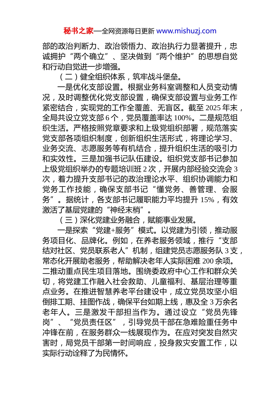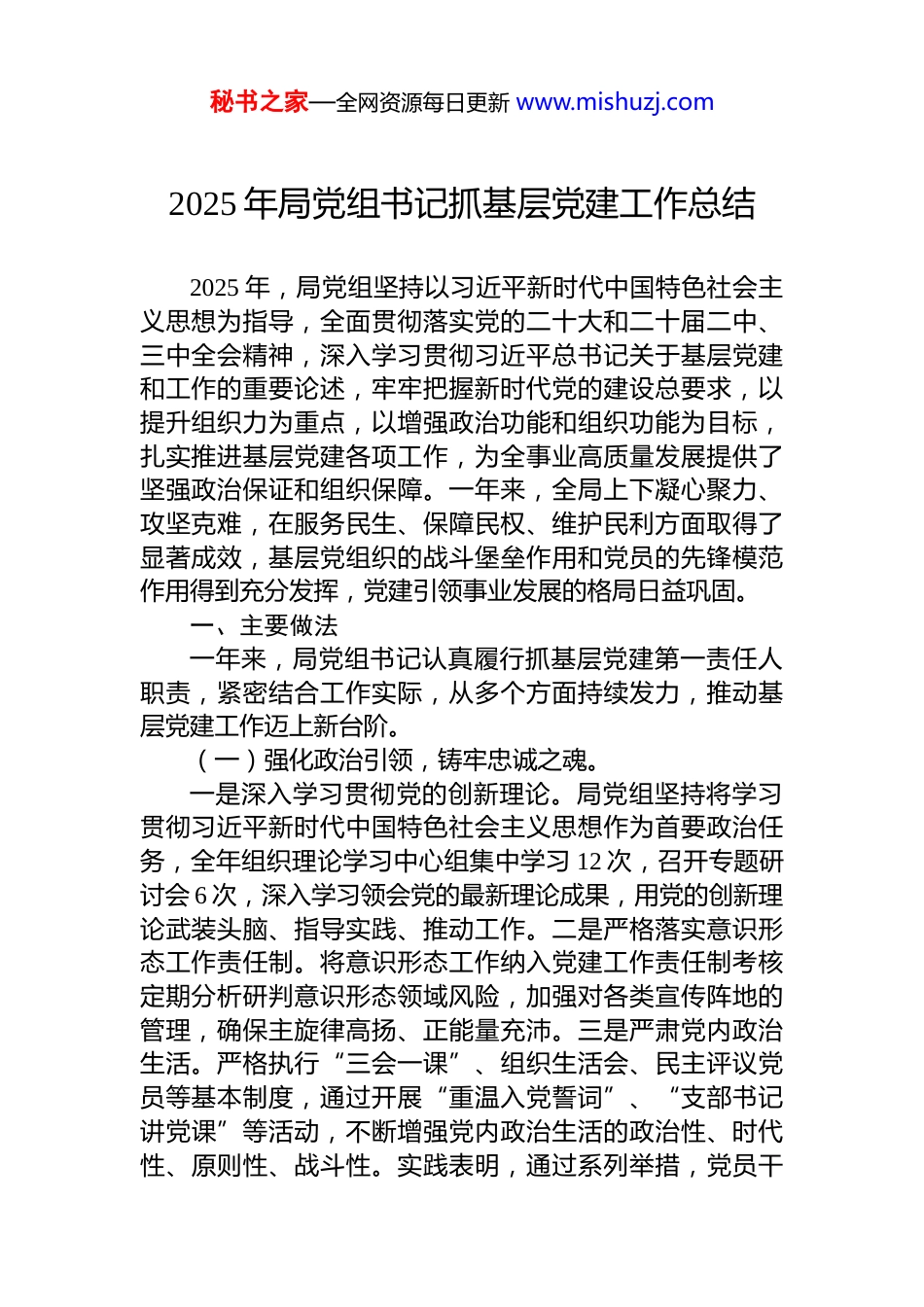 秘书之家—全网资源每日更新 www.mishuzj.com2025 年局党组书记抓基层党建工作总结2025 年,局党组坚持以习近平新时代中国特色社会主义思想为指导,全面贯彻落实党的二十大和二十届二中、三中全会精神,深入学习贯彻习近平总书记关于基层党建和工作的重要论述,牢牢把握新时代党的建设总要求,以提升组织力为重点,以增强政治功能和组织功能为目标,扎实推进基层党建各项工作,为全事业高质量发展提供了坚强政治保证和组织保障。一年来,全局上下凝心聚力、攻坚克难,在服务民生、保障民权、维护民利方面取得了显著成效,基层党组织的战斗堡垒作用和党员的先锋模范作用得到充分发挥,党建引领事业发展的格局日益巩固。一、主要做法一年来,局党组书记认真履行抓基层党建第一责任人职责,紧密结合工作实际,从多个方面持续发力,推动基层党建工作迈上新台阶。(一)强化政治引领,铸牢忠诚之魂。一是深入学习贯彻党的创新理论。局党组坚持将学习贯彻习近平新时代中国特色社会主义思想作为首要政治任务,全年组织理论学习中心组集中学习 12 次,召开专题研讨会 6 次,深入学习领会党的最新理论成果,用党的创新理论武装头脑、指导实践、推动工作。二是严格落实意识形态工作责任制。将意识形态工作纳入党建工作责任制考核定期分析研判意识形态领域风险,加强对各类宣传阵地的管理,确保主旋律高扬、正能量充沛。三是严肃党内政治生活。严格执行“三会一课”、组织生活会、民主评议党员等基本制度,通过开展“重温入党誓词”、“支部书记讲党课”等活动,不断增强党内政治生活的政治性、时代性、原则性、战斗性。实践表明,通过系列举措,党员干秘书之家—全网资源每日更新 www.mishuzj.com部的政治判断力、政治领悟力、政治执行力显著提升,忠诚拥护“两个确立”、坚决做到“两个维护”的思想自觉和行动自觉进一步增强。(二)健全组织体系,筑牢战斗堡垒。一是优化支部设置。根据业务科室调整和人员变动情况,及时调整优化党支部设置,确保支部设置与业务工作紧密结合,实现党的工作全覆盖、无盲区。截至 2025 年末,全局共设立党支部 6 个,党员覆盖率达 100%。二是规范组织生活。严格按照党章要求和上级党组织部署,规范落实党支部各项组织制度,创新组织生活形式,将理论学习、业务交流、志愿服务等有机结合,提升组织生活的吸引力和实效性。三是加强书记队伍建设。组织党支部书记参加上级党组织举办的专题培训班 2 次,开展内部经验交流会 3次,着力提升支部书记的政治理论水平、组织协调能力和党务工作技能,确保支部书记“懂党务、善管理、会服务”。据统计,各支部书记履职能力平均提升 15%,有效激活了基层党建的“神经末梢”。(三)深化党建业务融合,赋能事业发展。一是探索“党建+服务”模式。以党建为引领,推动服务项目化、品牌化。例如,在养老服务领域,推行“支部结对社区、党员联系老人”机制,组建党员志愿服务队 3 支,常态化开展助老服务,帮助解决老年人实际困难 200 余项。二推动重点民生项目落地。围绕委政府中心工作和群众关切,将党建工作融入社会救助、儿童福利、基层治理等重点业务。在推进智慧养老平台建设中,成立党员攻坚小组倒排工期、挂图作战,确保平台如期上线,惠及全 3 万余名老年人。三是激发干部担当作为。通过设立“党员先锋岗”、“党员责任区”,引导党员干部在急难险重任务中冲锋在前,在服务群众一线展现作为。在应对突发自然灾害时,局党员干部第一时间响应,投身救灾安置工作,以实际行动诠释了为民情怀。秘书之家—全网资源每日更新 www.mishuzj.com(四)锻造过硬队伍,发挥先锋作用。一是加强党员教育管理。坚持严管与厚爱相结合,定期组织党员进行党性分析,开展批评与自我批评,引导党员牢记身份、永葆本色。创新教育形式,利用红色教育基地、廉政教育基地等开展现场教学,增强教育的感染力。二是开展主题实践活动。结合“党员政治生日”、“我为群众办实事”等活动,引导党员立足岗位、履职尽责。全年共为群众办实事好事 150 余件,得到了服务对象的一致好评。三是强化党员日常监督。健全党员日常管...