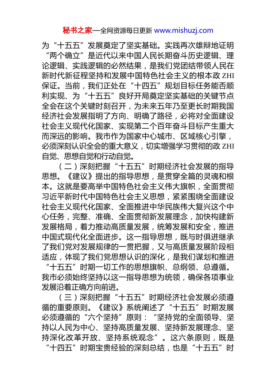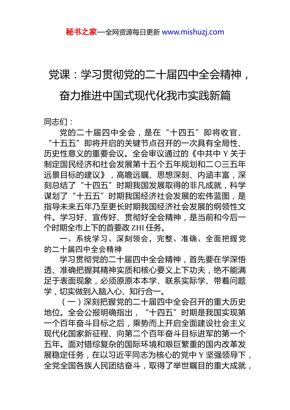 秘书之家—全网资源每日更新 www.mishuzj.com党课:学习贯彻党的二十届四中全会精神,奋力推进中国式现代化我市实践新篇同志们:党的二十届四中全会,是在“十四五”即将收官、“十五五”即将开启的关键节点召开的一次具有全局性、历史性意义的重要会议。全会审议通过的《中共中 Y 关于制定国民经济和社会发展第十五个五年规划和二〇三五年远景目标的建议》,高瞻远瞩、思想深刻、内涵丰富,深刻总结了“十四五”时期我国发展取得的非凡成就,科学谋划了“十五五”时期我国经济社会发展的宏伟蓝图,是指导未来五年乃至更长时期我国经济社会发展的纲领性文件。学习好、宣传好、贯彻好全会精神,是当前和今后一个时期全市上下的首要政 ZHI 任务。一、系统学习、深刻领会,完整、准确、全面把握党的二十届四中全会精神学习贯彻党的二十届四中全会精神,首先要在学深悟透、准确把握其精神实质和核心要义上下功夫,绝不能满足于表面现象,必须原原本本学、联系实际学、带着问题学,切实做到入脑入心、知行合一。(一)深刻把握党的二十届四中全会召开的重大历史地位。全会公报明确指出,“十四五”时期是我国实现第一个百年奋斗目标之后,乘势而上开启全面建设社会主义现代化国家新征程、向第二个百年奋斗目标进军的第一个五年。面对错综复杂的国际环境和艰巨繁重的国内改革发展稳定任务,在以习近平同志为核心的党中 Y 坚强领导下,全党全国各族人民团结奋斗,取得了举世瞩目的重大成就,秘书之家—全网资源每日更新 www.mishuzj.com为“十五五”发展奠定了坚实基础。实践再次雄辩地证明“两个确立”是近代以来中国人民长期奋斗历史逻辑、理论逻辑、实践逻辑的必然结果,是我们党团结带领人民在新时代新征程坚持和发展中国特色社会主义的根本政 ZHI保证。当前,我们正处在“十四五”规划目标任务能否顺利实现、为“十五五”良好开局奠定坚实基础的关键节点全会在这个关键时刻召开,为未来五年乃至更长时期我国经济社会发展指明了方向、明确了路径,必将对全面建设社会主义现代化国家、实现第二个百年奋斗目标产生重大而深远的影响。我市作为国家中心城市、区域核心引擎,必须深刻认识全会的重大意义,切实增强学习贯彻的政 ZHI自觉、思想自觉和行动自觉。(二)深刻把握“十五五”时期经济社会发展的指导思想。《建议》提出的指导思想,是贯穿全篇的灵魂和根本。这就是要高举中国特色社会主义伟大旗帜,全面贯彻习近平新时代中国特色社会主义思想,紧紧围绕全面建设社会主义现代化国家、全面推进中华民族伟大复兴这个中心任务,完整、准确、全面贯彻新发展理念,加快构建新发展格局,着力推动高质量发展,统筹发展和安全,推进中国式现代化全面进步。这一指导思想,既与时俱进继承了我们党对发展规律的一贯把握,又与高质量发展阶段相适应,体现了我们党思想认识的深化,是我们谋划和推进“十五五”时期一切工作的思想旗帜、总纲领、总遵循。我市必须始终坚持以这一指导思想为统领,确保各项事业发展沿着正确方向前进。(三)深刻把握“十五五”时期经济社会发展必须遵循的重要原则。《建议》系统阐述了“十五五”时期发展必须遵循的“六个坚持”原则:“坚持党的全面领导、坚持以人民为中心、坚持高质量发展、坚持新发展理念、坚持深化改革开放、坚持系统观念”。这六条原则,既是“十四五”时期宝贵经验的深刻总结,也是“十五五”时秘书之家—全网资源每日更新 www.mishuzj.com期必须牢牢把握的根本准则。特别是坚持党的全面领导,是定盘星、主心骨;坚持高质量发展,是新时代的硬道理坚持新发展理念,是实现高质量发展的必由之路。这些原则相互关联、有机统一,我们必须一体坚持、一体贯彻、一体落实,确保我市的现代化建设始终沿着正确方向行稳致远,在服务国家大局中展现新担当、实现新作为。(四)深刻把握“十五五”时期的重点任务。蓝图已经绘就,关键在于落实。《建议》部署了一系列具有牵引性、战略性的重点任务,包括大力建设以实体经济为支撑的现代化产业体系、加快实现高水平科技自立自强、着力建设更高水平开放型经济新体制、全面推进乡村振兴、促进区域协调...