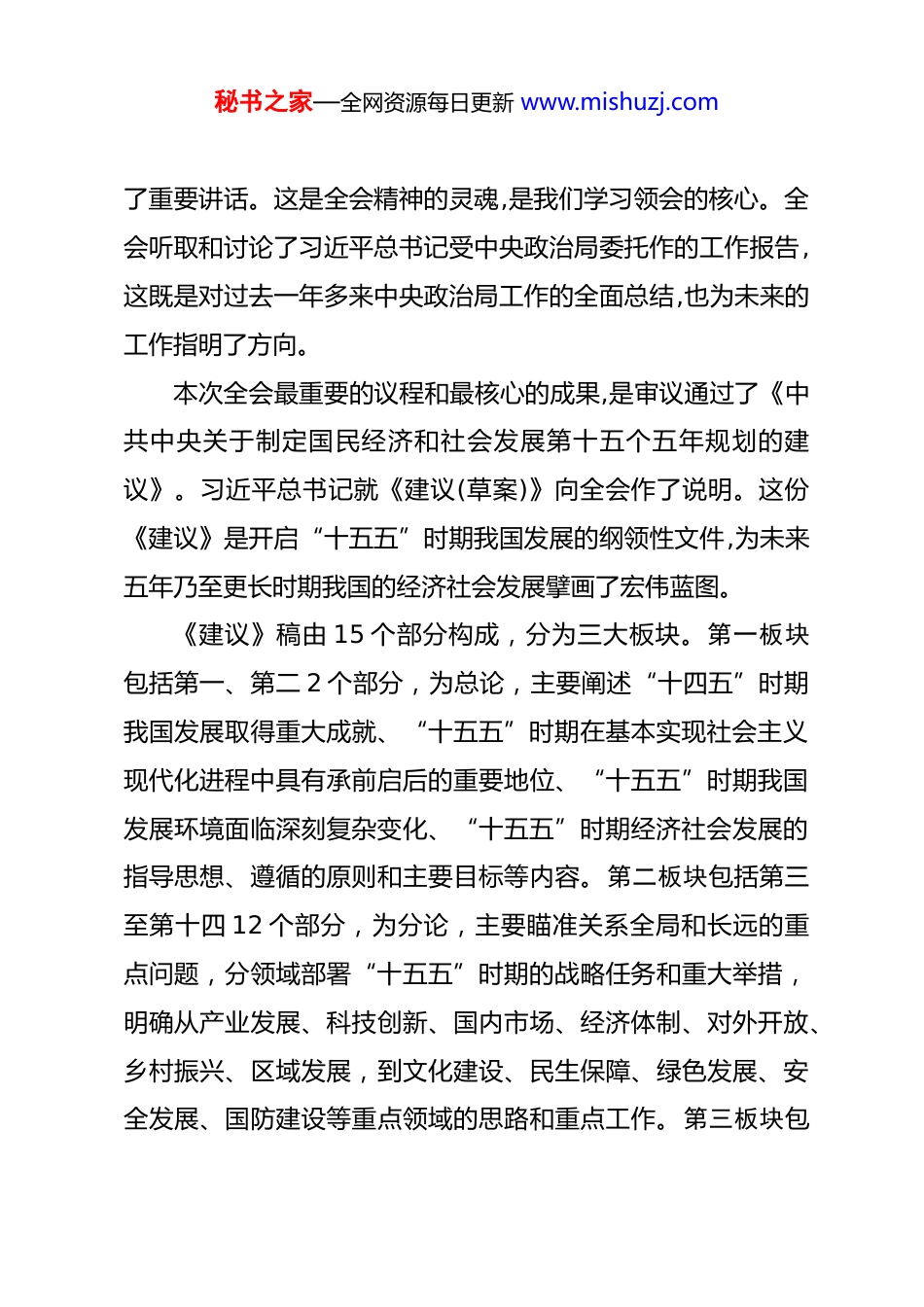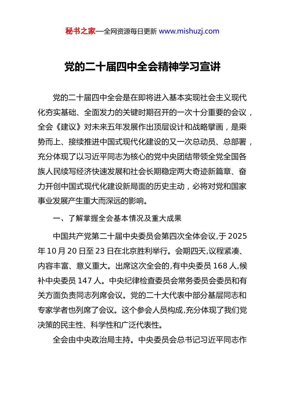 秘书之家—全网资源每日更新 www.mishuzj.com党的二十届四中全会精神学习宣讲党的二十届四中全会是在即将进入基本实现社会主义现代化夯实基础、全面发力的关键时期召开的一次十分重要的会议,全会《建议》对未来五年发展作出顶层设计和战略擘画,是乘势而上、接续推进中国式现代化建设的又一次总动员、总部署,充分体现了以习近平同志为核心的党中央团结带领全党全国各族人民续写经济快速发展和社会长期稳定两大奇迹新篇章、奋力开创中国式现代化建设新局面的历史主动,必将对党和国家事业发展产生重大而深远的影响。一、了解掌握全会基本情况及重大成果中国共产党第二十届中央委员会第四次全体会议,于 2025年 10 月 20 日至 23 日在北京胜利举行。会期四天,议程紧凑、内容丰富、意义重大。出席这次全会的,有中央委员 168 人,候补中央委员 147 人。中央纪律检查委员会常务委员会委员和有关方面负责同志列席会议。党的二十大代表中部分基层同志和专家学者也列席了会议。这个参会人员构成,充分体现了我们党决策的民主性、科学性和广泛代表性。全会由中央政治局主持。中央委员会总书记习近平同志作秘书之家—全网资源每日更新 www.mishuzj.com了重要讲话。这是全会精神的灵魂,是我们学习领会的核心。全会听取和讨论了习近平总书记受中央政治局委托作的工作报告,这既是对过去一年多来中央政治局工作的全面总结,也为未来的工作指明了方向。本次全会最重要的议程和最核心的成果,是审议通过了《中共中央关于制定国民经济和社会发展第十五个五年规划的建议》。习近平总书记就《建议(草案)》向全会作了说明。这份《建议》是开启“十五五”时期我国发展的纲领性文件,为未来五年乃至更长时期我国的经济社会发展擘画了宏伟蓝图。《建议》稿由 15 个部分构成,分为三大板块。第一板块包括第一、第二 2 个部分,为总论,主要阐述“十四五”时期我国发展取得重大成就、“十五五”时期在基本实现社会主义现代化进程中具有承前启后的重要地位、“十五五”时期我国发展环境面临深刻复杂变化、“十五五”时期经济社会发展的指导思想、遵循的原则和主要目标等内容。第二板块包括第三至第十四 12 个部分,为分论,主要瞄准关系全局和长远的重点问题,分领域部署“十五五”时期的战略任务和重大举措,明确从产业发展、科技创新、国内市场、经济体制、对外开放、乡村振兴、区域发展,到文化建设、民生保障、绿色发展、安全发展、国防建设等重点领域的思路和重点工作。第三板块包秘书之家—全网资源每日更新 www.mishuzj.com括第十五部分和结束语,主要部署坚持和加强党中央集中统一领导、推进社会主义民主法治建设、港澳台工作、推动构建人类命运共同体、充分调动全社会积极性主动性创造性等任务。二、正确认识“十四五”时期我国发展取得重大成就全会高度评价了“十四五”时期我国发展取得的重大成就“十四五”时期我国发展历程极不寻常、极不平凡。面对错综复杂的国际形势和艰巨繁重的国内改革发展稳定任务,以习近平同志为核心的党中央团结带领全党全国各族人民,迎难而上、砥砺前行,经受住世纪疫情严重冲击,有效应对一系列重大风险挑战,推动党和国家事业取得新的重大成就。经济运行稳中有进,高质量发展扎实推进;科技创新成果丰硕,新质生产力稳步发展;全面深化改革进一步推进,高水平对外开放不断扩大;全过程人民民主深入发展,全面依法治国有效实施;文化事业和文化产业蓬勃发展,精神文化产品丰富多彩;民生保障扎实稳固,脱贫攻坚成果巩固拓展;绿色低碳转型步伐加快,生态环境质量持续改善;国家安全能力有效提升,社会治理效能增强,社会大局保持稳定;国防和军队建设取得重大进展;“一国两制”实践深入推进;中国特色大国外交全面拓展;全面从严治党成效显著,反腐败斗争纵深推进,秘书之家—全网资源每日更新 www.mishuzj.com党的创造力、凝聚力、战斗力明显提高。我国经济实力、科技实力、综合国力跃上新台阶,中国式现代化迈出新的坚实步伐,第二个百年奋斗目标新征程实现良好开局。这些重大成就的取得,根本在于以习近平同志为核心的党中央领航掌舵,在于习近...