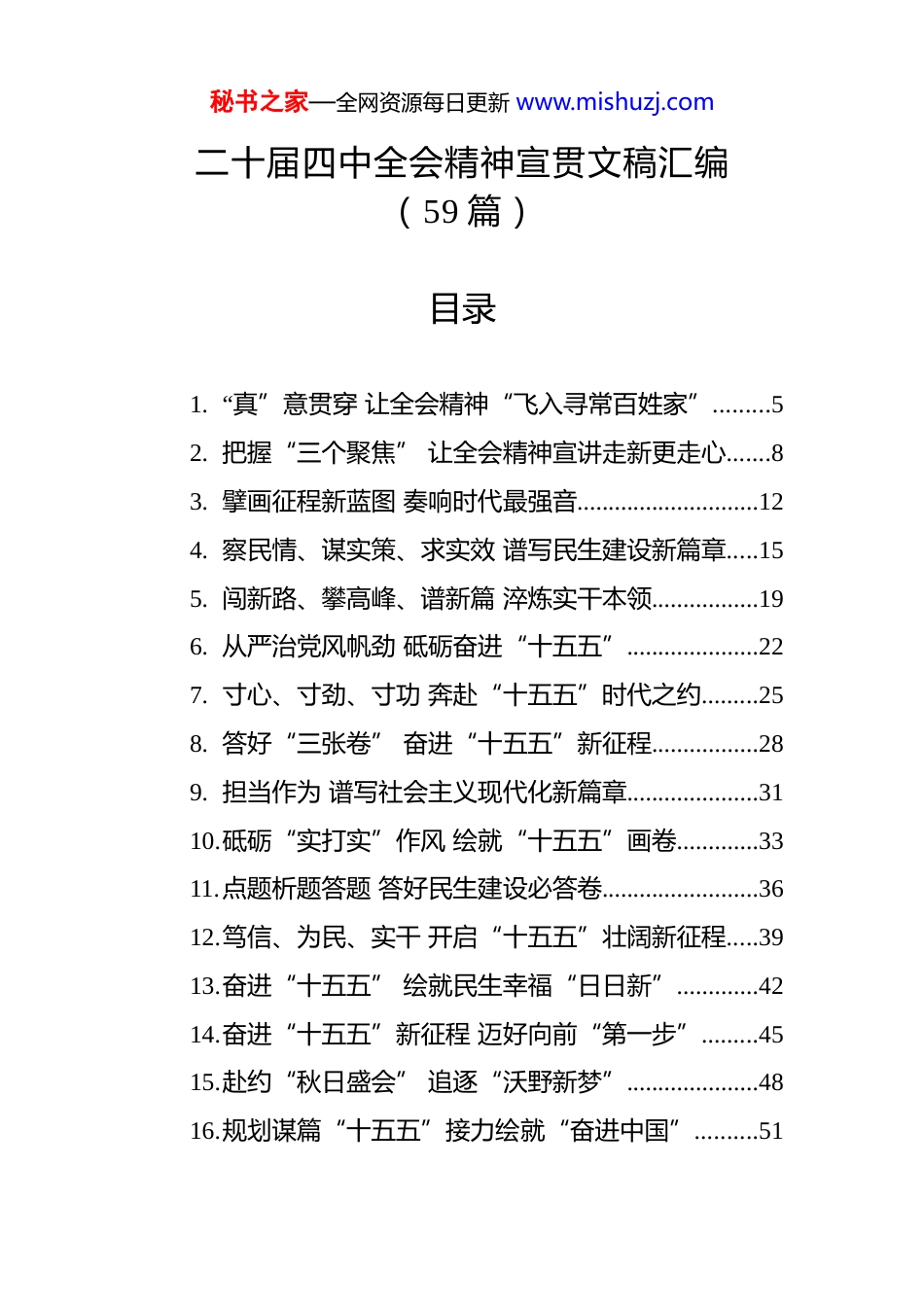 秘书之家—全网资源每日更新 www.mishuzj.com二十届四中全会精神宣贯文稿汇编(59 篇)目录1. “真”意贯穿 让全会精神“飞入寻常百姓家”.........52. 把握“三个聚焦” 让全会精神宣讲走新更走心.......83. 擘画征程新蓝图 奏响时代最强音.............................124. 察民情、谋实策、求实效 谱写民生建设新篇章.....155. 闯新路、攀高峰、谱新篇 淬炼实干本领.................196. 从严治党风帆劲 砥砺奋进“十五五”.....................227. 寸心、寸劲、寸功 奔赴“十五五”时代之约.........258. 答好“三张卷” 奋进“十五五”新征程.................289. 担当作为 谱写社会主义现代化新篇章.....................3110.砥砺“实打实”作风 绘就“十五五”画卷.............3311.点题析题答题 答好民生建设必答卷.........................3612.笃信、为民、实干 开启“十五五”壮阔新征程.....3913.奋进“十五五” 绘就民生幸福“日日新”.............4214.奋进“十五五”新征程 迈好向前“第一步”.........4515.赴约“秋日盛会” 追逐“沃野新梦”.....................4816.规划谋篇“十五五”接力绘就“奋进中国”..........51秘书之家—全网资源每日更新 www.mishuzj.com17.激活“动力引擎” 书写乡村振兴发展新篇章.........5318.解农忧、纾农困、暖农心 共绘乡村好“丰”景.....5719.聚焦“引育留用” 为“十五五”注入人才动能.....6020.聚焦全会精神 奋力谱写中国式现代化新篇章.........6421.扛起“十五五”新使命 锻造高质量攻坚队.............6722.跨沟壑、迎挑战、赴山海 擦亮“奋斗本色”.........7023.牢牢把握“集中力量办好自己的事”这个关键......7324.领航、开拓、惠民 开创中国式现代化新局面.........7525.锚定、聚焦、精准 谱写高校党员教育新答卷.........7826.锚定“十五五”航向 擘画乡村振兴图景.................8127.锚定“选育管用” 为“十五五”锻造过硬队伍.....8428.锚定航向勇担当 奋力书写“十五五”新篇章.........8729.念好“实字决”让民生愿变为幸福景......................9030.凝“心”聚“力” 绘就“十五五”发展新篇章.....9231.凝心、笃行、争先 奔赴“十五五”新征程.............9632.凝心、躬身、破壁 书写“十五五”青春答卷.........9933.破难题、开新局、向未来 续写新征程奋斗华章...10234.强农、兴农、富农 共绘“三农”新答卷...............10435.全会精神宣讲当“下力气、冒热气、接地气”....10836.全会精神宣讲要深一层、先一步、胜一筹............11137.全会精神宣讲要心贴心、面对面、实打实............114秘书之家—全网资源每日更新 www.mishuzj.com38.让全会精神“声”入人心 凝聚起奋进伟力...........11739.让全会精神入脑入心、见行见效............................12040.踏征程、逐梦想、向未来 彰显“青春底色”.......12341.同心同频同音 绘就“十五五”规划民生底色.......12642.稳舵扬帆 奋楫“十五五”现代化新征程...............12843.向下、向上、向民 让驻村更“驻心”...................13144.向阳向新向民 奔赴“十五五”规划时代之约.......13445.兴产业、净乡野、惠民生 绘就乡村新“丰”景...13746.兴农业、靓乡野、富乡亲 绘就乡村好“丰”景...14047.以“小”见“大” 让全会精神宣讲入脑入心.......14348.以全会精神为指引 在“十五五”展现青春担当...14749.以人才“活水”激荡“十五五”新浪潮................15050.以人民情怀 递进式写好“十五五”民生新篇章...15451.以实干担当答好新征程上高质量发展答卷............15752.迎风雨、立潮头、赴未来 践行初心使命...............16053.勇当时代“答卷人” 谱写“十五五”新篇章.......16354.用心用情用力书写温暖人心的“十五五”民生卷16755.在“回望”与“展望”中开好局、起好步............17056.驻村帮扶促振兴 为乡村振兴注入新动能...............17357.铸魂、夯基、扛责 筑牢新时代坚强战斗堡垒.......17658.走心 走新 走实 让全会...