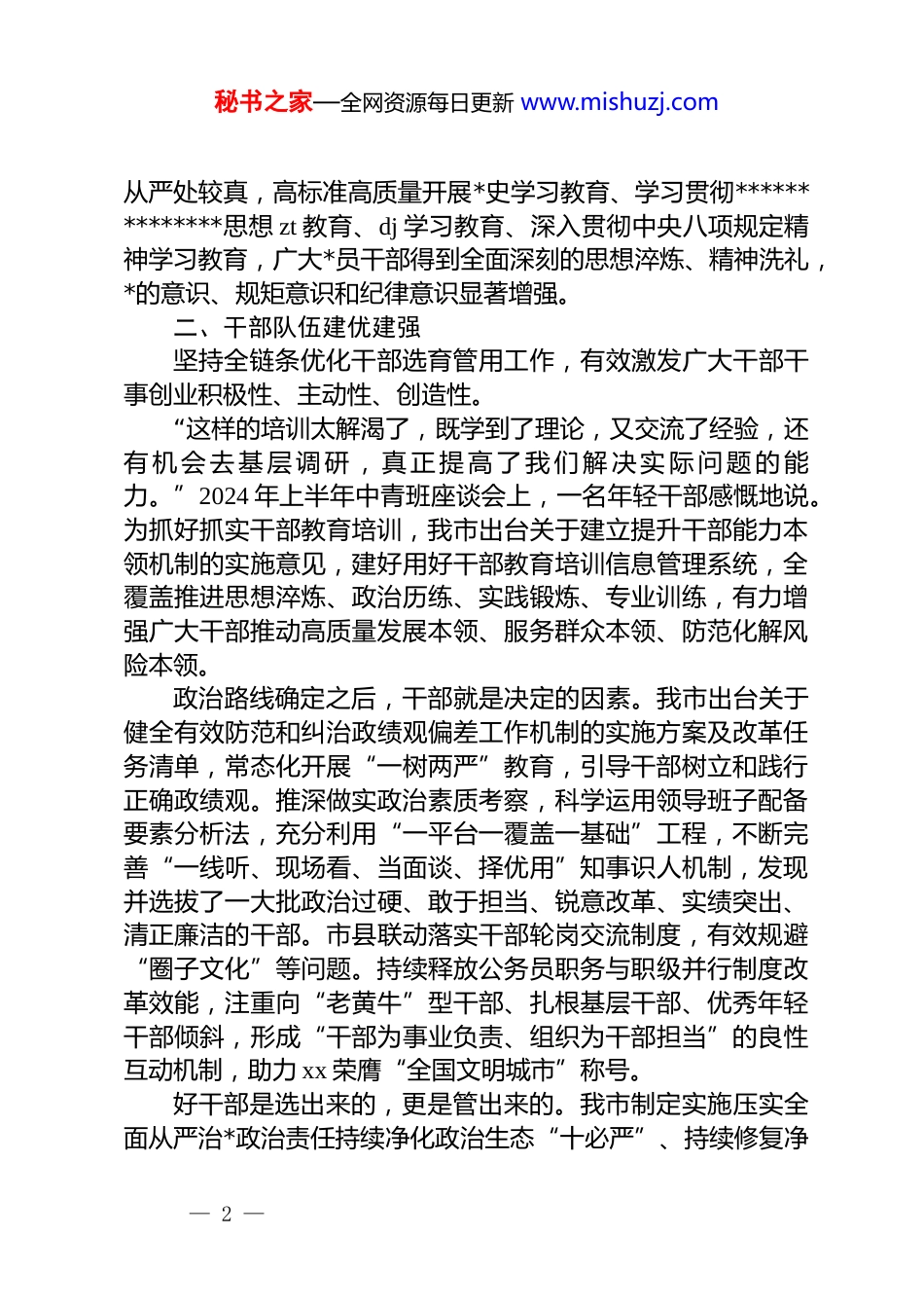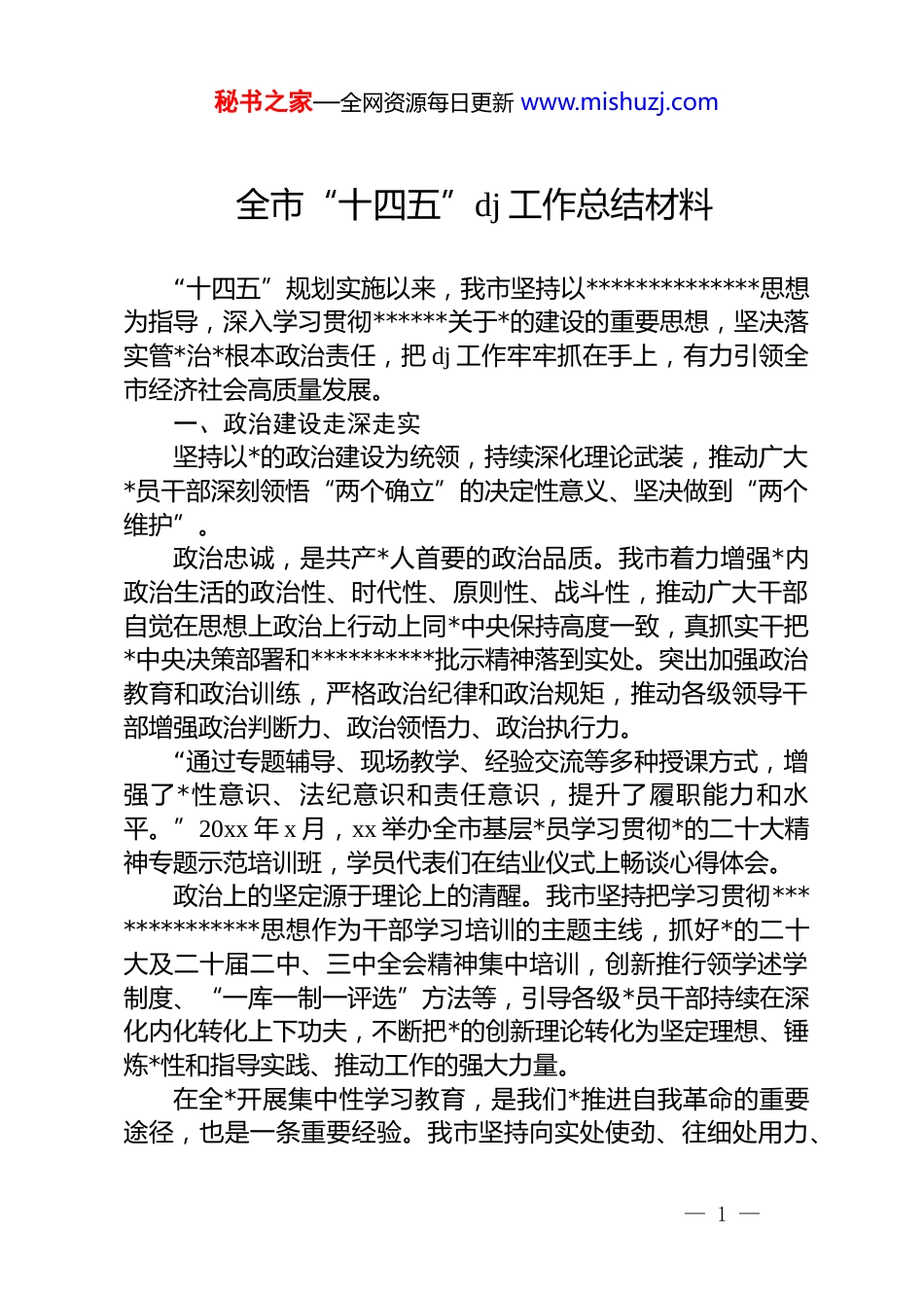 秘书之家—全网资源每日更新 www.mishuzj.com全市“十四五”dj 工作总结材料“十四五”规划实施以来,我市坚持以**************思想为指导,深入学习贯彻******关于*的建设的重要思想,坚决落实管*治*根本政治责任,把 dj 工作牢牢抓在手上,有力引领全市经济社会高质量发展。一、政治建设走深走实坚持以*的政治建设为统领,持续深化理论武装,推动广大*员干部深刻领悟“两个确立”的决定性意义、坚决做到“两个维护”。政治忠诚,是共产*人首要的政治品质。我市着力增强*内政治生活的政治性、时代性、原则性、战斗性,推动广大干部自觉在思想上政治上行动上同*中央保持高度一致,真抓实干把*中央决策部署和**********批示精神落到实处。突出加强政治教育和政治训练,严格政治纪律和政治规矩,推动各级领导干部增强政治判断力、政治领悟力、政治执行力。“通过专题辅导、现场教学、经验交流等多种授课方式,增强了*性意识、法纪意识和责任意识,提升了履职能力和水平。”20xx 年 x 月,xx 举办全市基层*员学习贯彻*的二十大精神专题示范培训班,学员代表们在结业仪式上畅谈心得体会。政治上的坚定源于理论上的清醒。我市坚持把学习贯彻**************思想作为干部学习培训的主题主线,抓好*的二十大及二十届二中、三中全会精神集中培训,创新推行领学述学制度、“一库一制一评选”方法等,引导各级*员干部持续在深化内化转化上下功夫,不断把*的创新理论转化为坚定理想、锤炼*性和指导实践、推动工作的强大力量。在全*开展集中性学习教育,是我们*推进自我革命的重要途径,也是一条重要经验。我市坚持向实处使劲、往细处用力、— 1 —秘书之家—全网资源每日更新 www.mishuzj.com从严处较真,高标准高质量开展*史学习教育、学习贯彻**************思想 zt 教育、dj 学习教育、深入贯彻中央八项规定精神学习教育,广大*员干部得到全面深刻的思想淬炼、精神洗礼,*的意识、规矩意识和纪律意识显著增强。二、干部队伍建优建强坚持全链条优化干部选育管用工作,有效激发广大干部干事创业积极性、主动性、创造性。“这样的培训太解渴了,既学到了理论,又交流了经验,还有 机 会 去 基 层 调 研 , 真 正 提 高 了 我 们 解 决 实 际 问 题 的 能力。”2024 年上半年中青班座谈会上,一名年轻干部感慨地说。为抓好抓实干部教育培训,我市出台关于建立提升干部能力本领机制的实施意见,建好用好干部教育培训信息管理系统,全覆盖推进思想淬炼、政治历练、实践锻炼、专业训练,有力增强广大干部推动高质量发展本领、服务群众本领、防范化解风险本领。政治路线确定之后,干部就是决定的因素。我市出台关于健全有效防范和纠治政绩观偏差工作机制的实施方案及改革任务清单,常态化开展“一树两严”教育,引导干部树立和践行正确政绩观。推深做实政治素质考察,科学运用领导班子配备要素分析法,充分利用“一平台一覆盖一基础”工程,不断完善“一线听、现场看、当面谈、择优用”知事识人机制,发现并选拔了一大批政治过硬、敢于担当、锐意改革、实绩突出、清正廉洁的干部。市县联动落实干部轮岗交流制度,有效规避“圈子文化”等问题。持续释放公务员职务与职级并行制度改革效能,注重向“老黄牛”型干部、扎根基层干部、优秀年轻干部倾斜,形成“干部为事业负责、组织为干部担当”的良性互动机制,助力 xx 荣膺“全国文明城市”称号。好干部是选出来的,更是管出来的。我市制定实施压实全面从严治*政治责任持续净化政治生态“十必严”、持续修复净— 2 —秘书之家—全网资源每日更新 www.mishuzj.com化优化政治生态重点任务清单等文件,着力管好关键人、管到关键处、管住关键事、管在关键时。健全干部监督信息共享机制,全覆盖开展选人用人专项检查,坚决纠治选人用人不正之风,新风正气不断充盈。三、基层 dj 提质增效坚持问题导向、目标导向、结果导向,高质量补短板、强弱项、固底板、扬优势,基层*组织的政治功能和组织功能不断增强。dj 引领基层治理持续深化——“树靠着围墙扎根,眼看墙就要倒了,好在邻长们及时反映,社区出面协调处...