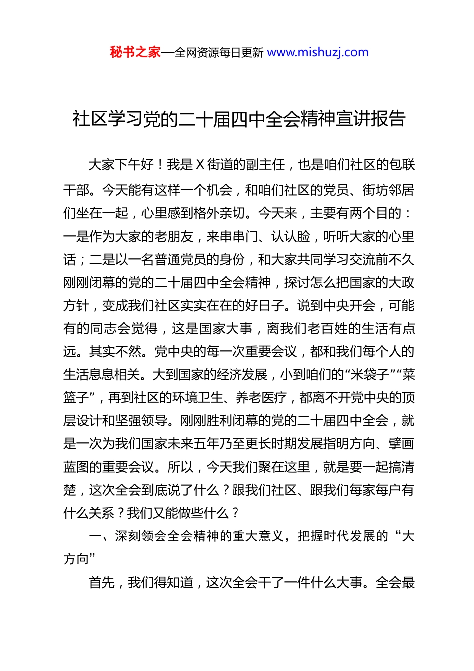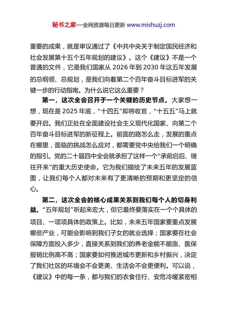 秘书之家—全网资源每日更新 www.mishuzj.com社区学习党的二十届四中全会精神宣讲报告大家下午好!我是 X 街道的副主任,也是咱们社区的包联干部。今天能有这样一个机会,和咱们社区的党员、街坊邻居们坐在一起,心里感到格外亲切。今天来,主要有两个目的:一是作为大家的老朋友,来串串门、认认脸,听听大家的心里话;二是以一名普通党员的身份,和大家共同学习交流前不久刚刚闭幕的党的二十届四中全会精神,探讨怎么把国家的大政方针,变成我们社区实实在在的好日子。说到中央开会,可能有的同志会觉得,这是国家大事,离我们老百姓的生活有点远。其实不然。党中央的每一次重要会议,都和我们每个人的“生活息息相关。大到国家的经济发展,小到咱们的 米袋子”“菜”篮子 ,再到社区的环境卫生、养老医疗,都离不开党中央的顶层设计和坚强领导。刚刚胜利闭幕的党的二十届四中全会,就是一次为我们国家未来五年乃至更长时期发展指明方向、擘画蓝图的重要会议。所以,今天我们聚在这里,就是要一起搞清楚,这次全会到底说了什么?跟我们社区、跟我们每家每户有什么关系?我们又能做些什么?一、深刻领会全会精神的重大意义,把握时代发展的“大方向”首先,我们得知道,这次全会干了一件什么大事。全会最秘书之家—全网资源每日更新 www.mishuzj.com重要的成果,就是审议通过了《中共中央关于制定国民经济和社会发展第十五个五年规划的建议》。这个《建议》不是一个普通的文件,它是我们国家从 2026 年到 2030 年这五年发展的总纲领、总规划,是我们向着第二个百年奋斗目标进军的关键一步的行动指南。为什么说它这么重要?第一,这次全会召开于一个关键的历史节点。大家想一想,现在是 2025“”“”年底, 十四五 即将收官, 十五五 马上就要开启。我们正处在全面建设社会主义现代化国家、向第二个百年奋斗目标进军的新征程上。前面的路怎么走,发展的重点在哪里,面临的挑战怎么应对,都需要党中央给我们一个明确“的指引。党的二十届四中全会就承担了这样一个 承前启后、继”往开来 的重大历史使命。它为我们描绘了未来五年的发展蓝图,让我们每个人都对未来有了更清晰的预期和更坚定的信心。第二,这次全会的核心成果关系到我们每个人的切身利益。“”五年规划 听起来宏大,但它最终要落实在一个个具体的项目、一项项具体的政策上。比如,未来五年国家要重点发展哪些产业,可能会影响到我们子女的就业选择;国家要在社会保障方面投入多少,直接关系到我们的养老金能不能涨、医保报销比例高不高;国家要如何推进城市更新和乡村振兴,决定了我们社区的环境会不会更美、生活会不会更便利。可以说,《建议》中的每一条,都与我们的衣食住行、安危冷暖紧密相秘书之家—全网资源每日更新 www.mishuzj.com连。第三,这次全会进一步彰显了我们制度的巨大优势。世界上很少有哪个国家、哪个政党能够像我们这样,制定出如此长远、系统、科学的发展规划,并且一茬接着一茬干,一张蓝图绘到底。这背后,就是中国特色社会主义制度的优越性,就是“”坚持党的全面领导这个 定海神针 。习近平总书记在全会上的重要讲话,高屋建瓴、思想深邃,是我们理解和把握全会精神“”“”的 纲 和 魂 为我们指明了前进的方向。正是因为有党的坚强领导,我们才能集中力量办大事,战胜各种风险挑战,推动经济社会持续健康发展。所以说,学习党的二十届四中全会精神,绝不是一句空话,而是帮助我们看清大势、明确方向,把我们个人的奋斗、社区的发展,融入国家发展的宏伟蓝图之中,让我们走得更稳、更有劲。二、深入解读全会精神的核心要义,明确未来发展的“路线图”搞清楚了全会的重大意义,我们再来一起看看,《建议》“”这份 路线图 里,到底画了些什么,和我们社区的发展有什么紧密的联系。虽然《建议》全文内容非常丰富,但我们可以从几个和我们基层感受最深的方面来理解。(一)高质量发展是首要任务,为社区繁荣注入新动能。全会《建议》肯定会继续强调,发展是硬道理,但新时代的发秘书之家—全网资源每日更新 www.mishuzj.com展,必须是高质量的发展。这意味着不能再...