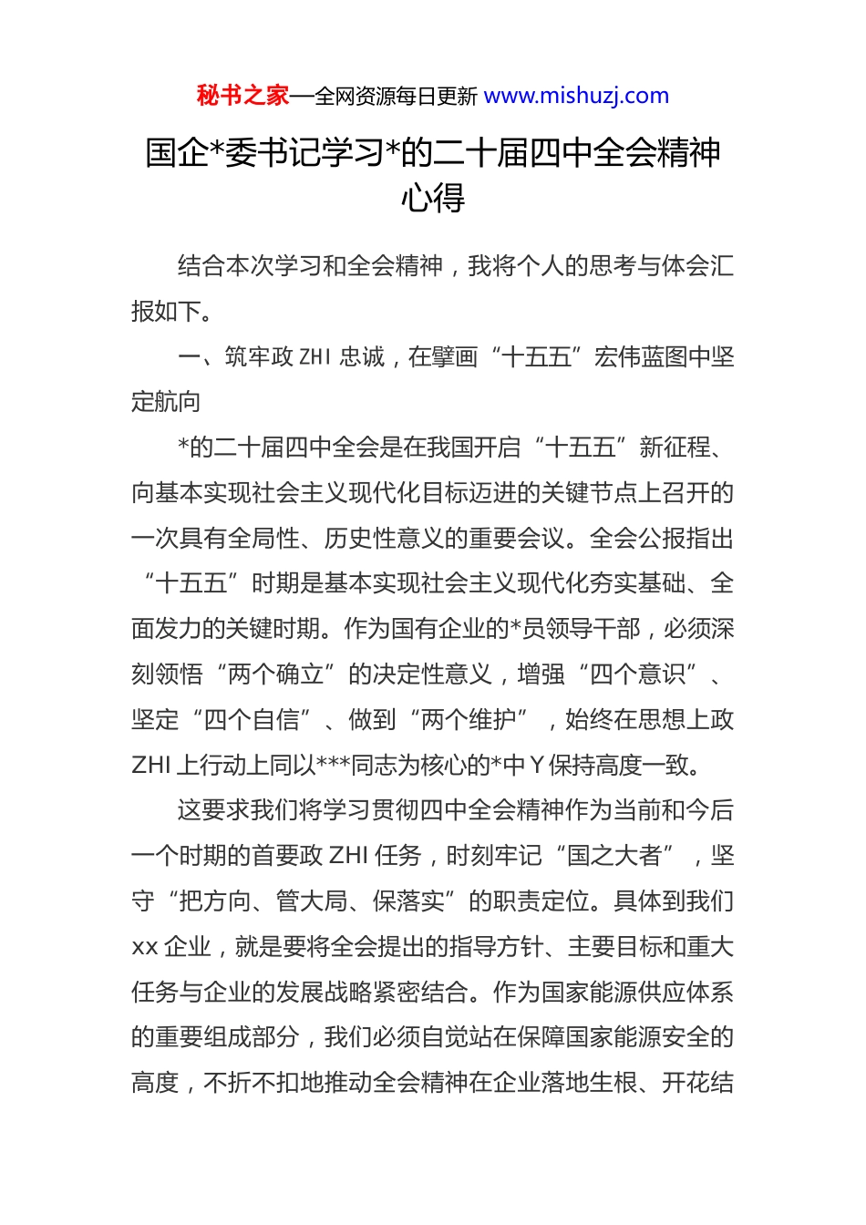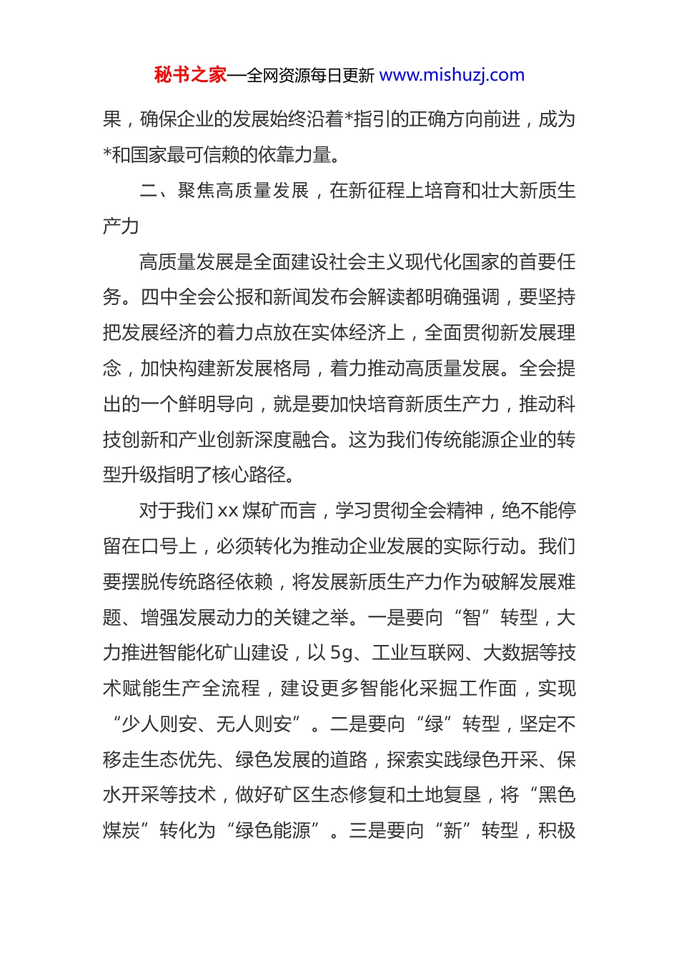 秘书之家—全网资源每日更新 www.mishuzj.com国企*委书记学习*的二十届四中全会精神心得结合本次学习和全会精神,我将个人的思考与体会汇报如下。一、筑牢政 ZHI 忠诚,在擘画“十五五”宏伟蓝图中坚定航向*的二十届四中全会是在我国开启“十五五”新征程、向基本实现社会主义现代化目标迈进的关键节点上召开的一次具有全局性、历史性意义的重要会议。全会公报指出“十五五”时期是基本实现社会主义现代化夯实基础、全面发力的关键时期。作为国有企业的*员领导干部,必须深刻领悟“两个确立”的决定性意义,增强“四个意识”、坚定“四个自信”、做到“两个维护”,始终在思想上政ZHI 上行动上同以***同志为核心的*中 Y 保持高度一致。这要求我们将学习贯彻四中全会精神作为当前和今后一个时期的首要政 ZHI 任务,时刻牢记“国之大者”,坚守“把方向、管大局、保落实”的职责定位。具体到我们xx 企业,就是要将全会提出的指导方针、主要目标和重大任务与企业的发展战略紧密结合。作为国家能源供应体系的重要组成部分,我们必须自觉站在保障国家能源安全的高度,不折不扣地推动全会精神在企业落地生根、开花结秘书之家—全网资源每日更新 www.mishuzj.com果,确保企业的发展始终沿着*指引的正确方向前进,成为*和国家最可信赖的依靠力量。二、聚焦高质量发展,在新征程上培育和壮大新质生产力高质量发展是全面建设社会主义现代化国家的首要任务。四中全会公报和新闻发布会解读都明确强调,要坚持把发展经济的着力点放在实体经济上,全面贯彻新发展理念,加快构建新发展格局,着力推动高质量发展。全会提出的一个鲜明导向,就是要加快培育新质生产力,推动科技创新和产业创新深度融合。这为我们传统能源企业的转型升级指明了核心路径。对于我们 xx 煤矿而言,学习贯彻全会精神,绝不能停留在口号上,必须转化为推动企业发展的实际行动。我们要摆脱传统路径依赖,将发展新质生产力作为破解发展难题、增强发展动力的关键之举。一是要向“智”转型,大力推进智能化矿山建设,以 5g、工业互联网、大数据等技术赋能生产全流程,建设更多智能化采掘工作面,实现“少人则安、无人则安”。二是要向“绿”转型,坚定不移走生态优先、绿色发展的道路,探索实践绿色开采、保水开采等技术,做好矿区生态修复和土地复垦,将“黑色煤炭”转化为“绿色能源”。三是要向“新”转型,积极秘书之家—全网资源每日更新 www.mishuzj.com延伸产业链、提升价值链,探索煤炭清洁高效利用的新路径,在煤基新材料、煤化工等领域寻求突破,将资源优势转化为产业优势和经济优势,为企业高质量发展注入源源不断的内生动力。三、坚持统筹兼顾,在发展与安全的良性互动中行稳致远四中全会深刻分析了我国发展面临的内外部环境,强调要增强忧患意识,坚持底线思维,统筹好发展和安全两件大事。对于 xx 行业来说,安全是天字号的大事,是企业生存发展的基石,也是对职工生命健康、对社会和谐稳定应尽的最大责任。全会强调“严格落实安全生产责任”,这为我们的安全工作敲响了警钟、划出了红线。我们必须以“时时放心不下”的责任感,将安全生产的神经绷得更紧、责任压得更实。一方面,要持续完善安全生产责任体系和风险分级管控、隐患排查 ZHI 理双重预防机制,运用智能化手段提升安全监测预警能力,坚决杜绝重特大事故发生。另一方面,要将“大安全”理念贯穿企业运营全过程。这不仅包括生产安全,还包括经营安全环保安全、意识形态安全等。在当前复杂严峻的经济形势下,要有效防范化解经营风险,确保企业健康平稳运行。同时,要牢牢掌握意识形态工作领导权,筑牢职工思想防秘书之家—全网资源每日更新 www.mishuzj.com线,凝聚起同心同德、共促发展的强大正能量,切实以一域之稳服务全局之安。四、强化 dj 引领,在深化改革创新中激发组织活力办好中国的事情,关键在*。全会《建议》明确提出要坚持和加强*的全面领导。作为国有企业,坚持*的领导、加强*的建设是我们的“根”和“魂”。我们 xx 煤矿在过去的发展中,正是得益于 dj 工作与生产经营的深度融合,才取得了显著成绩。立足新起点...