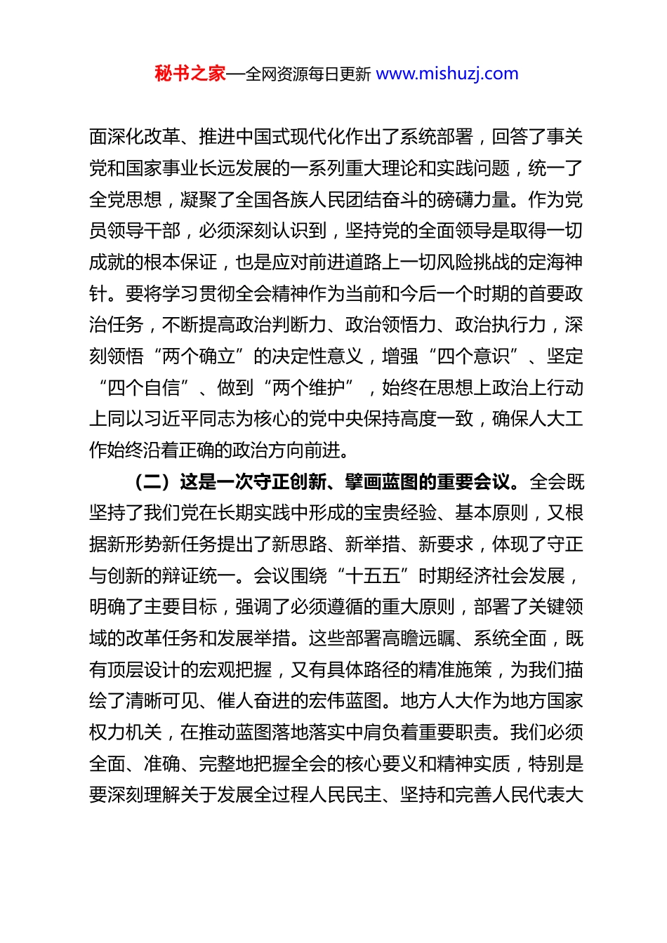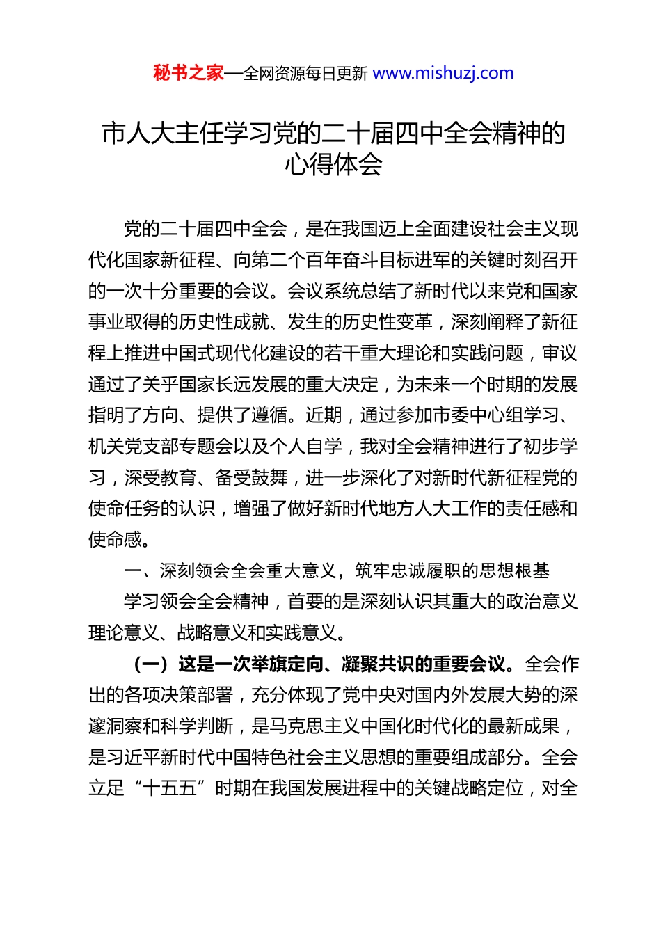 秘书之家—全网资源每日更新 www.mishuzj.com市人大主任学习党的二十届四中全会精神的心得体会党的二十届四中全会,是在我国迈上全面建设社会主义现代化国家新征程、向第二个百年奋斗目标进军的关键时刻召开的一次十分重要的会议。会议系统总结了新时代以来党和国家事业取得的历史性成就、发生的历史性变革,深刻阐释了新征程上推进中国式现代化建设的若干重大理论和实践问题,审议通过了关乎国家长远发展的重大决定,为未来一个时期的发展指明了方向、提供了遵循。近期,通过参加市委中心组学习、机关党支部专题会以及个人自学,我对全会精神进行了初步学习,深受教育、备受鼓舞,进一步深化了对新时代新征程党的使命任务的认识,增强了做好新时代地方人大工作的责任感和使命感。一、深刻领会全会重大意义,筑牢忠诚履职的思想根基学习领会全会精神,首要的是深刻认识其重大的政治意义理论意义、战略意义和实践意义。(一)这是一次举旗定向、凝聚共识的重要会议。全会作出的各项决策部署,充分体现了党中央对国内外发展大势的深邃洞察和科学判断,是马克思主义中国化时代化的最新成果,是习近平新时代中国特色社会主义思想的重要组成部分。全会立足“十五五”时期在我国发展进程中的关键战略定位,对全秘书之家—全网资源每日更新 www.mishuzj.com面深化改革、推进中国式现代化作出了系统部署,回答了事关党和国家事业长远发展的一系列重大理论和实践问题,统一了全党思想,凝聚了全国各族人民团结奋斗的磅礴力量。作为党员领导干部,必须深刻认识到,坚持党的全面领导是取得一切成就的根本保证,也是应对前进道路上一切风险挑战的定海神针。要将学习贯彻全会精神作为当前和今后一个时期的首要政治任务,不断提高政治判断力、政治领悟力、政治执行力,深刻领悟“两个确立”的决定性意义,增强“四个意识”、坚定“四个自信”、做到“两个维护”,始终在思想上政治上行动上同以习近平同志为核心的党中央保持高度一致,确保人大工作始终沿着正确的政治方向前进。(二)这是一次守正创新、擘画蓝图的重要会议。全会既坚持了我们党在长期实践中形成的宝贵经验、基本原则,又根据新形势新任务提出了新思路、新举措、新要求,体现了守正与创新的辩证统一。会议围绕“十五五”时期经济社会发展,明确了主要目标,强调了必须遵循的重大原则,部署了关键领域的改革任务和发展举措。这些部署高瞻远瞩、系统全面,既有顶层设计的宏观把握,又有具体路径的精准施策,为我们描绘了清晰可见、催人奋进的宏伟蓝图。地方人大作为地方国家权力机关,在推动蓝图落地落实中肩负着重要职责。我们必须全面、准确、完整地把握全会的核心要义和精神实质,特别是要深刻理解关于发展全过程人民民主、坚持和完善人民代表大秘书之家—全网资源每日更新 www.mishuzj.com会制度、全面推进依法治国等重大部署,将其融入人大履职的全过程、各方面,确保党的主张通过法定程序成为国家意志,确保党组织推荐的人选通过法定程序成为国家政权机关的领导人员,善于使党的主张通过法定程序成为人民群众的自觉行动。(三)这是一次砥砺奋进、激发担当的重要会议。全会向全党全国各族人民发出了奋进新征程、建功新时代的动员令。会议深刻分析了当前面临的机遇和挑战,强调要增强忧患意识,坚持底线思维,敢于斗争、善于斗争,同时也为我们注入了强大的信心和动力。学习全会精神,让我更加深刻地体会到,新时代的伟大成就是党和人民一道拼出来、干出来、奋斗出来的。空谈误国、实干兴邦。对于人大工作而言,贯彻落实全会精神,关键在行动,最终看效果。我们必须拿出“闯”的精神、“创”的劲头、“干”的作风,把学习成果转化为推动人大工作高质量发展、服务地方经济社会发展大局的实际成效,以人大的依法履职和有效作为,为谱写中国式现代化 XX 篇章贡献智慧和力量。二、准确把握全会核心要义,明确服务大局的履职方向全会内涵丰富、博大精深,必须反复学、深入思、联系实际悟。结合人大工作实际,我认为要着重把握以下几个方面的核心内容:(一)牢牢把握“中国式现代化”这个最大的政治。全会对中国式现代化进行了...