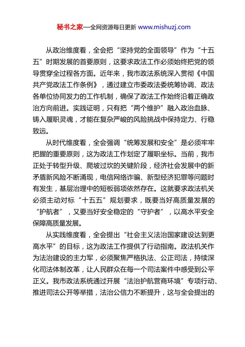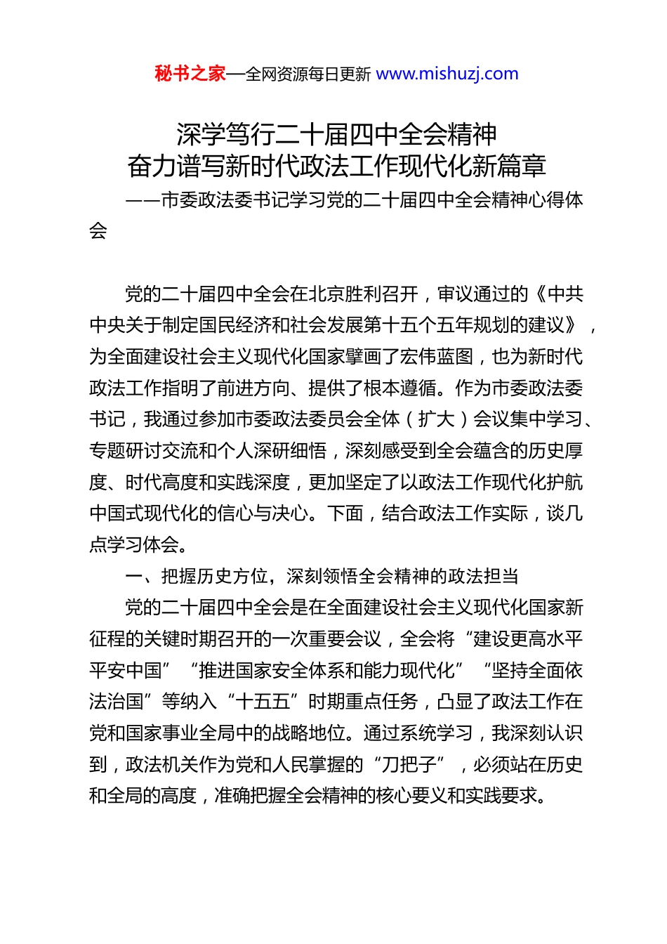 秘书之家—全网资源每日更新 www.mishuzj.com深学笃行二十届四中全会精神奋力谱写新时代政法工作现代化新篇章——市委政法委书记学习党的二十届四中全会精神心得体会党的二十届四中全会在北京胜利召开,审议通过的《中共中央关于制定国民经济和社会发展第十五个五年规划的建议》,为全面建设社会主义现代化国家擘画了宏伟蓝图,也为新时代政法工作指明了前进方向、提供了根本遵循。作为市委政法委书记,我通过参加市委政法委员会全体(扩大)会议集中学习、专题研讨交流和个人深研细悟,深刻感受到全会蕴含的历史厚度、时代高度和实践深度,更加坚定了以政法工作现代化护航中国式现代化的信心与决心。下面,结合政法工作实际,谈几点学习体会。一、把握历史方位,深刻领悟全会精神的政法担当党的二十届四中全会是在全面建设社会主义现代化国家新征程的关键时期召开的一次重要会议,全会将“建设更高水平平安中国”“推进国家安全体系和能力现代化”“坚持全面依法治国”等纳入“十五五”时期重点任务,凸显了政法工作在党和国家事业全局中的战略地位。通过系统学习,我深刻认识到,政法机关作为党和人民掌握的“刀把子”,必须站在历史和全局的高度,准确把握全会精神的核心要义和实践要求。秘书之家—全网资源每日更新 www.mishuzj.com从政治维度看,全会把“坚持党的全面领导”作为“十五五”时期发展的首要原则,这要求政法工作必须始终把党的领导贯穿全过程各方面。近年来,我市政法系统深入贯彻《中国共产党政法工作条例》,通过建立市委政法委统筹协调、政法各单位协同发力的工作机制,确保了政法工作始终沿着正确政治方向前进。实践证明,只有把“两个维护”融入政治血脉、铸入履职灵魂,才能在复杂严峻的风险挑战中保持定力、行稳致远。从时代维度看,全会强调“统筹发展和安全”是必须牢牢把握的重要原则,这为政法工作划定了履职坐标。当前,我市正处于转型升级、爬坡过坎的关键阶段,经济社会发展中的新矛盾新风险不断涌现,电信网络诈骗、新型经济犯罪等问题时有发生,基层治理中的短板弱项依然存在。这就要求政法机关必须主动对标“十五五”规划要求,既要当好高质量发展的“护航者”,又要当好安全稳定的“守护者”,以高水平安全保障高质量发展。从实践维度看,全会提出“社会主义法治国家建设达到更高水平”的目标,这为政法工作提供了行动指南。政法机关作为法治建设的主力军,必须聚焦严格执法、公正司法,持续深化司法体制改革,让人民群众在每一个司法案件中感受到公平正义。我市政法系统通过开展“法治护航营商环境”专项行动、推进司法公开等举措,法治公信力不断提升,这与全会提出的秘书之家—全网资源每日更新 www.mishuzj.com法治建设要求高度契合,也为下一步工作积累了宝贵经验。二、聚焦主责主业,以全会精神引领政法工作提质增效学习贯彻全会精神,关键在于转化为推动政法工作的强大动力。结合市委政法委员会全体(扩大)会议部署和我市实际,我们将重点抓好五大任务落实,以政法工作现代化助力中国式现代化建设。(一)坚持党建引领,筑牢政治忠诚根基全会强调“坚持党的全面领导是推进中国式现代化的根本保证”。政法机关必须把党的政治建设摆在首位,持续深化理论武装,将学习贯彻习近平新时代中国特色社会主义思想、党的二十大精神和二十届四中全会精神结合起来,通过政治轮训、专题研讨、基层宣讲等形式,引导全市政法干警深刻领悟“两个确立”的决定性意义,坚决做到“两个维护”。健全完善市委政法委政治督察、执法监督等机制,加强对政法各单位党组织建设的指导,推动党建与业务深度融合,确保政法队伍始终绝对忠诚、绝对纯洁、绝对可靠。借鉴浙江省政法系统“党建+业务”融合模式,建立“政法干警政治素质档案”,将政治表现与评优评先、职级晋升直接挂钩,倒逼政治责任落实。(二)服务发展大局,彰显政法保障效能全会指出“现代化产业体系是中国式现代化的物质技术基础”“强大国内市场是中国式现代化的战略依托”。政法机关必须主动对接市委中心工作,找准服务大局的结合点和发力点。秘书之家—全网资源每日更新 www.mishuzj.com一...