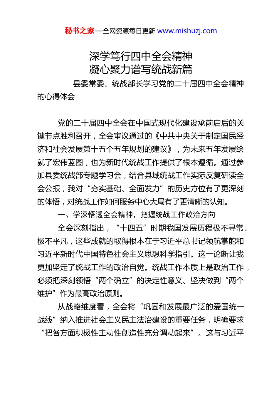 秘书之家—全网资源每日更新 www.mishuzj.com深学笃行四中全会精神凝心聚力谱写统战新篇——县委常委、统战部长学习党的二十届四中全会精神的心得体会党的二十届四中全会在中国式现代化建设承前启后的关键节点胜利召开,全会审议通过的《中共中央关于制定国民经济和社会发展第十五个五年规划的建议》,为未来五年发展绘就了宏伟蓝图,也为新时代统战工作提供了根本遵循。通过参加县委统战部专题学习会,结合县域统战工作实际反复研读全会公报,我对“夯实基础、全面发力”的历史方位有了更深刻的体悟,对统战工作如何服务中心大局有了更清晰的认知。一、学深悟透全会精神,把握统战工作政治方向全会深刻指出,“十四五”时期我国发展历程极不寻常、极不平凡,这些成就的取得根本在于习近平总书记领航掌舵和习近平新时代中国特色社会主义思想科学指引。这一论断让我更加坚定了统战工作的政治自觉。统战工作本质上是政治工作,必须把深刻领悟“两个确立”的决定性意义、坚决做到“两个维护”作为最高政治原则。从战略维度看,全会将“巩固和发展最广泛的爱国统一战线”纳入推进社会主义民主法治建设的重要任务,明确要求“把各方面积极性主动性创造性充分调动起来”。这与习近平秘书之家—全网资源每日更新 www.mishuzj.com总书记关于“统一战线是凝聚人心、汇聚力量的强大法宝”的重要论述一脉相承,凸显了统战工作在“十五五”时期的独特价值。当前我县正处于转型升级的攻坚期,民营经济占 GDP 比重达 62%,少数民族人口分布在 8 个乡镇,党外知识分子队伍不断壮大,做好统战工作就是筑牢发展根基。从实践维度看,全会提出的“高质量发展取得显著成效”“社会文明程度明显提升”等七大目标,与统战工作息息相关。无论是构建现代化产业体系需要民营经济赋能,还是建设生育友好型社会需要凝聚社会共识,都离不开统一战线的桥梁纽带作用。我们必须把全会精神转化为统战工作的思维方法,始终围绕中心、服务大局。二、锚定县域发展实际,找准统战工作发力坐标全会强调“制定和实施好‘十五五’规划,就能为 2035年基本实现社会主义现代化奠定更加坚实的基础”。统战工作必须立足县域实际,在服务“十五五”开局中找准定位、彰显作为。(一)在凝聚思想共识上持续用力。针对我县统战成员构成多元的特点,我们将构建“分层分类+精准滴灌”的学习体系:组织民营企业家专题学习全会关于“建设现代化产业体系”的部署,邀请党外知识分子解读“科技自立自强”政策,向民族宗教界人士宣讲“国家安全屏障更加巩固”的要求。通过打造“同心讲堂”“线上微课堂”等载体,推动全会精神进秘书之家—全网资源每日更新 www.mishuzj.com商会、进宗教场所、进党外人士工作室,实现思想引领全覆盖。(二)在服务高质量发展上精准发力。全会把“建设现代化产业体系,巩固壮大实体经济根基”摆在突出位置,这正是我县统战工作的主攻方向。我们将实施“统战赋能民营经济”行动:建立“统战部+工商联+职能部门”协同机制,针对我县装备制造、农产品加工等支柱产业,组织党外专家开展“技术攻关会诊”;落实“亲清政商关系”清单,每季度召开民营企业家座谈会,推动解决融资难、用工荒等实际问题。同时依托异地商会平台,开展“乡情招商”“以商引商”,助力构建“本地企业+在外乡贤”的发展共同体。(三)在促进社会和谐上协同发力。围绕全会“完善社会治理体系”的要求,我们将重点抓好三项工作:深化民族团结进步创建,实施“少数民族特色产业提升工程”,助力 3 个民族村发展特色种植、乡村旅游;规范宗教活动场所管理,开展“安全隐患清零”专项行动,落实“三级网络两级责任制”;健全党外人士建言献策机制,建立“重点提案跟踪督办”制度,推动统战智慧转化为治理效能。三、强化务实举措落地,彰显统战工作时代价值学习贯彻全会精神,关键在落实、成效看行动。我们将以“钉钉子”精神推动三大行动落地见效,把制度优势转化为治理效能。(一)实施“凝心铸魂”行动,筑牢政治共识根基。制秘书之家—全网资源每日更新 www.mishuzj.com定《全县统一战线学习贯彻四中全会精神实施方案》,开展“...